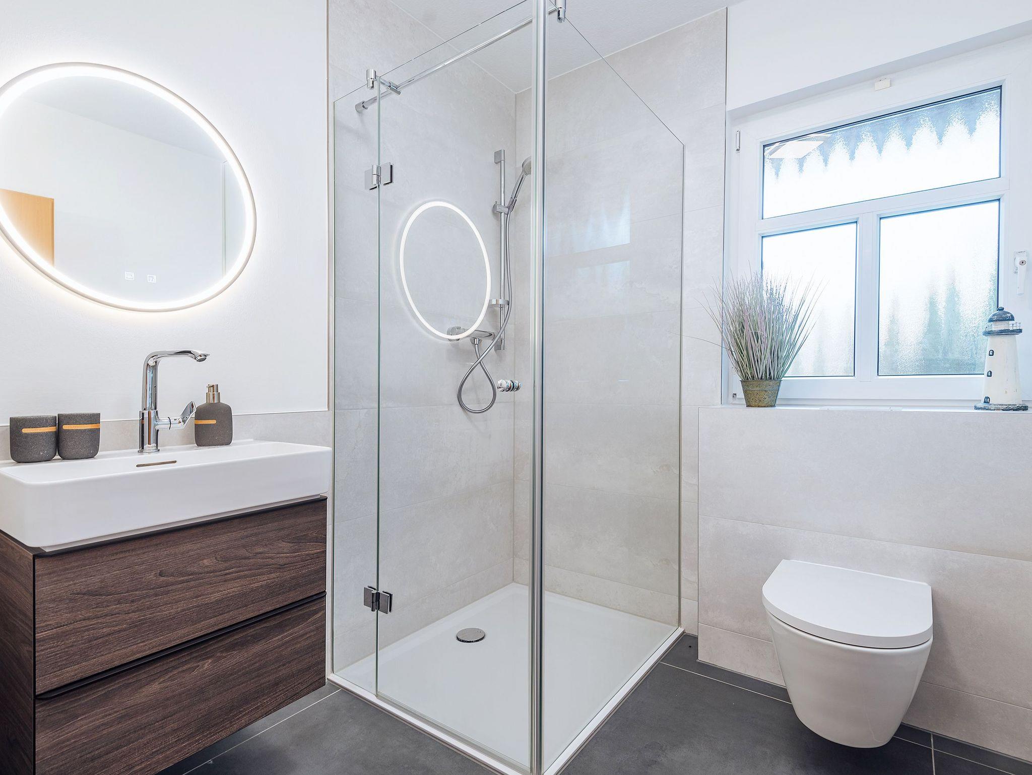 - Walk-In-Dusche im EG mit Handtuchheizkörper, Waschtisch, WC, Fußbodenheizung