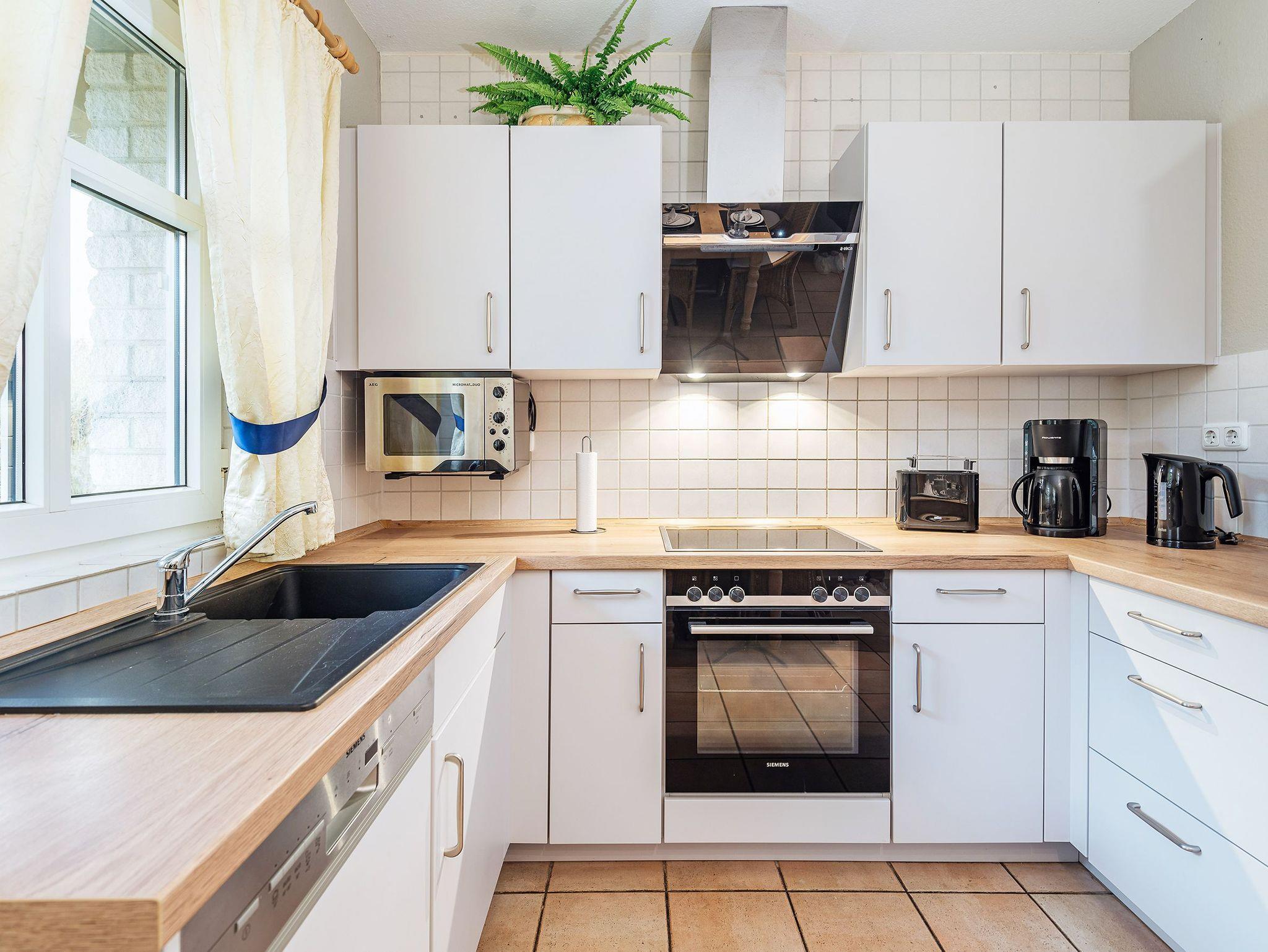 - Einbauküche mit Cerankochfeld, Backofen, Mikrowelle, Wasserkocher, Toaster, Kühlschrank mit Gefrierfach, Geschirrspüler