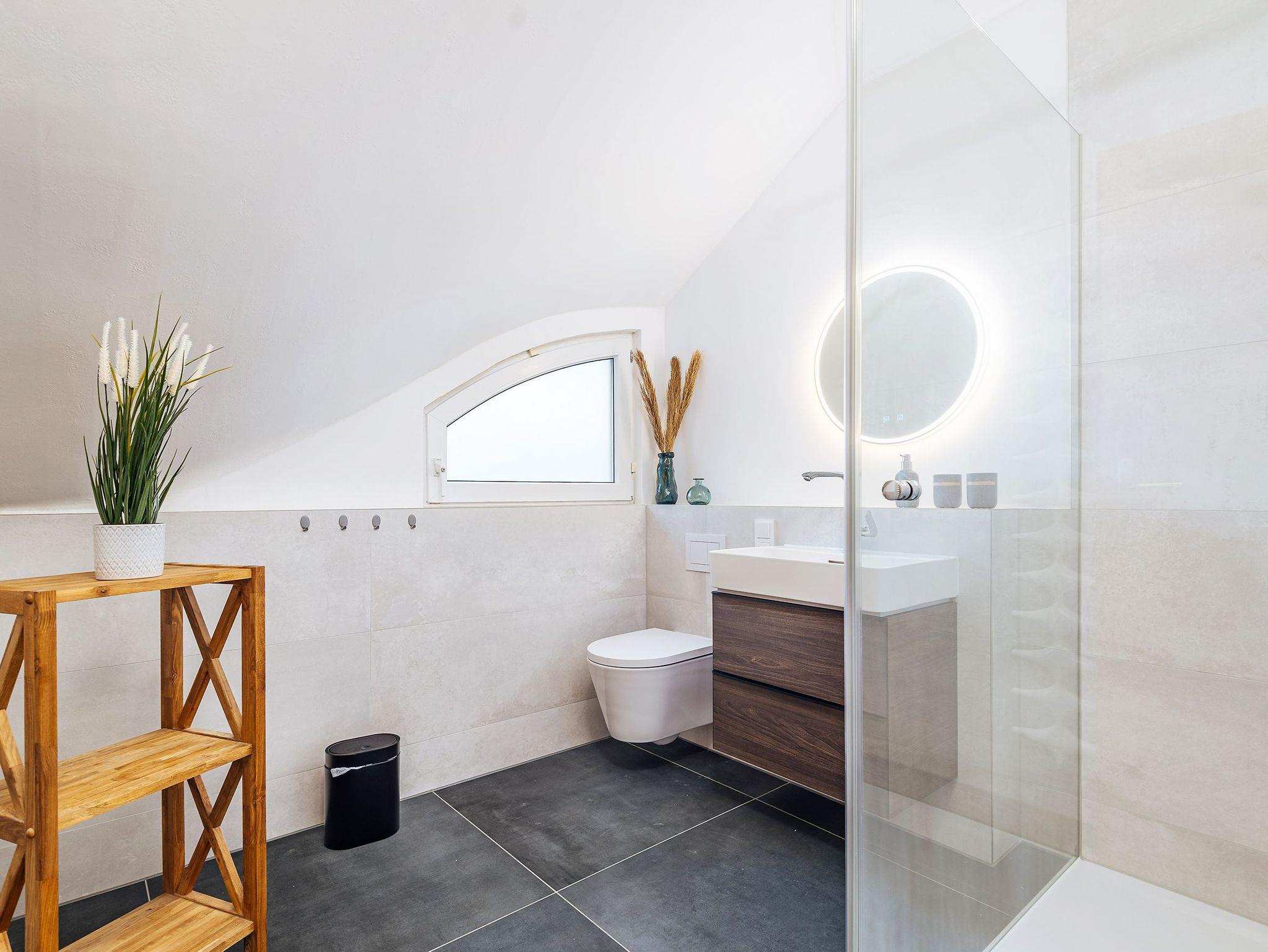 - Duschbad im OG mit Waschtisch, Handtuchheizkörper, WC