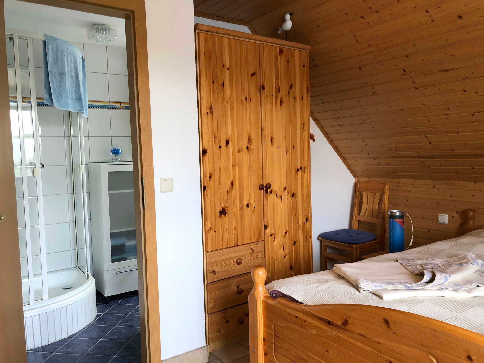 Das Schlafzimmer ist mit einem Doppelbett (200 x 180) mit verstellbaren Holzlattenrosten ausgestattet sowie einem Kleiderschrank und zwei Nachttischen, Das Badezimmer hat WC und Dusche.
