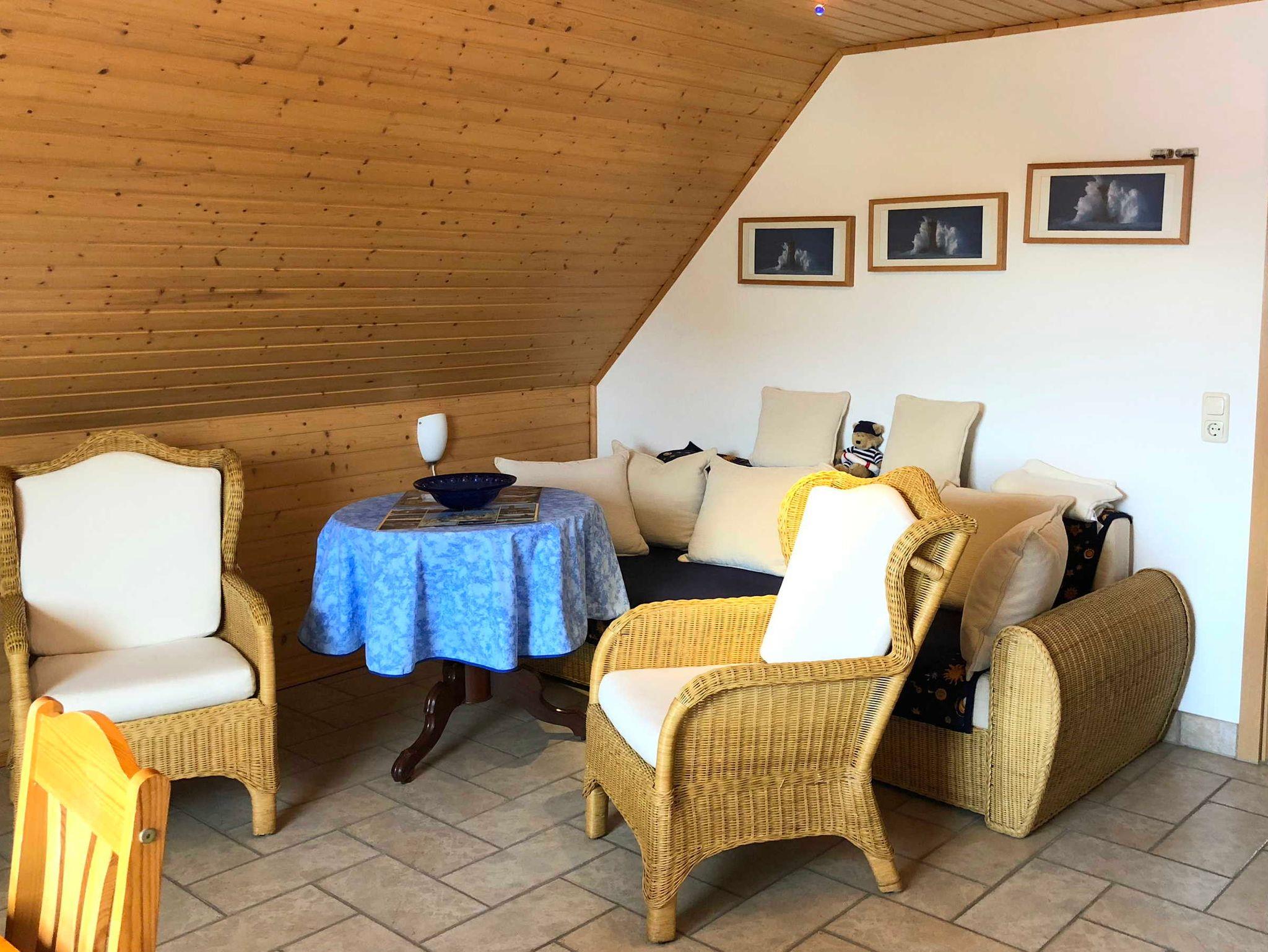 Die Küchenzeile ist u.a ausgestattet mit Kühlschrank und Gefrierfach, Kaffeemaschine, Toaster, Wasserkocher etc. Die Wohnküche bietet Ihnen einen Essplatz für vier Personen, Korbsessel, ein Schlafsofa, TV und Radio.