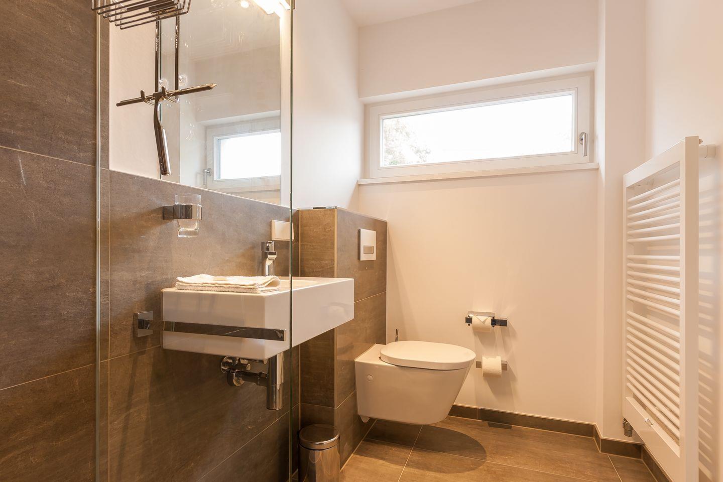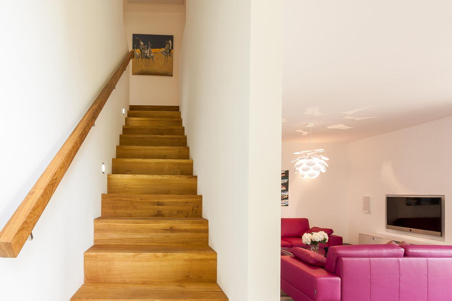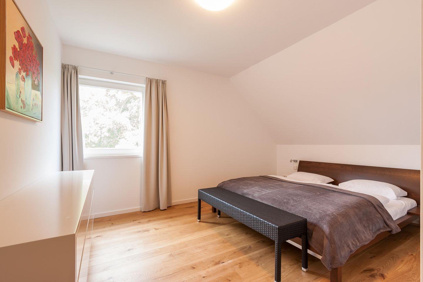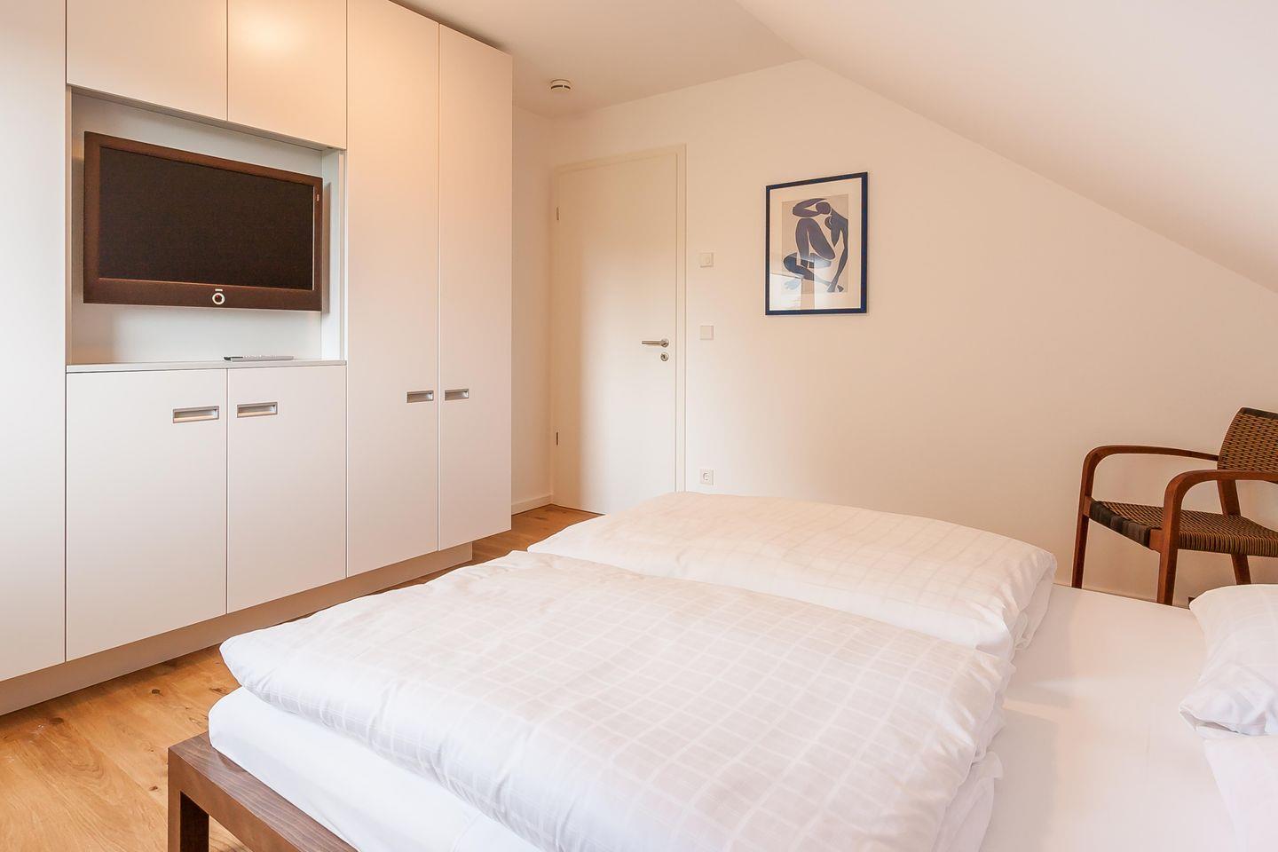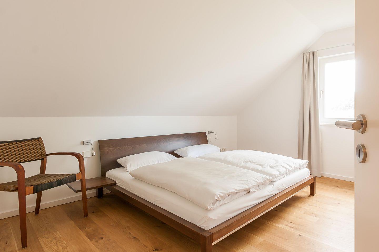 Im Zweienhaus trifft moderne Architektur auf eine stilvolle Innenausstattung. Dank des hochwertigen Interieurs lässt die Doppelhaushälfte keine Wünsche offen und ist Garant für einen rundum gelungenen Urlaub. Du gelangst über den großzügigen Eingangsbereich direkt in den modernen Wohnraum, der über eine hochwertige Ledersitzgruppe verfügt. Der lichtdurchflutete Essbereich mit wunderbarem Ausblick ins Grüne und ein Kaminofen fügen sich harmonisch ein. Weiterhin befindet sich im Erdgeschoss der offene und sehr gut ausgestattete Küchenbereich, der etwas vom Wohnbereich separiert ist. Ein Bad mit Dusche/WC und ein Hauswirtschaftsraum mit Waschtrockner sind ebenfalls auf dieser Etage untergebracht. Das Dachgeschoss beherbergt zwei Schlafzimmer, die jeweils mit einem Doppelbett und mit geräumigen Einbauschränken ausgestattet sind. Eines der beiden Schlafzimmer bietet ein zusätzliches TV-Gerät. Das Badezimmer mit Dusche/WC sowie ein kleiner Wellnessbereich mit eigener Sauna sorgen für Wohn- und Wohlfühlkomfort zu jeder Jahreszeit.