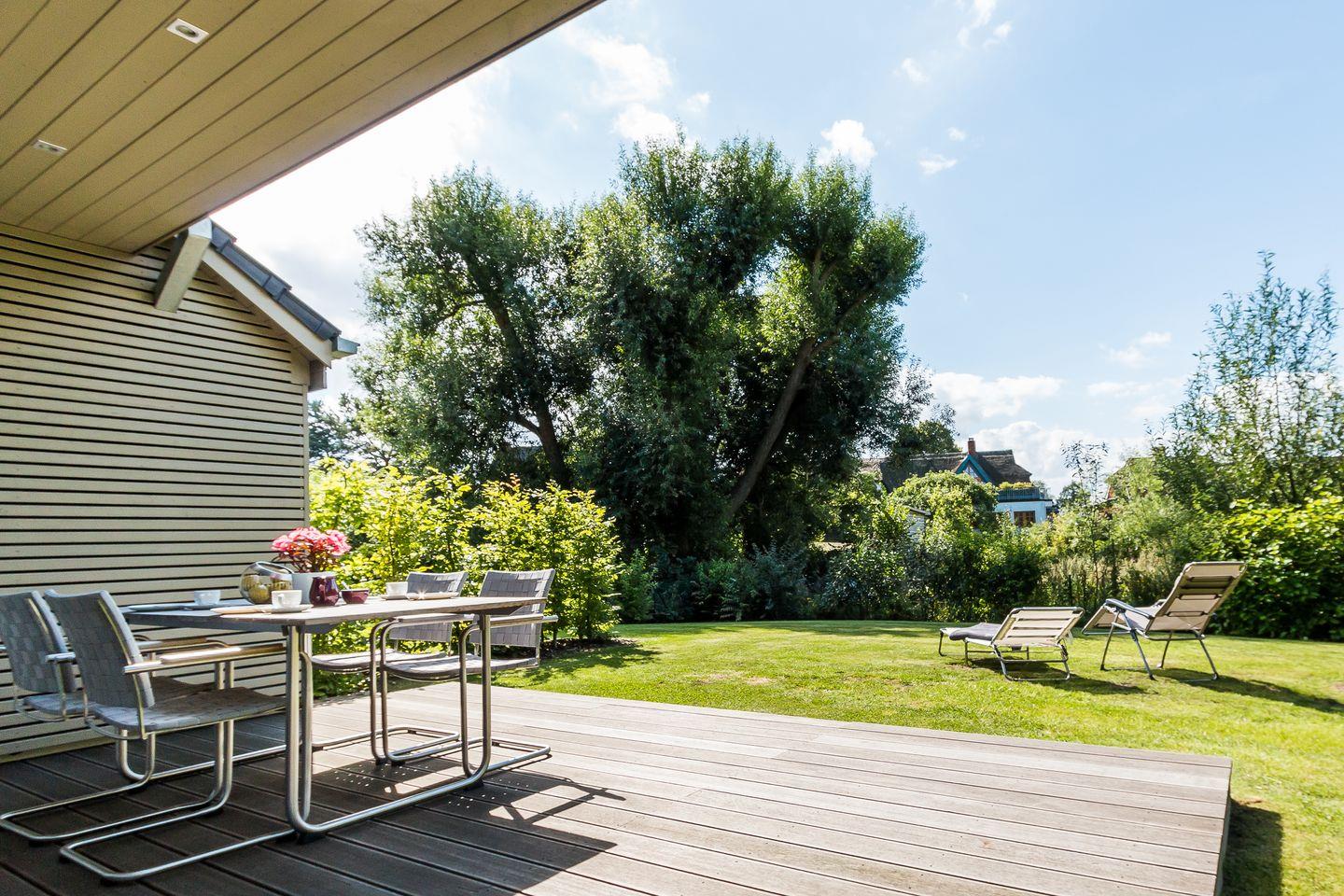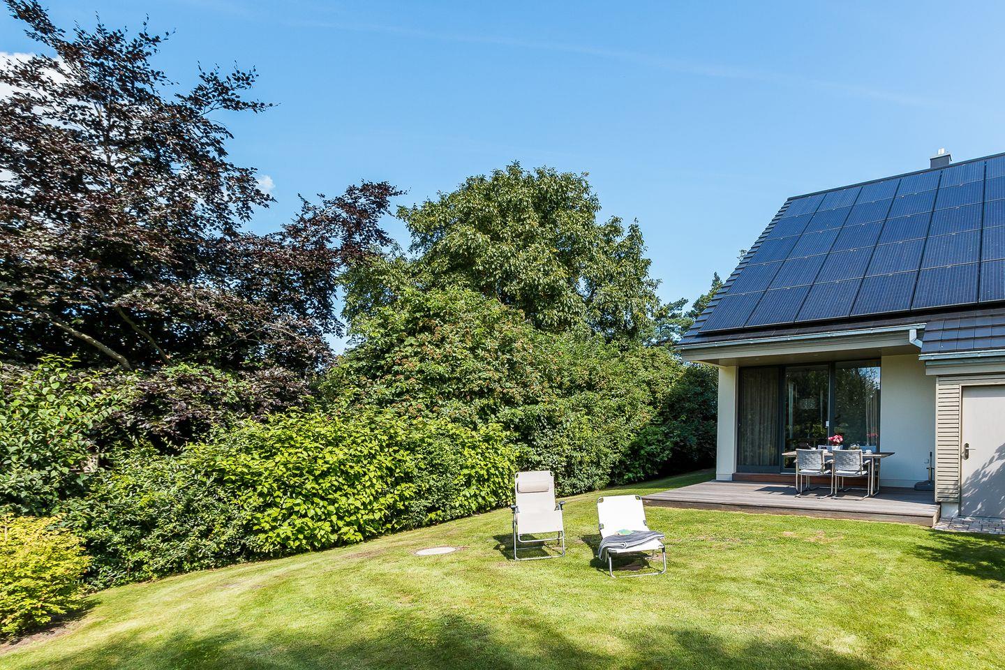 Die großzügige und teilweise überdachte Terrasse mit angrenzender Rasenfläche runden das Gesamtbild ab. Hier kannst du genussvoll in den Tag starten oder die lauen Sommernächte mit einem Grillabend und einem guten Glas Wein ausklingen lassen. Sonnenliegen, ein Grill, ein abschließbarer Fahrradschuppen und ein PKW-Stellplatz runden den Außenbereich ab.