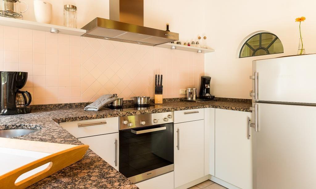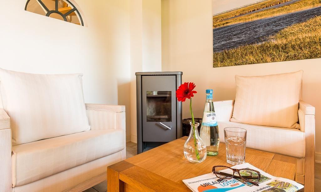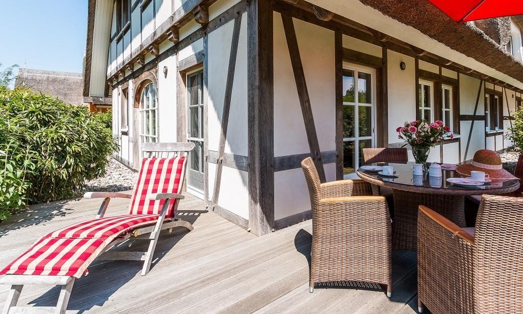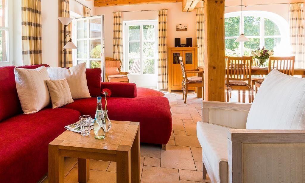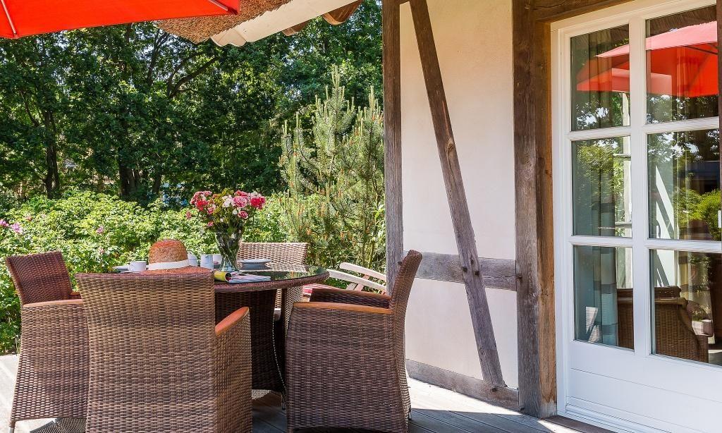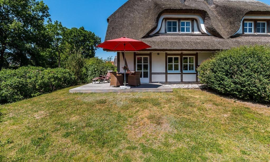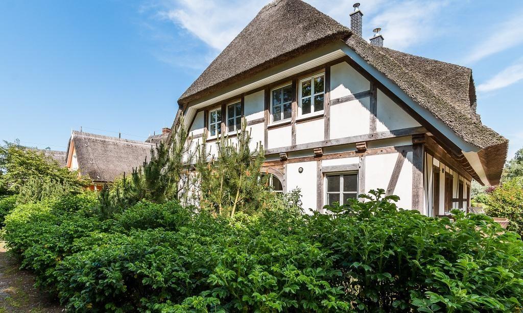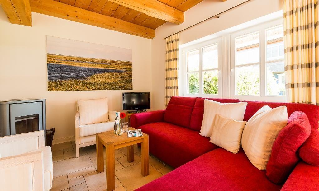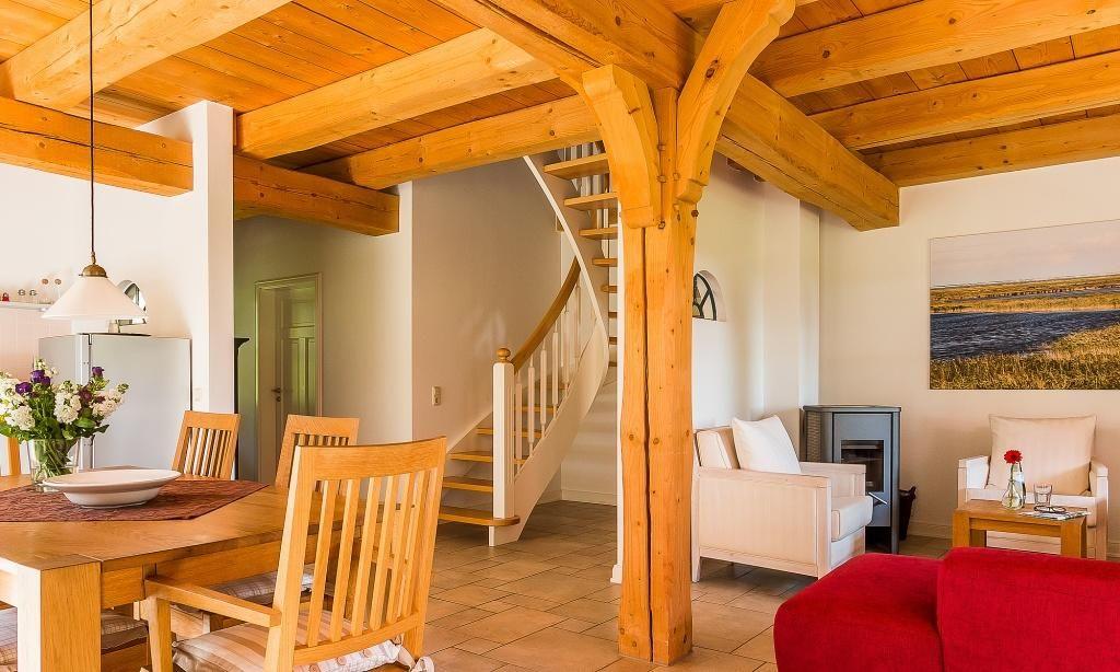 Im Erdgeschoss erwartet dich ein großzügiger und sonnendurchfluteter Wohnbereich, der mit seiner Holzständerbauweise und offenem Fachwerk für besondere Wohnatmosphäre sorgt. Mit seiner gemütlichen Couch, der offenen Küche und dem geselligen Essbereich wird der Wohnbereich schnell zum Mittelpunkt des Hauses. Weiterhin befinden sich im Erdgeschoss ein Gäste-WC sowie ein Hauswirtschaftsraum. Über eine wunderschöne Echtholztreppe gelangst du ins Obergeschoss. Hier befinden sich die drei Schlafzimmer, die jeweils mit einem Doppelbett ausgestattet sind. Ein großes Bad mit Badewanne und Dusche/WC liegt ebenfalls auf dieser Etage. Ankommen und sofort Urlaubs-Feeling spüren - das geht mit diesem wundervollen Ferienhaus unter Reet.