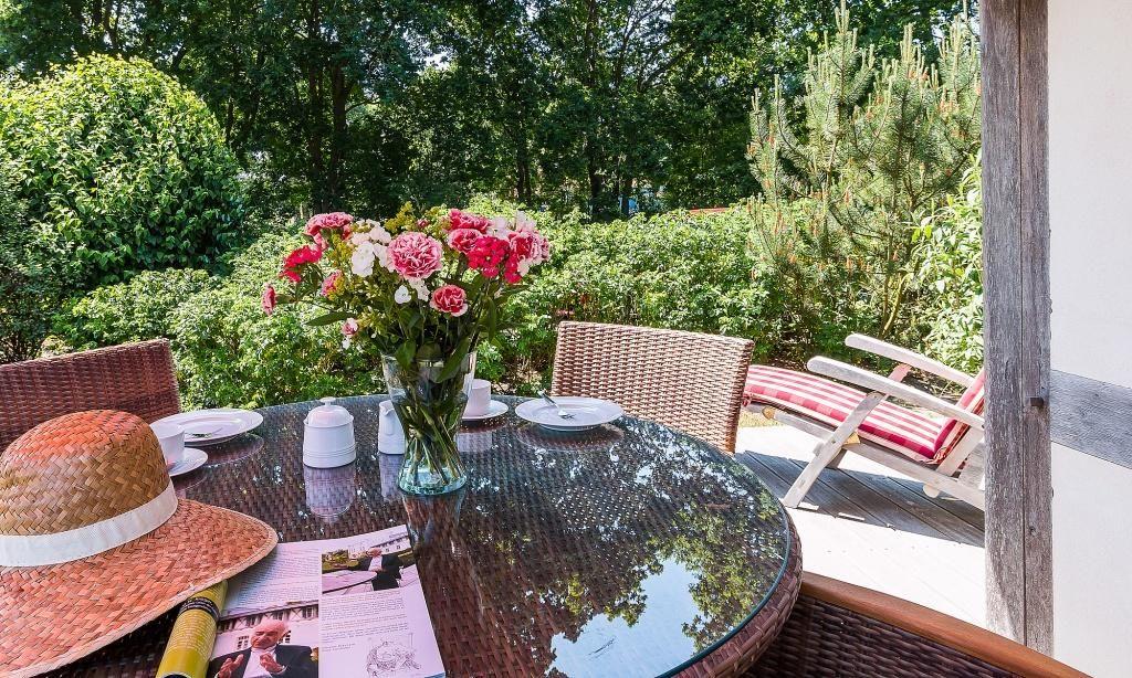 Vom Wohnbereich gelangst du auf die großzügige Holzterrasse. Hier genießt du neben der hochwertigen Bestuhlung mit Sonnenschirm einen traumhaften Blick auf die weite Wiesenlandschaft. Sonnenliegen können ebenso wie der Garten mitgenutzt werden. Ein PKW-Stellplatz steht zur Verfügung.