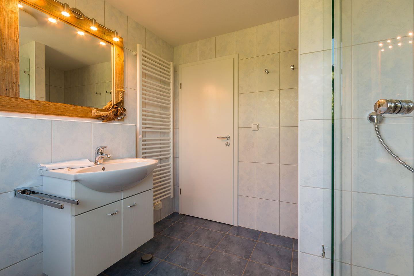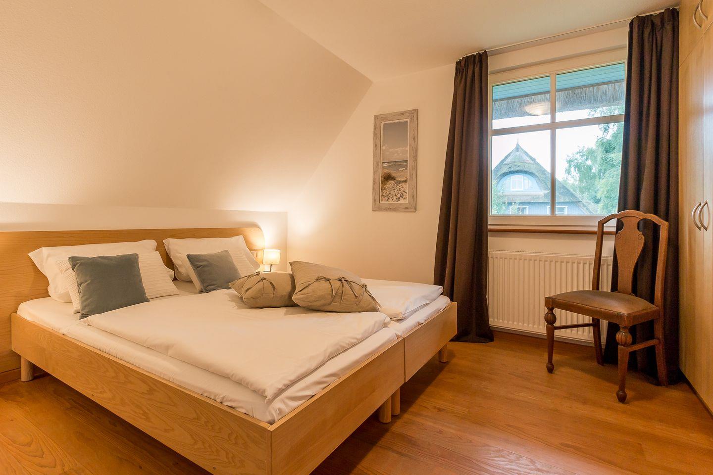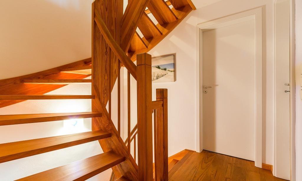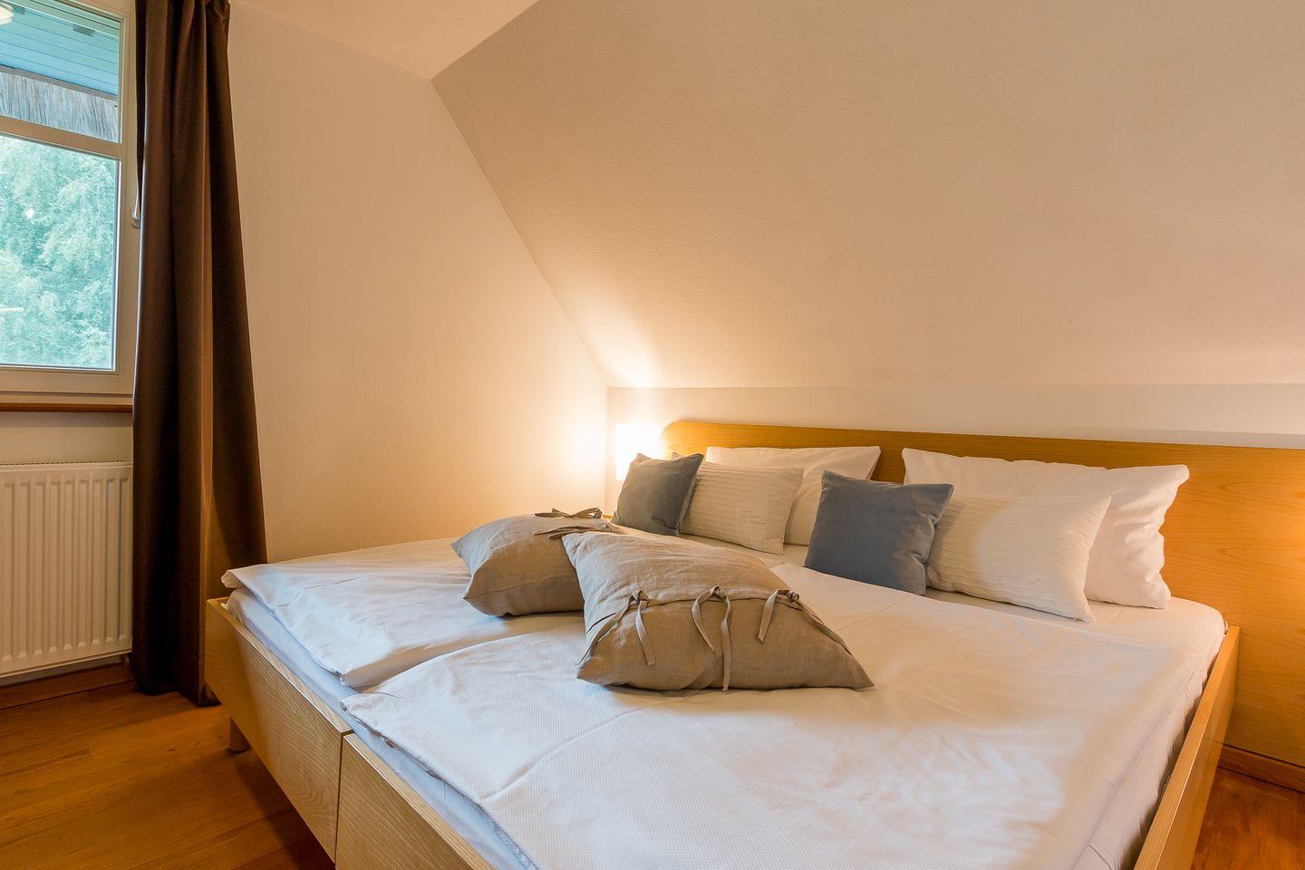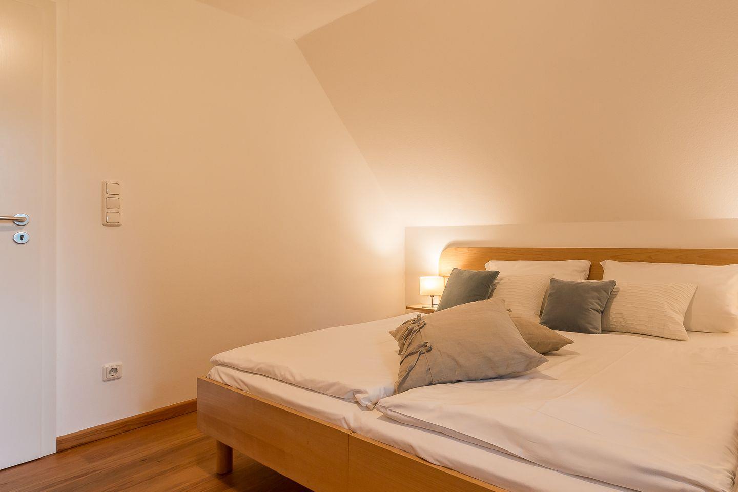 Über eine Naturholztreppe gelangst du in das Obergeschoss. Hier befinden sich die drei Schlafzimmer, die mit je einem Doppelbett ausgestattet sind. Warme Farben, hochwertige Holzmöbel und der Dielenboden sorgen für zusätzliche Behaglichkeit, die den Schlaf fördert und dir erholsame Nächte schenkt. Ein weiteres Badezimmer mit Dusche und WC ist ebenfalls auf dieser Etage untergebracht. Eine eigene kleine Wellness-Oase wartet im Spitzboden auf dich. Denn die Klafs-Sauna und die angrenzende Schwalldusche sorgen für die richtige Entspannung nach einem aktiven Urlaubstag und bieten Wohlfühlkomfort zu jeder Jahreszeit. Das separate WC rundet den Wellnessbereich perfekt ab.