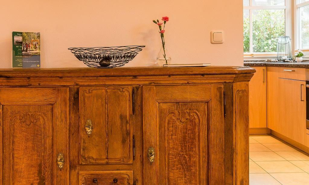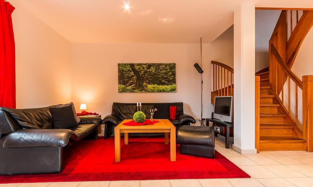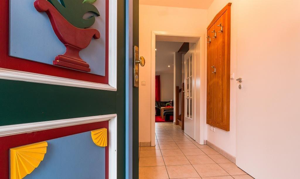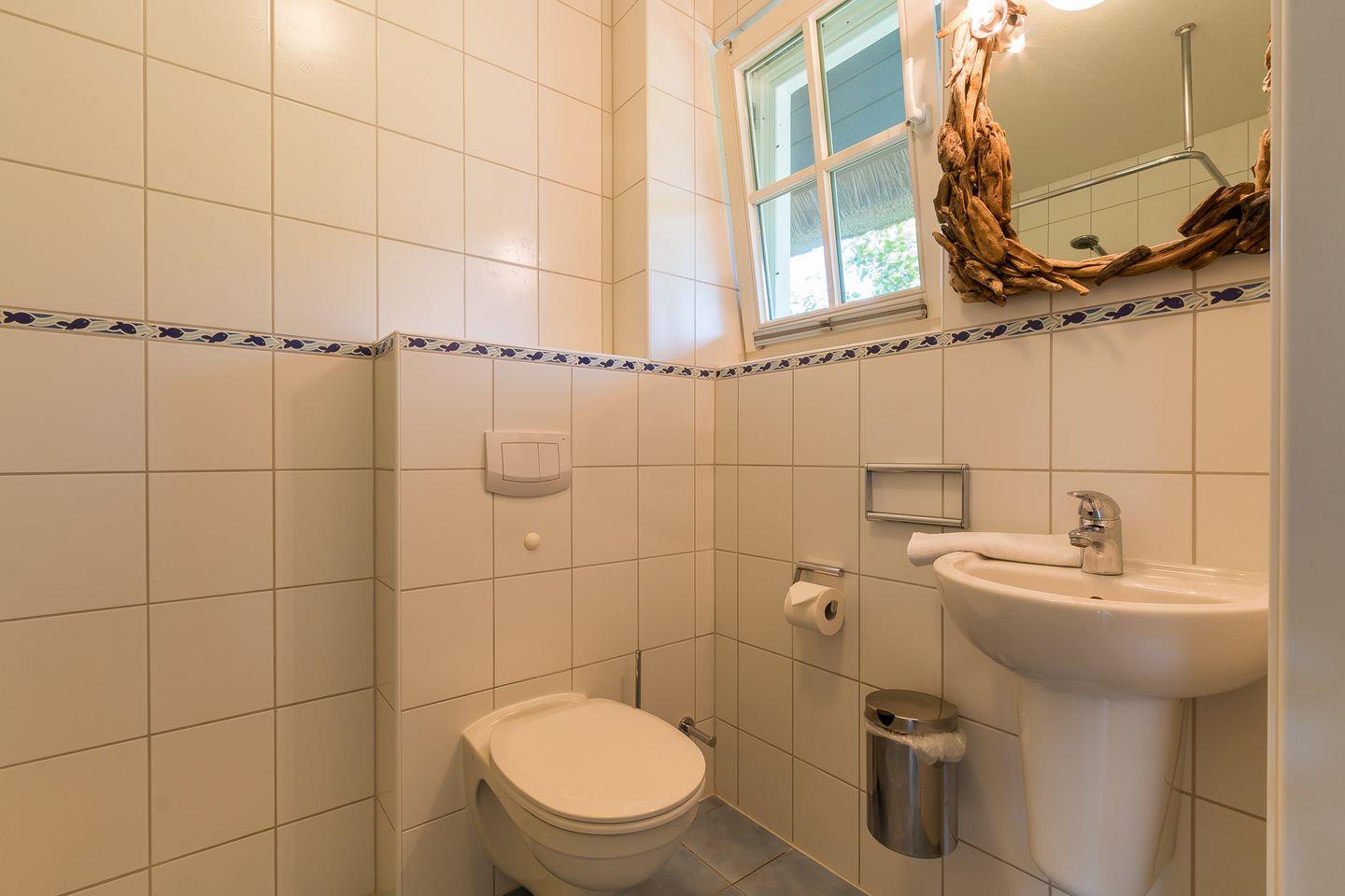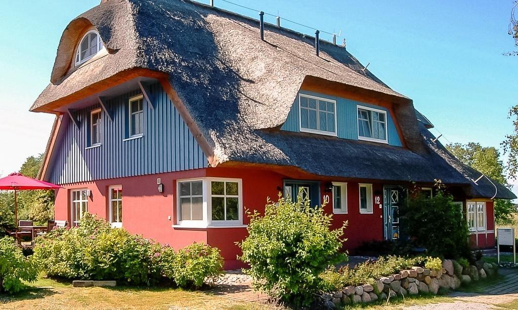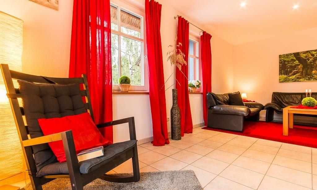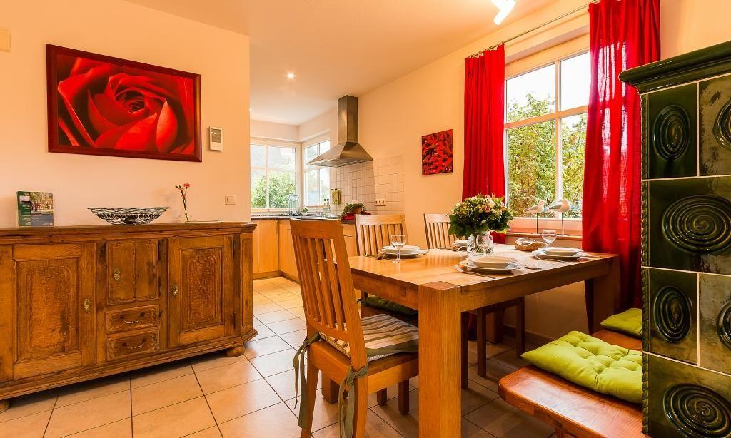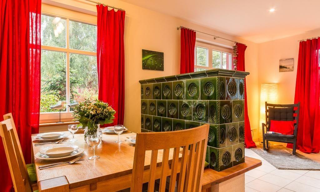 Im fischlandtypischen Stil erwartet dich die Reet-Doppelhaushälfte mit der buntgeschnitzten Darßer Haustür. Im Erdgeschoss gelangst du über den Flur mit Garderobe direkt in den großzügigen Wohnbereich. Blickfang ist der urige und zentral beheizte Kachelofen, der den Essbereich vom TV-Bereich trennt. Dank der bequemen Ledersofas hast du hier ausreichend Platz, um mit der ganzen Familie gemütliche Fernsehabende zu verbringen. Die offene und voll ausgestattete Küche lädt zum gemeinsamen Kochen und Klönen am Esstisch ein. Des Weiteren befindet sich auch ein barrierefreies Bad mit Dusche und WC auf der unteren Etage. Auf Wunsch kann ein Zustellbett im Wohnbereich aufgestellt werden, so dass sich die Parterre auch sehr gut für Rollstuhlfahrer nutzen lässt.
