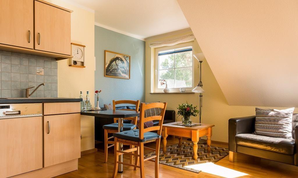 Über eine separate Außentreppe gelangst du in die Ferienwohnung. Die gemütliche Unterkunft besitzt einen offenen Wohnbereich mit kleiner Sitzecke und TV-Bereich sowie eine Küchenzeile mit integriertem Esstisch. Das Schlafzimmer ist hell und freundlich gestaltet und verfügt über ein Doppelbett sowie genügend Stauraum in den Schränken. Ein Badezimmer mit Dusche/WC und Handtuchheizer runden die niedliche Ferienwohnung ab. Hier findest du alles vor, was du für einen Urlaub zu zweit brauchst.