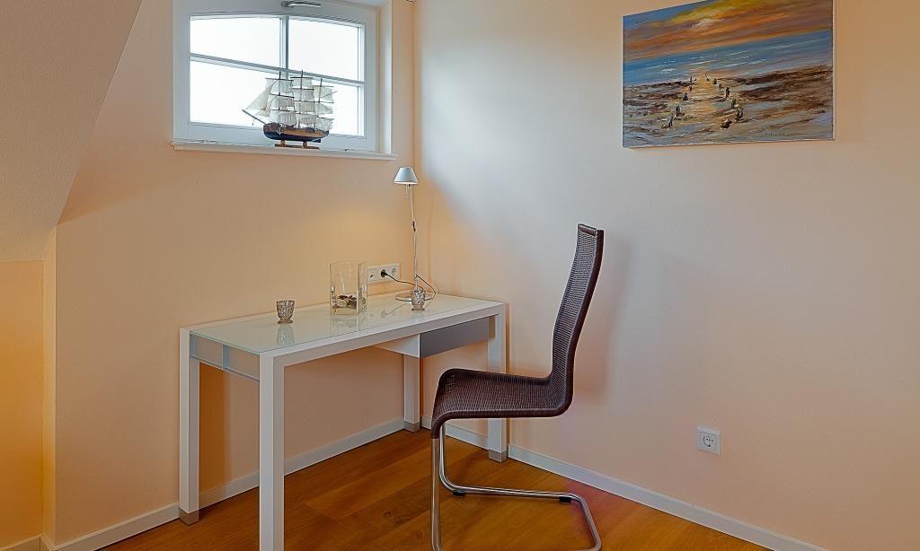 Im Erdgeschoss der Haushälfte befinden sich der helle und freundliche Wohnraum mit einladender Sitzecke am Kaminofen, eine offene Küchenzeile mit Esstisch sowie das Gäste-WC und der Zugang zur Terrasse. Im Obergeschoss erwarten dich zwei gemütlich eingerichtete Schlafzimmer mit jeweils einem Doppelbett und ein Bad mit Dusche/WC.