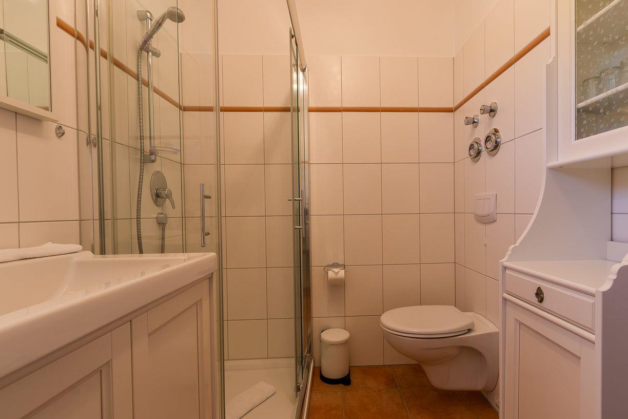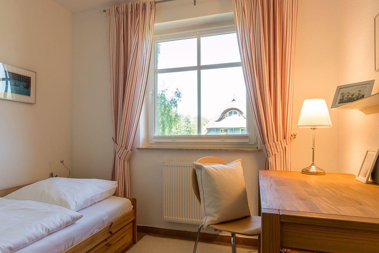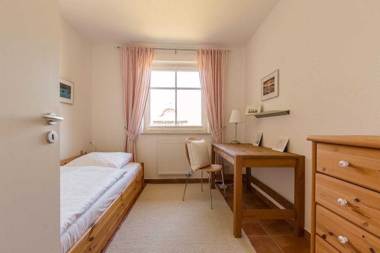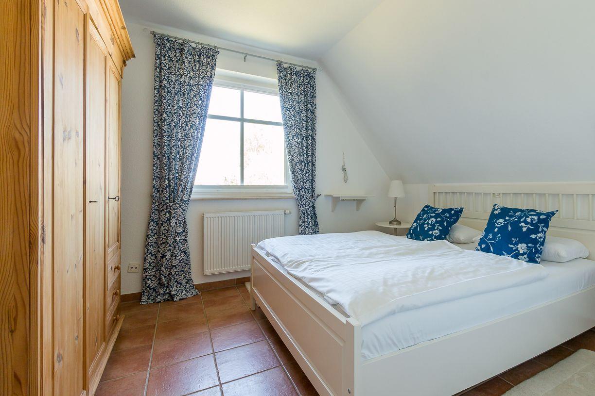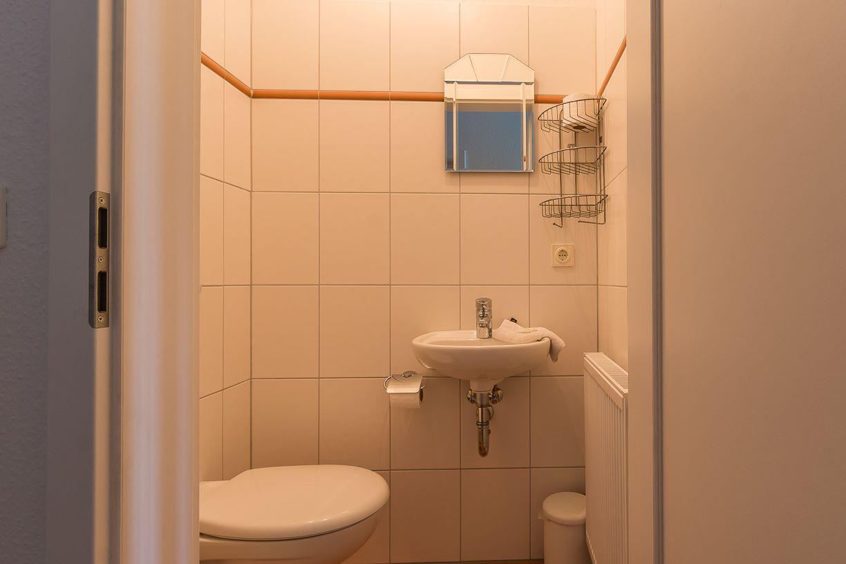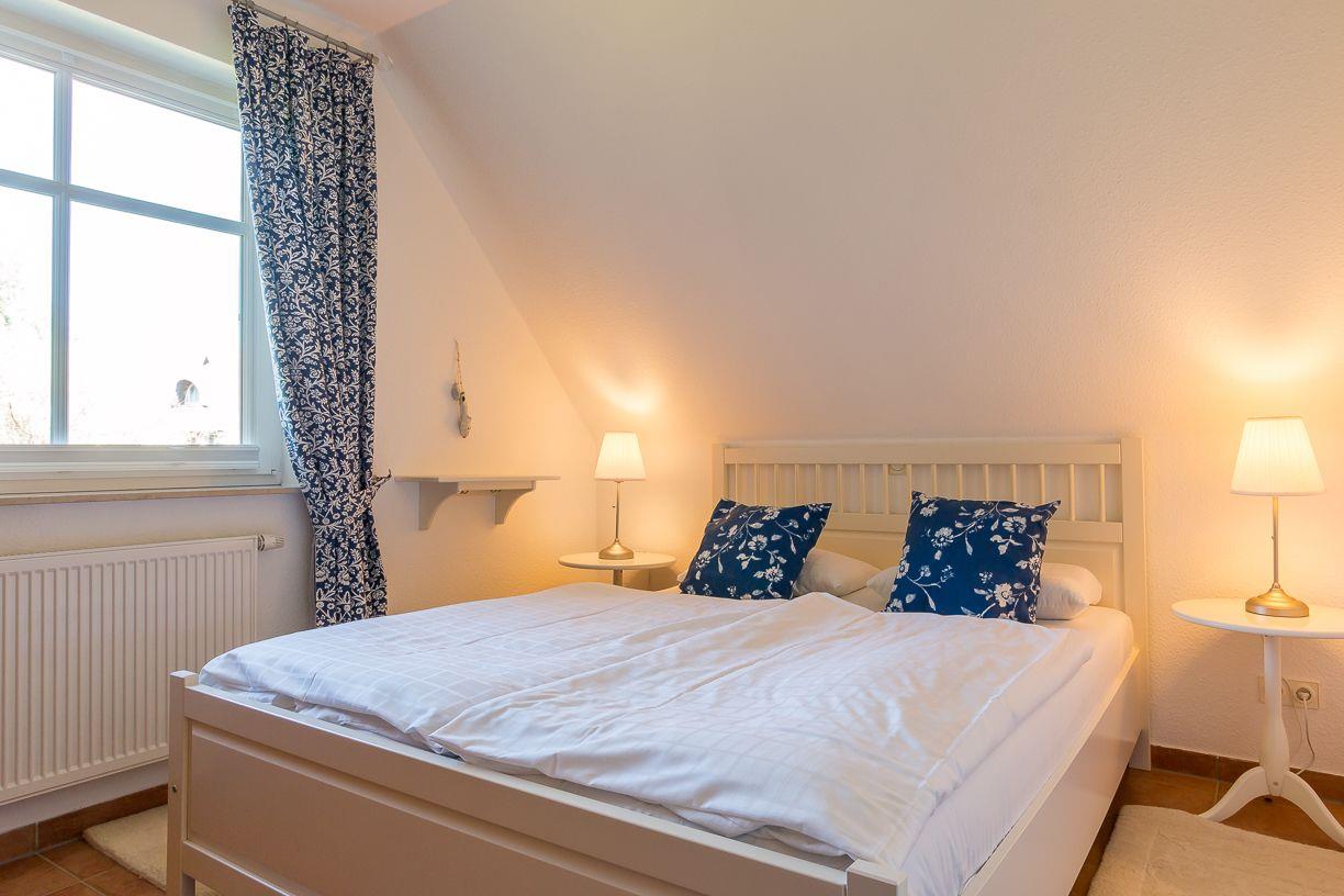 Die Ferienwohnung befindet sich im ersten Obergeschoss und ist über eine kurze Treppe zu erreichen. Lichtdurchflutete Räume und helle, freundliche Farben lassen sofort Urlaubsfeeling aufkommen. Der offene Wohn- und Küchenbereich ist Mittelpunkt der Wohnung. Mit seiner gemütlichen Sofagarnitur, dem Esstisch und der vollausgestatteten Küchenzeile kannst du hier nach Herzenslust klönen, kochen und entspannen. Die zwei Schlafzimmer sind harmonisch und geräumig gestaltet. Das Hauptschlafzimmer ist mit einem Doppelbett ausgestattet, ein zweites Schlafzimmer besitzt ein Kojenbett für eine dritte Person. Abgerundet wird der Wohnkomfort mit einem Badezimmer mit Dusche, WC und Waschmaschine sowie einem zweiten Gäste-WC.