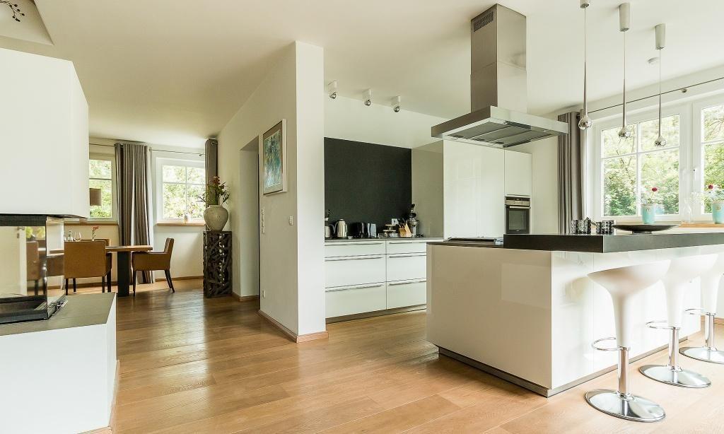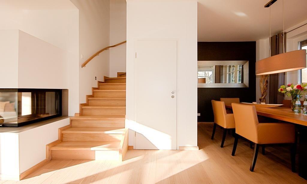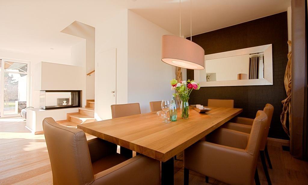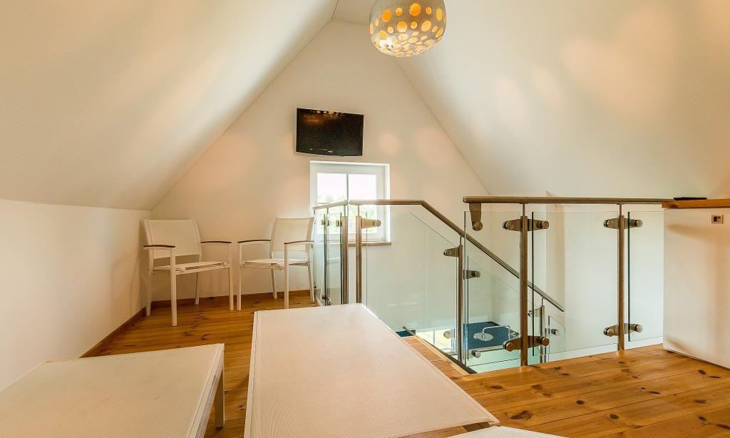 Du gelangst über den abgeschlossenen Eingangsbereich mit Garderobe direkt in den offenen und lichtdurchfluteten Wohnbereich. Hier erwartet dich eine gemütliche Sitzecke am modernen Kamin. Ein großzügiger Essbereich und die hochwertige Einbauküche mit Kochinsel und Tresen sind perfekt aufeinander abgestimmt und fügen sich harmonisch in das Gesamtbild ein. Auch ein Gästebad mit Dusche/WC befindet sich im Erdgeschoss. Das Obergeschoss beherbergt ein Schlafzimmer mit einem Doppelbett sowie ein luxuriöses Bad mit Badewanne, Dusche/WC. Der Spitzboden bietet ein zusätzliches Geschoss, das als offene Schlafgalerie mit zwei Einzelbetten ausgestattet ist. Im Anbau des Hauses wurde eine Wellnessoase geschaffen, die sich über zwei Ebenen erstreckt und von beiden Haushälften genutzt werden kann. Dank der Sauna, Dusche und dem Ruhebereich mit Entspannungsliegen kannst du hier nach Herzenslust relaxen, neue Energie tanken und einfach nur die Seele baumeln lassen.