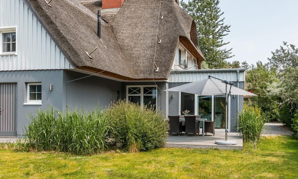Im Außenbereich erwartet dich ein kleiner gepflegter Garten. Mit der großzügigen Holzterrasse, der hochwertigen Bestuhlung und den Sonnenliegen kannst du deinen Urlaub auch draußen genießen. Zum Ferienhaus gehören zwei PKW-Stellplätze.