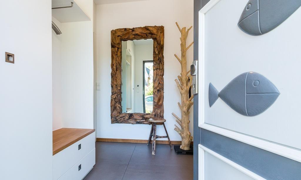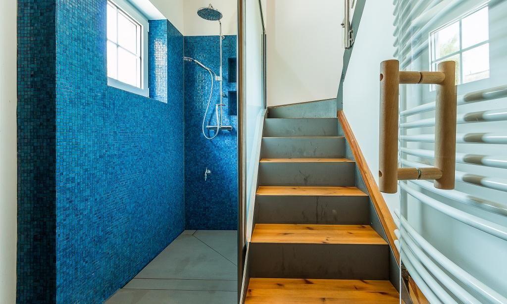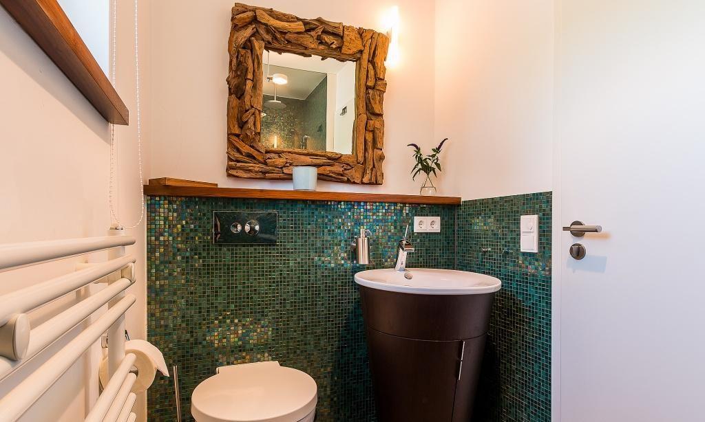 Im Anbau des Hauses wurde eine Wellnessoase geschaffen, die sich über zwei Ebenen erstreckt und gerade an kühleren Tagen eine willkommene Abwechslung bietet. Hier ist eine Sauna mit Dusche untergebracht sowie ein Ruhebereich mit Entspannungsliegen in der Galerie. Der Wellnessbereich wird gemeinschaftlich mit der Nachbarhaushälfte genutzt.