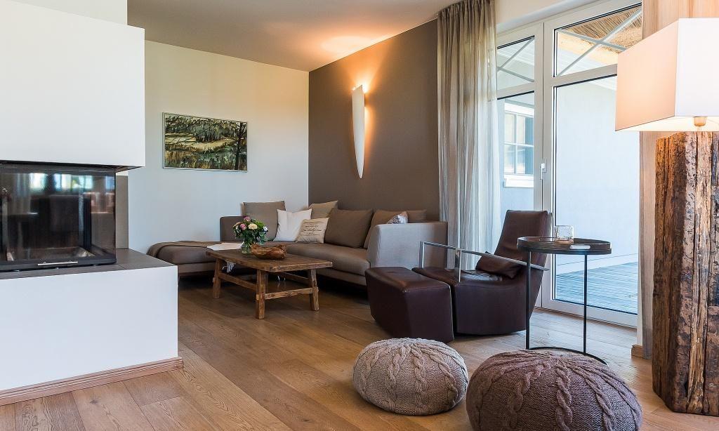 Im Erdgeschoss gelangst du über den abgeschlossenen Eingangsbereich mit Garderobe direkt in den offenen und lichtdurchfluteten Wohnbereich. Hier erwartet dich eine gemütliche Sitzecke am modernen Kamin. Ein großzügiger Essbereich und die hochwertige Einbauküche mit Kochinsel und Tresen sind perfekt aufeinander abgestimmt und fügen sich harmonisch ein. Hier kannst du gesellige Stunden mit deiner Familie verleben. Weiterhin befindet sich ein Gästebad mit Dusche/WC im Erdgeschoss. Das Obergeschoss beherbergt ein Schlafzimmer mit einem Doppelbett sowie ein luxuriöses Bad mit Badewanne, WC und Bidet. Der Spitzboden bietet ein zusätzliches Geschoss mit einer offenen Schlafgalerie und zwei Einzelbetten.