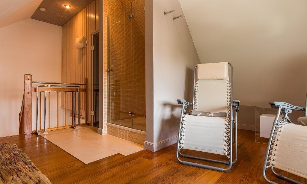 Im Erdgeschoss befindet sich der lichtdurchflutete Wohnraum, der mit einer gemütlichen Sitzecke und dem Kamin zum Mittelpunkt des Hauses gehört. Die komfortable und funktionale Küchenzeile sowie ein großzügiger Essbereich fügen sich harmonisch ein und schaffen eine offene Wohnatmosphäre. Ein Gästebad mit Dusche/WC schließt sich direkt an. Die große Holzterrasse mit Blick ins Grüne ist direkt vom Wohnbereich aus begehbar und lädt zum Verweilen ein. Im ersten Obergeschoss befinden sich drei Schlafzimmer, die jeweils mit Doppelbetten ausgestattet sind. Das hochwertige Bad verfügt über eine Badewanne/ WC. Das Dachgeschoss beherbergt einen Wellnessbereich mit Sauna und Dusche sowie einen Ruhebereich - ideal zum Entspannen, gerade an kühleren Tagen!