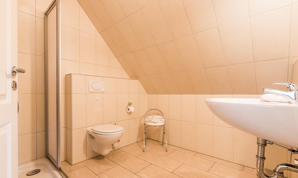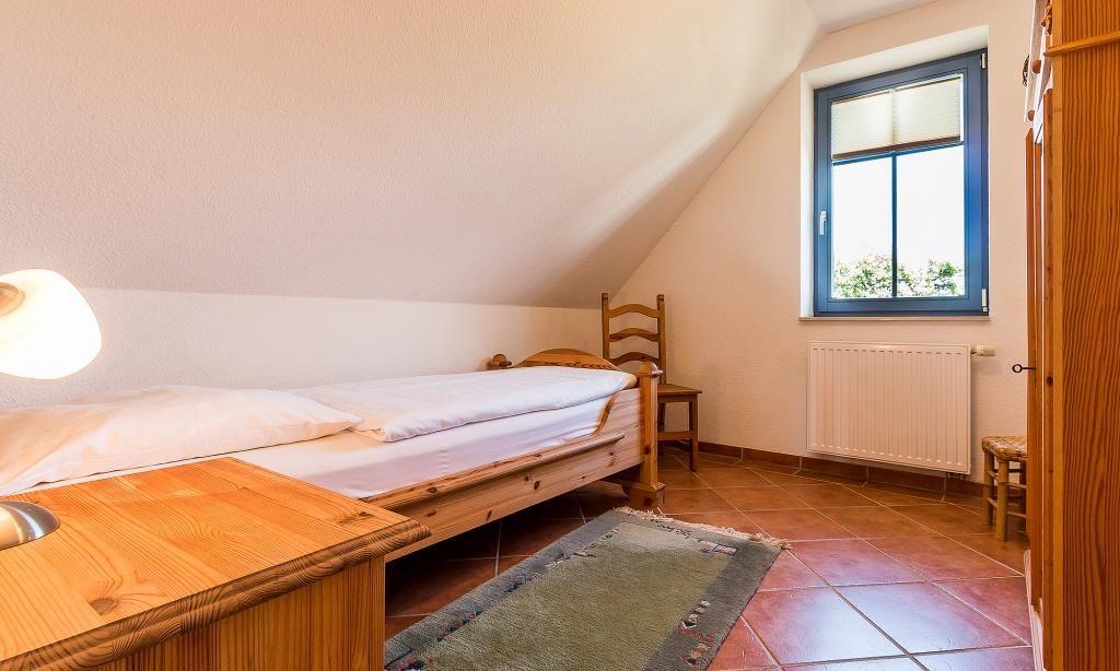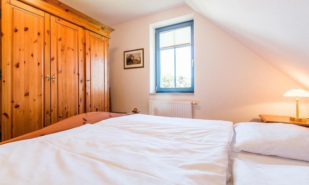 Die Obergeschosswohnung verfügt über einen einladenden Wohnraum mit einer gemütlichen Sitzecke sowie eine Küchenzeile mit angrenzendem Essbereich. Hier genießt du einen traumhaften Blick über den Bodden. Weiterhin gibt es ein Schlafzimmer mit einem Doppelbett, ein Schlafzimmer mit einem Einzelbett sowie ein Bad mit Dusche/WC.