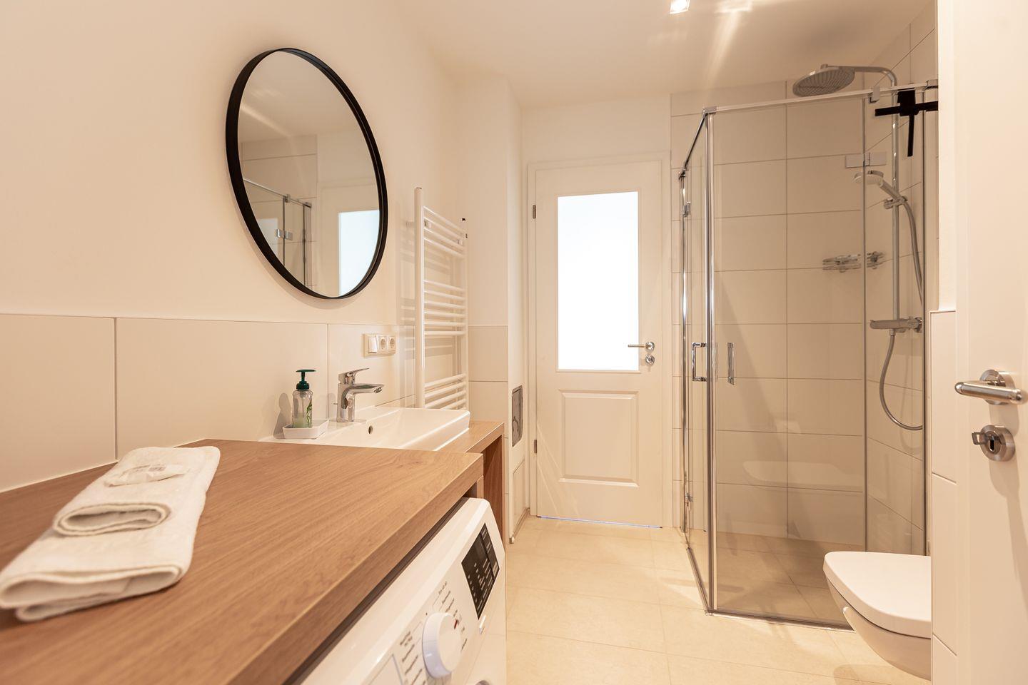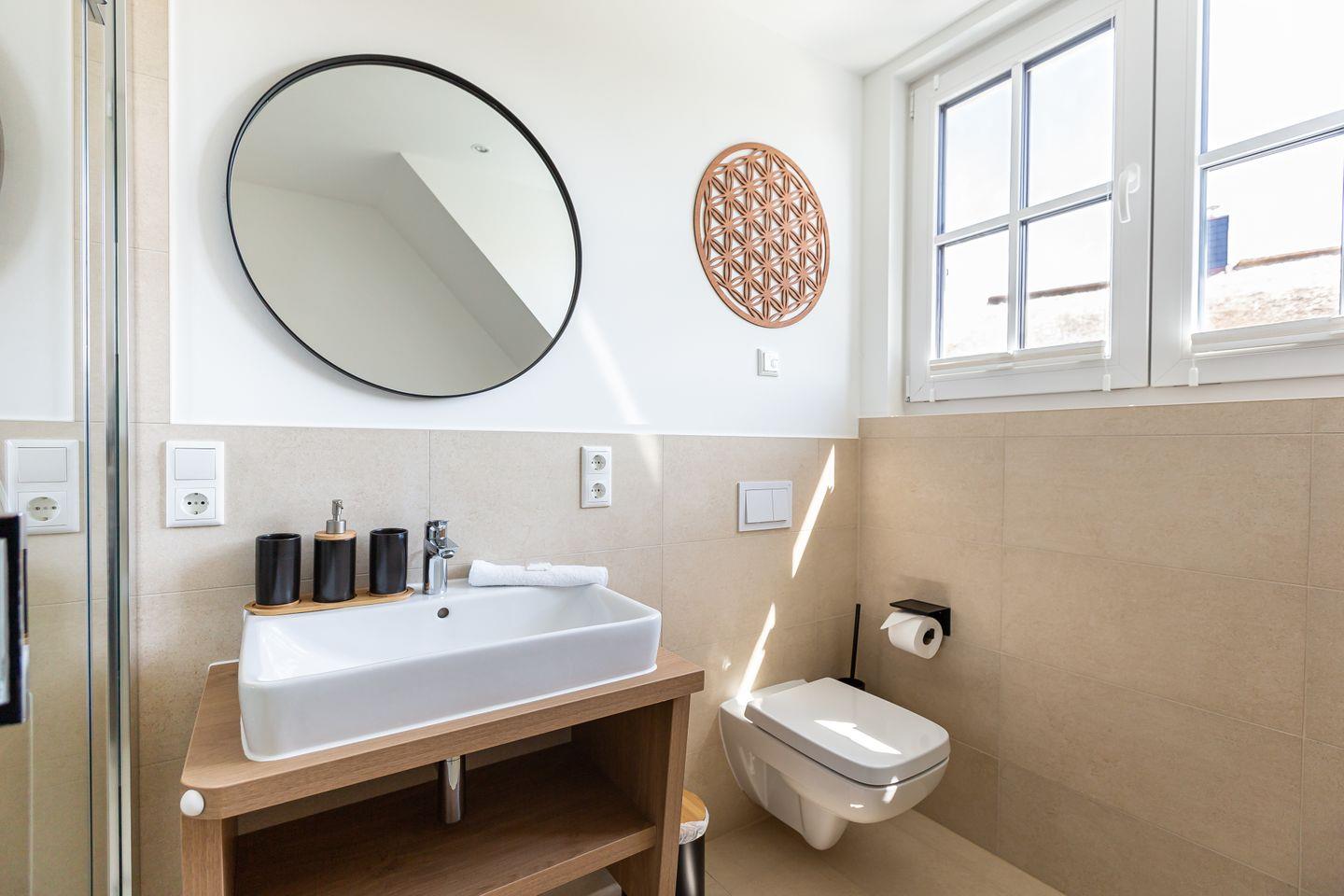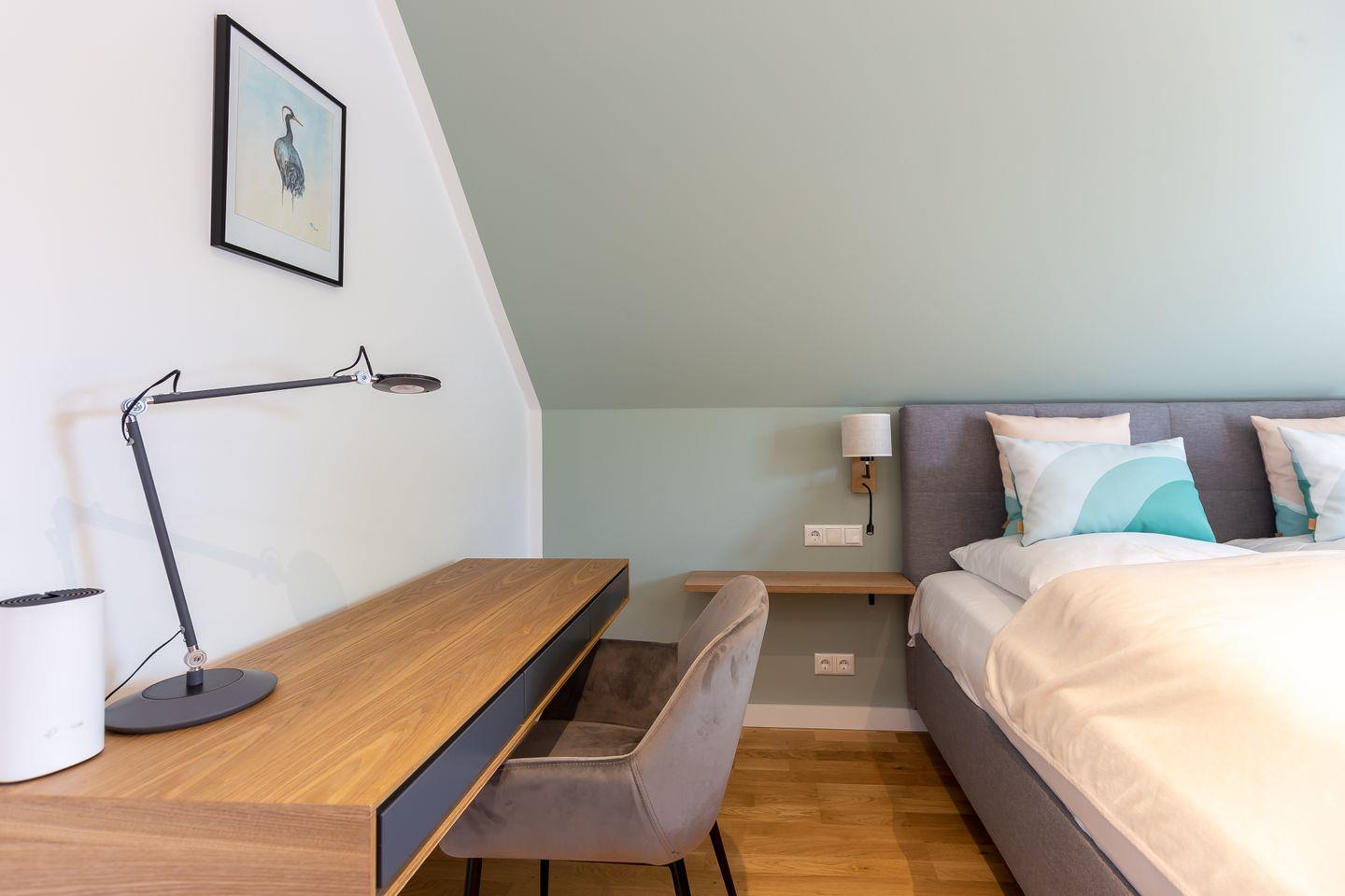 Über die Treppe gelangt man ins Obergeschoss und den Schlafbereich. Beide Schlafzimmer verfügen über ein hochwertiges Boxspringbett, einen Kleiderschrank, Ablagefläche und TV. Unaufgeregte Farben und kleine Akzente, wie die dekorativen Kraniche und Kissen sorgen für Stil und Gemütlichkeit, lenken aber nicht von der erholsamen Ruhezone ab. Ein zweites modernes Tageslichtbad mit Dusche und Badewanne macht den Wohnkomfort perfekt.