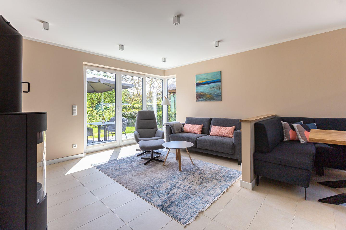 Schon bei Eintritt sieht man, was dieses wundervolle Ferienhaus auszeichnet. Klare Linien, hochwertige Materialien und helle Farben. Damit führt sich das Thema Design, das durch die besondere Architektur bereits außen erkennbar ist, auch im Innenbereich fort. Der großzügig gestaltete Wohn- und Küchenbereich ist das Herzstück des Hauses. Die schlichte Formsprache und zurückhaltende Dekoration schaffen ein modernes und zeitloses Wohngefühl, was zu keiner Zeit Ungemütlich wirkt. Ganz im Gegenteil, so sorgen der Kamin, das Sofa und der Relaxsessel an bodentiefen Fenstern für eine angenehme Behaglichkeit.