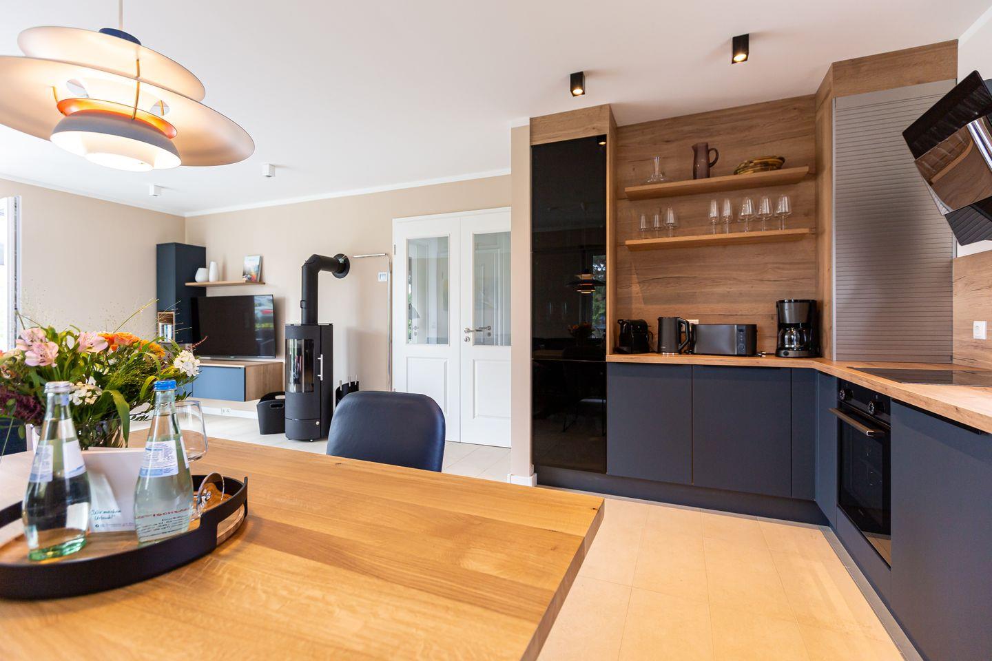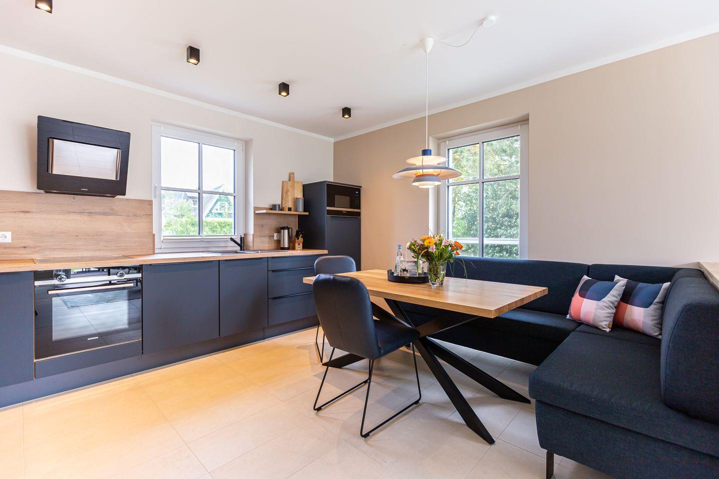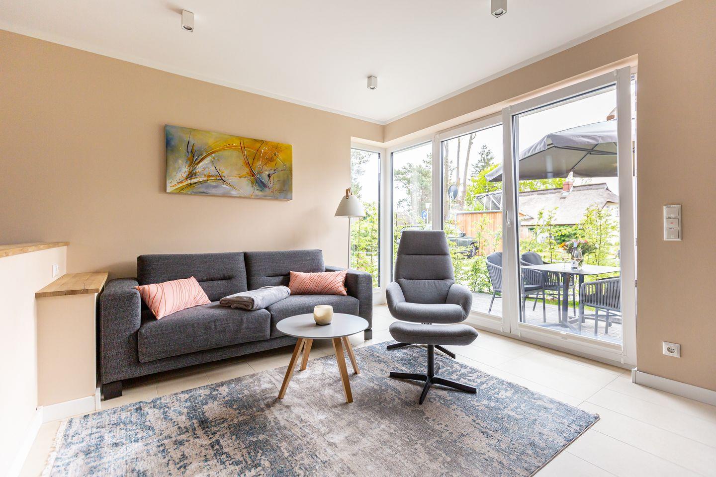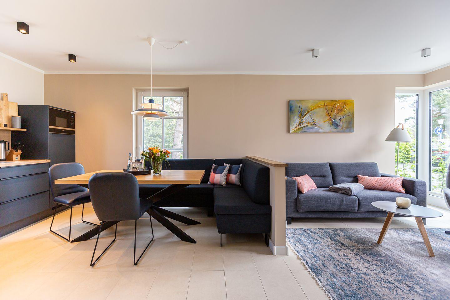Umgeben von alten Reetdachkaten fügt sich das neu erbaute Ferienhaus Windlooper harmonisch in die Umgebung ein und beweist, dass moderne Architektur in keinem Widerspruch zur traditionellen Darßer Bauweise steht. Bei Betreten der Ferien-Doppelhaushälfte zeigt sich, dass auch die Inneneinrichtung einem Designkonzept folgt, dass klare Linien und Formen, helle Farben und Naturmaterialien in den Fokus stellt. Durch den Flur geht es in den offen gestalteten Wohn- und Küchenbereich. Das gemütliche Sofa, der Relaxsessel, bodentiefe Fenster und der Kamin versprechen erholsame Stunden wenn es mal nicht in die Natur geht. Zur anderen Seite steht eine vollausgestattete Küche zur Verfügung. Hier lässt es sich nach Herzenslust kochen und klönen. Ein erstes Badezimmer mit Dusche und WC sowie die hauseigene Sauna befinden sich ebenfalls im Erdgeschoss. Für einen wohltuende Saunagang sind lediglich Zwei-Euro-Stücke notwendig. Verschiedene Saunaaufgüsse und ein herrliches Wellness-Erlebnis gibt es dafür inklusive.