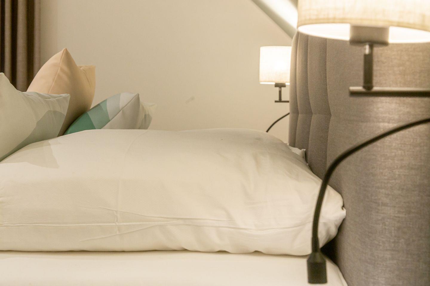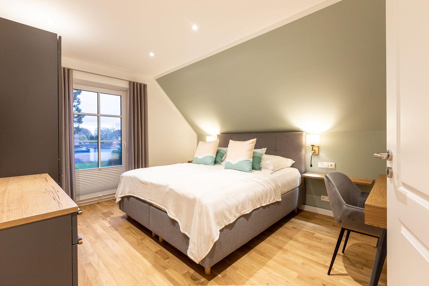 Über die Treppe erreicht man die beiden liebevoll und hochwertig ausgestatteten Schlafzimmer. Großzügige Boxspringbetten, Ablageflächen für Kleidung und stilvolle Beleuchtung sorgen für eine gemütliche Atmosphäre und einen erholsamen Schlaf. Mit einem zweiten Tageslichtbad, dass über eine Dusche und Badewanne verfügt, wird der Wohnkomfort abgerundet.