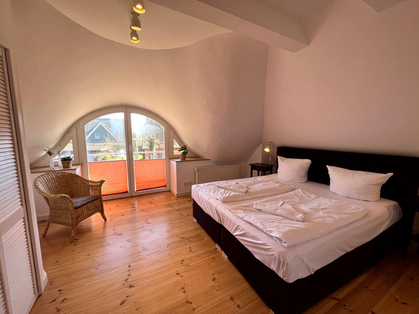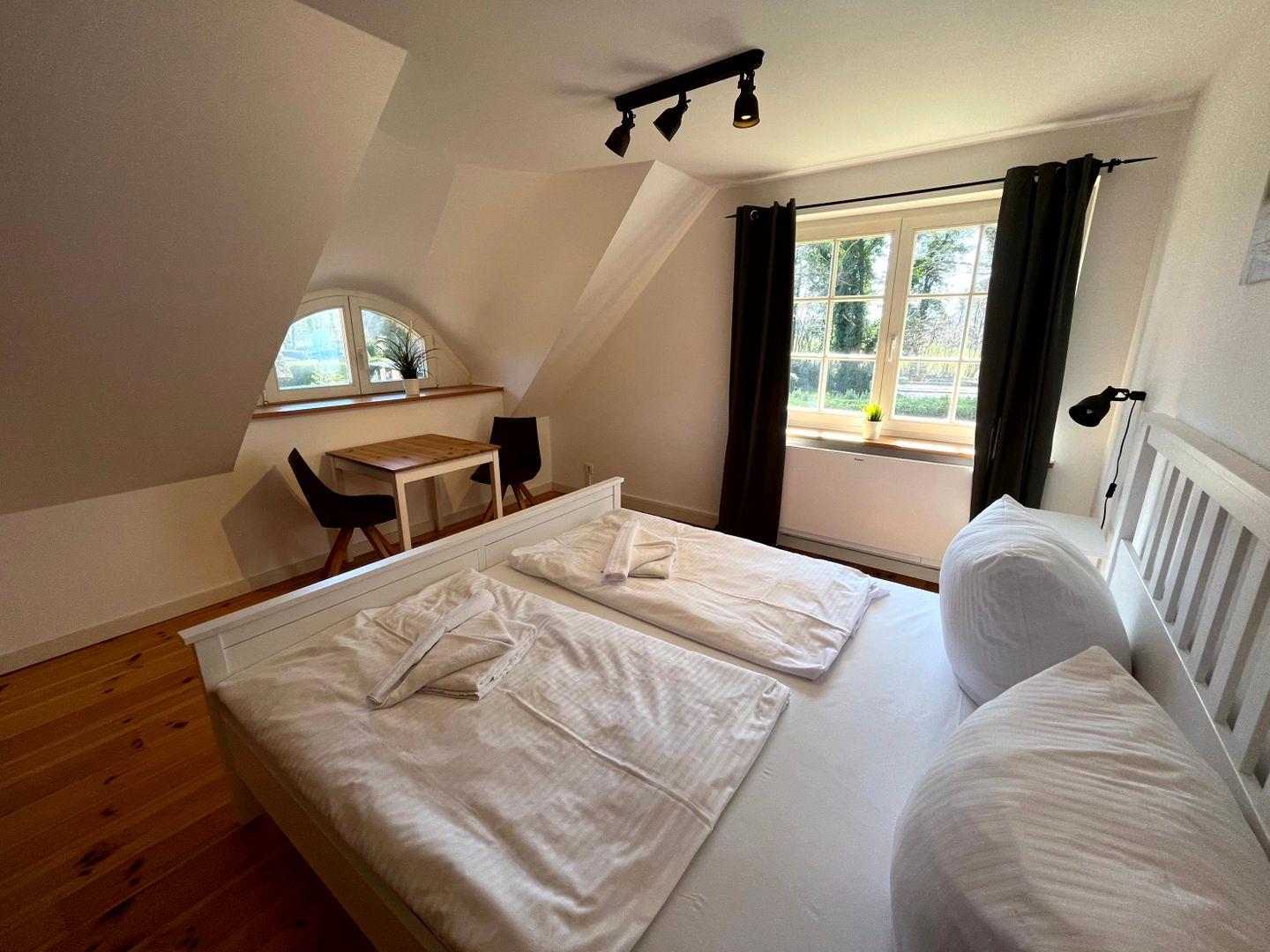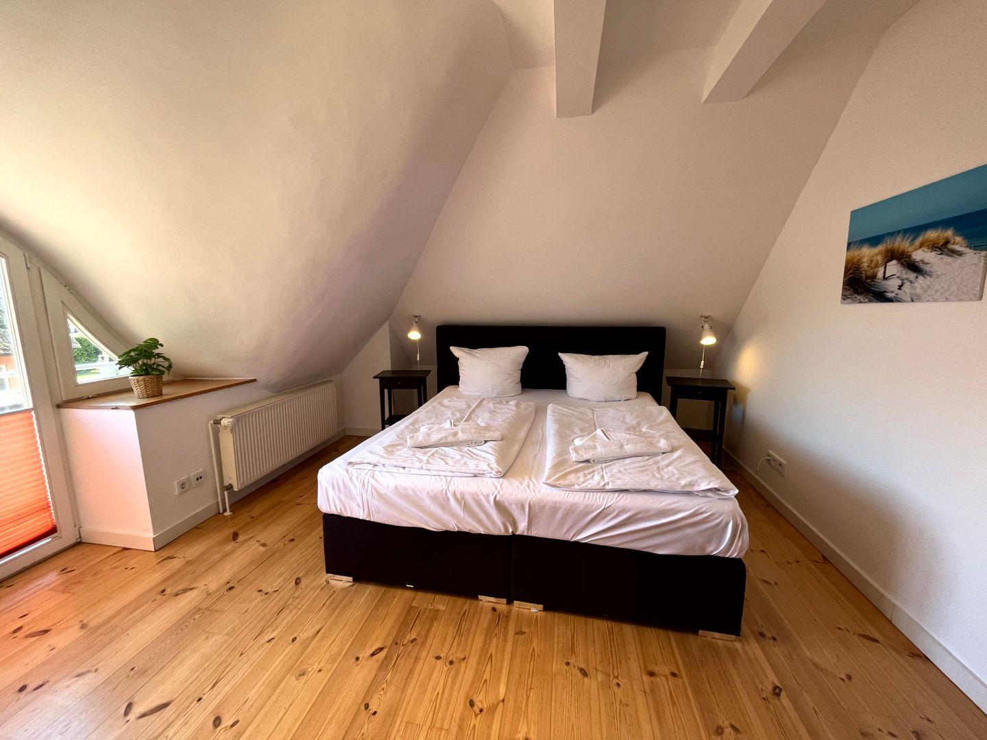 einem Doppelbett (160x200cm, Matratze durchgängig)) sowie einem Gäste-WC (WC