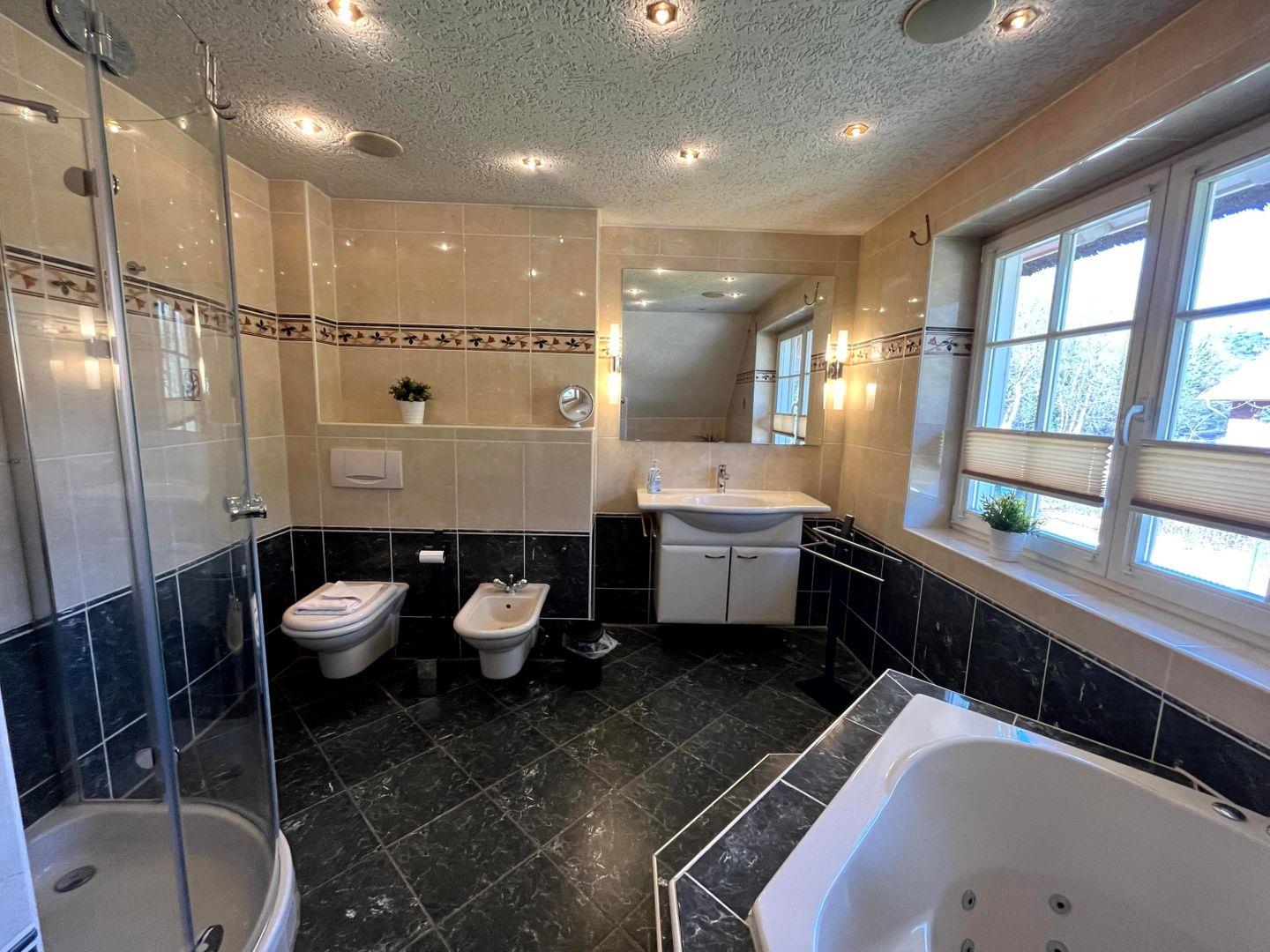 einer Dusche und einer Badewanne mit Whirlpool-Funktion. Die Terrasse ist mit