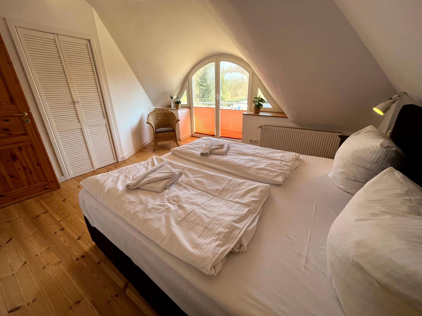 einem Doppelbett (je 180x200cm, Matratze durchgängig) und das Badezimmer, mit