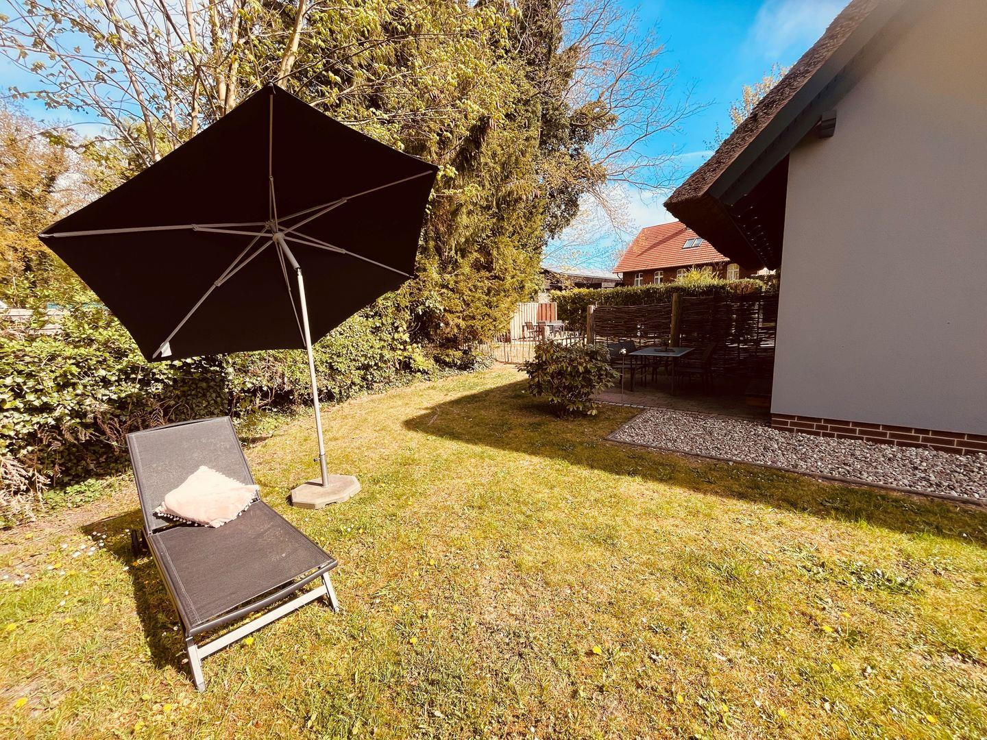 Terrasse ist mit Gartenmöbeln und Sonnenschirm und einer Gartenliege