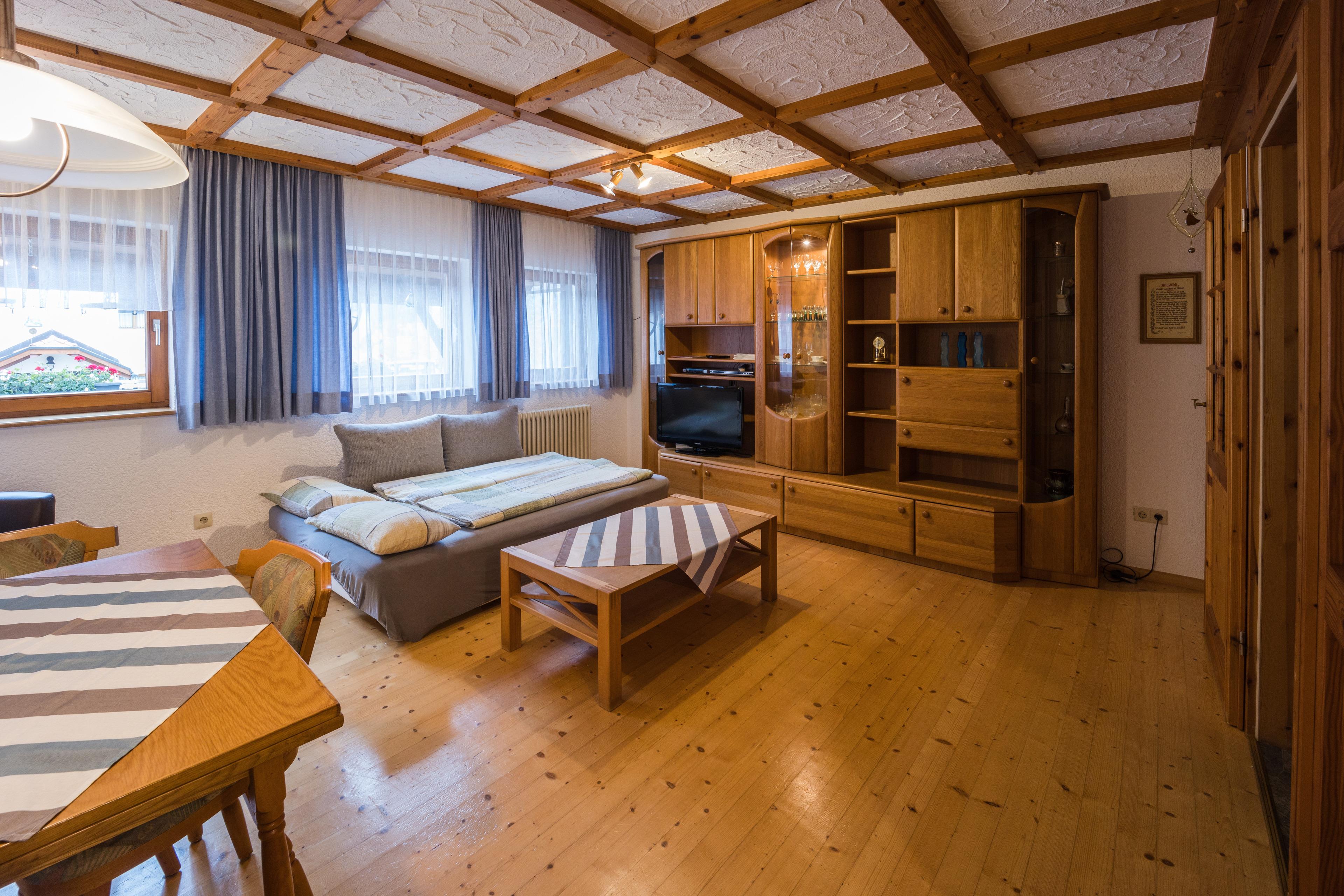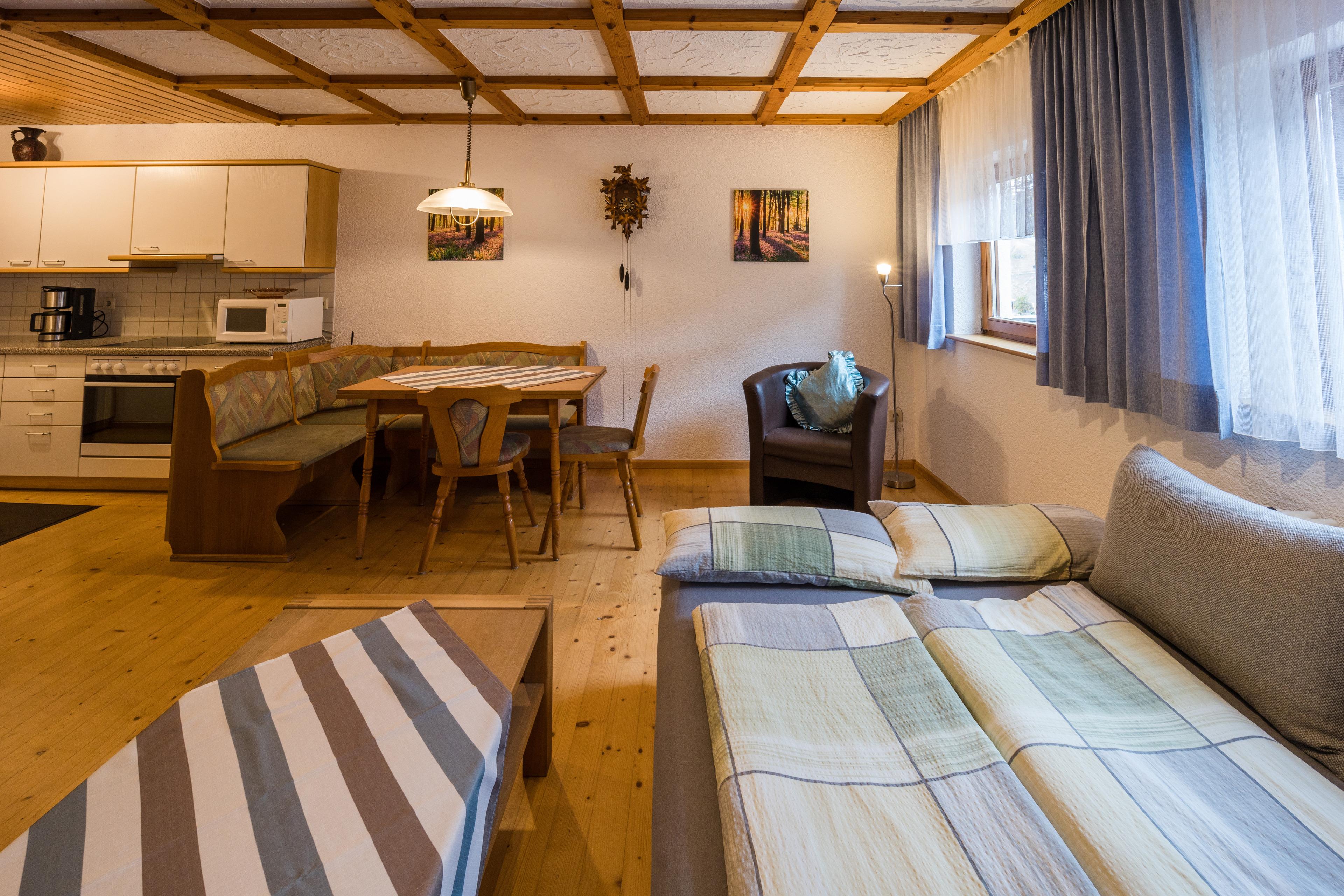 Die Ferienwohnung hat ein Schlafzimmer, ein Wohn-/Schlafzimmer mit einer Küche, einem Bad sowie ein zusätzliches WC.