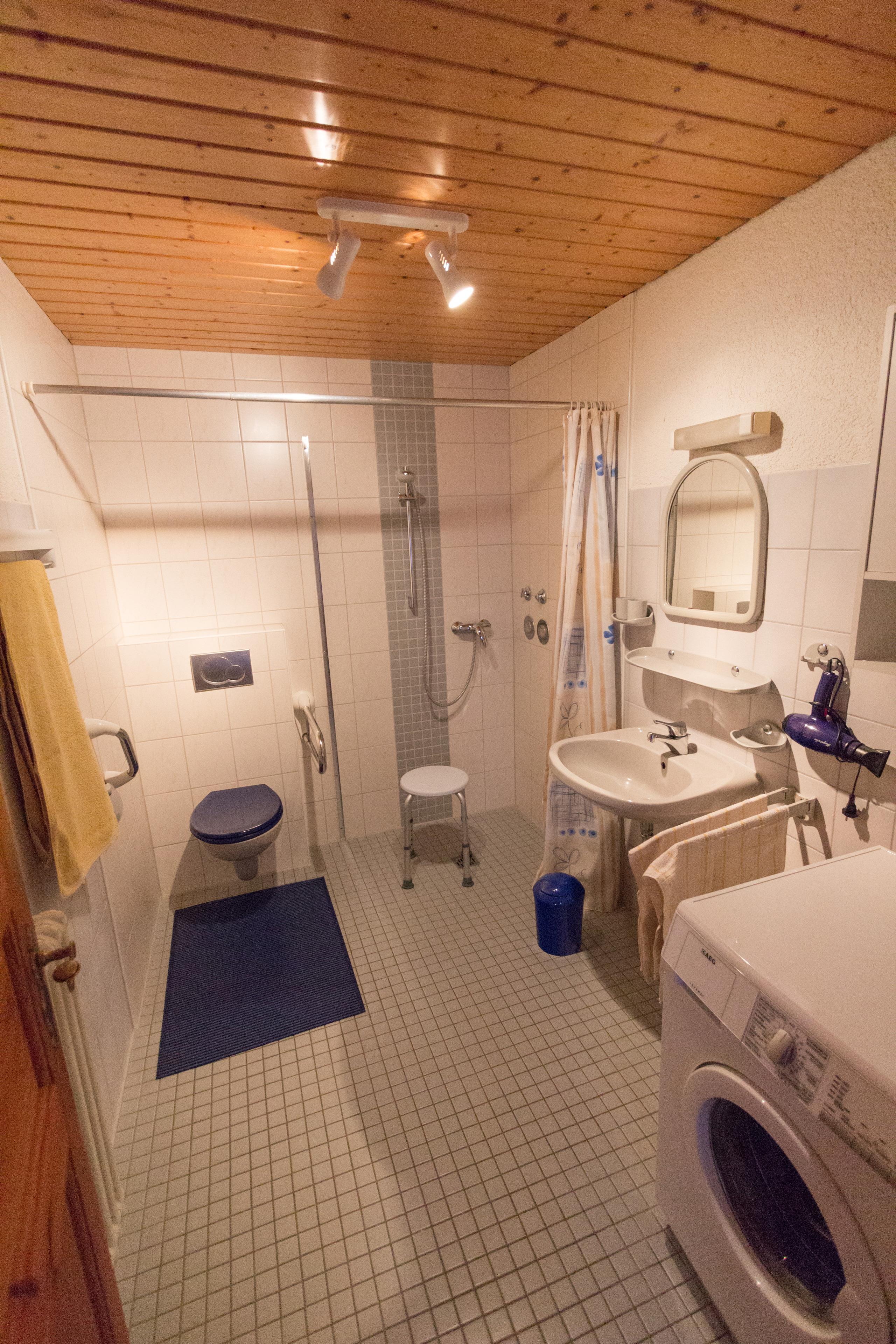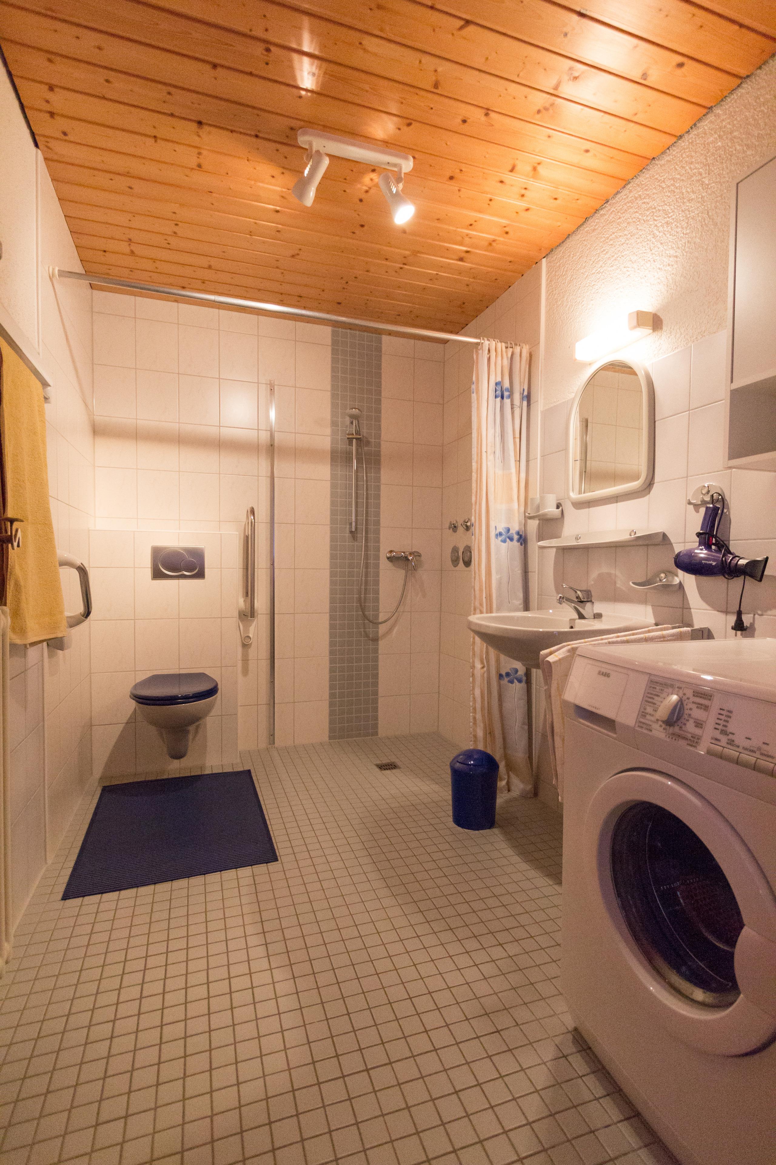 Waschmaschine, Bettwäsche und Handtücher sind vorhanden.