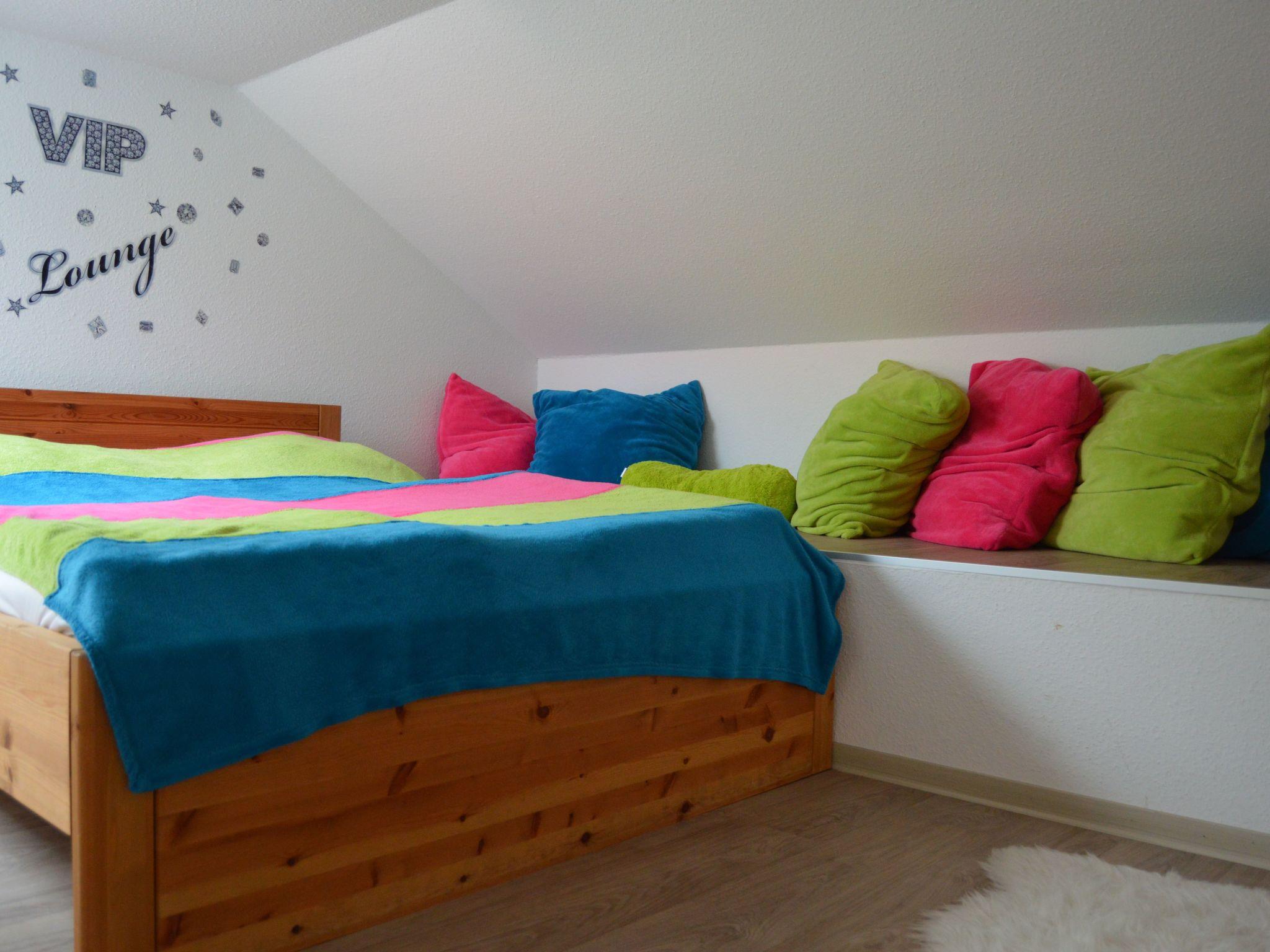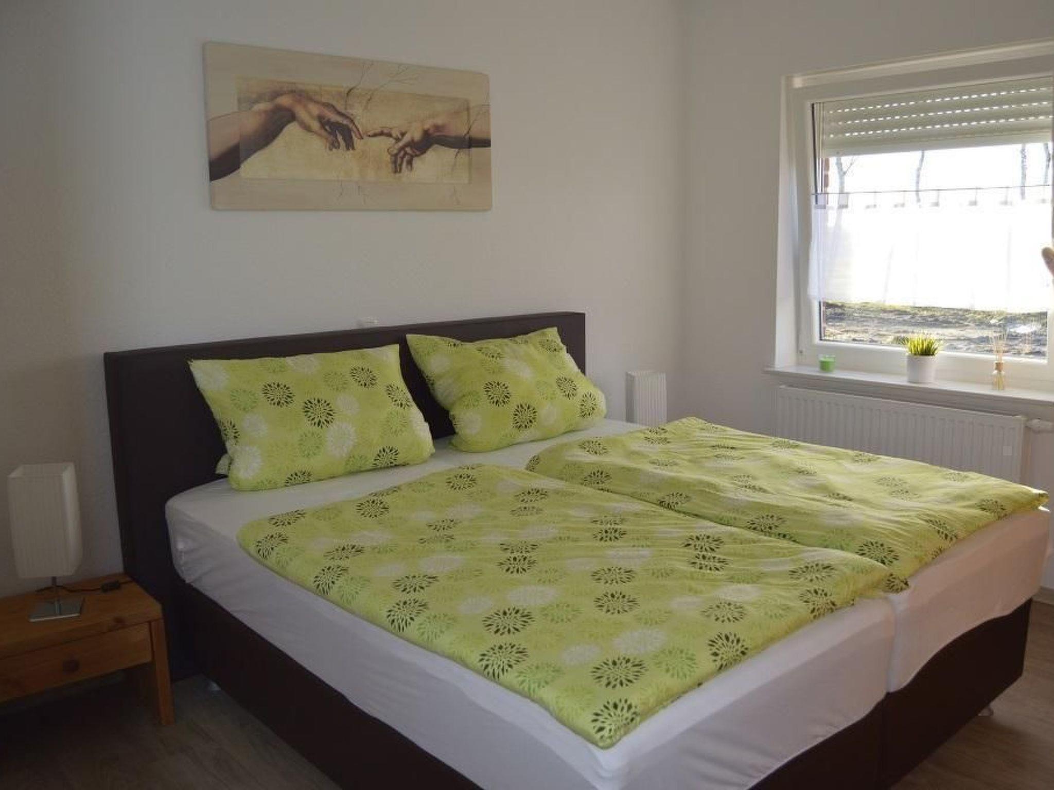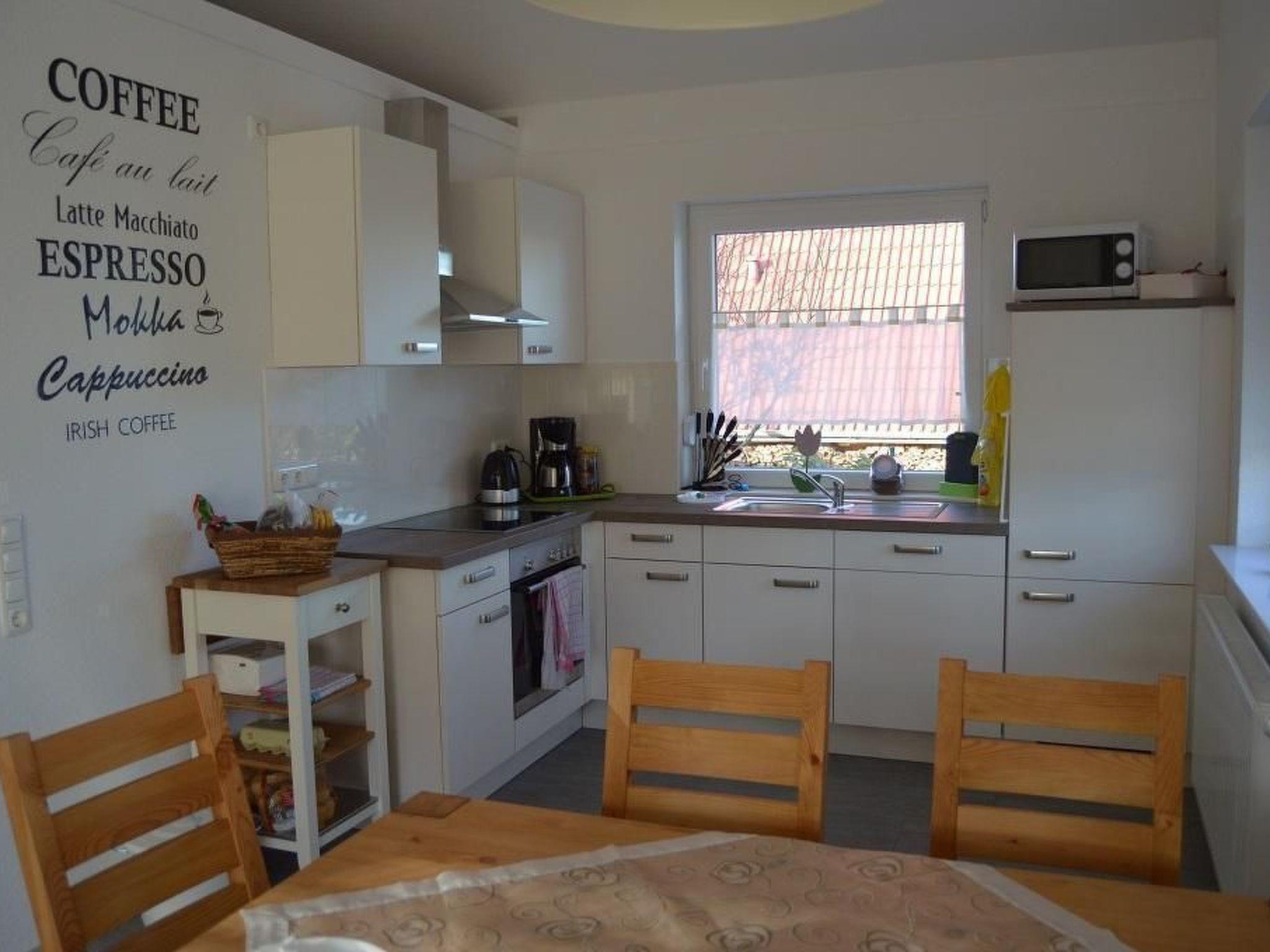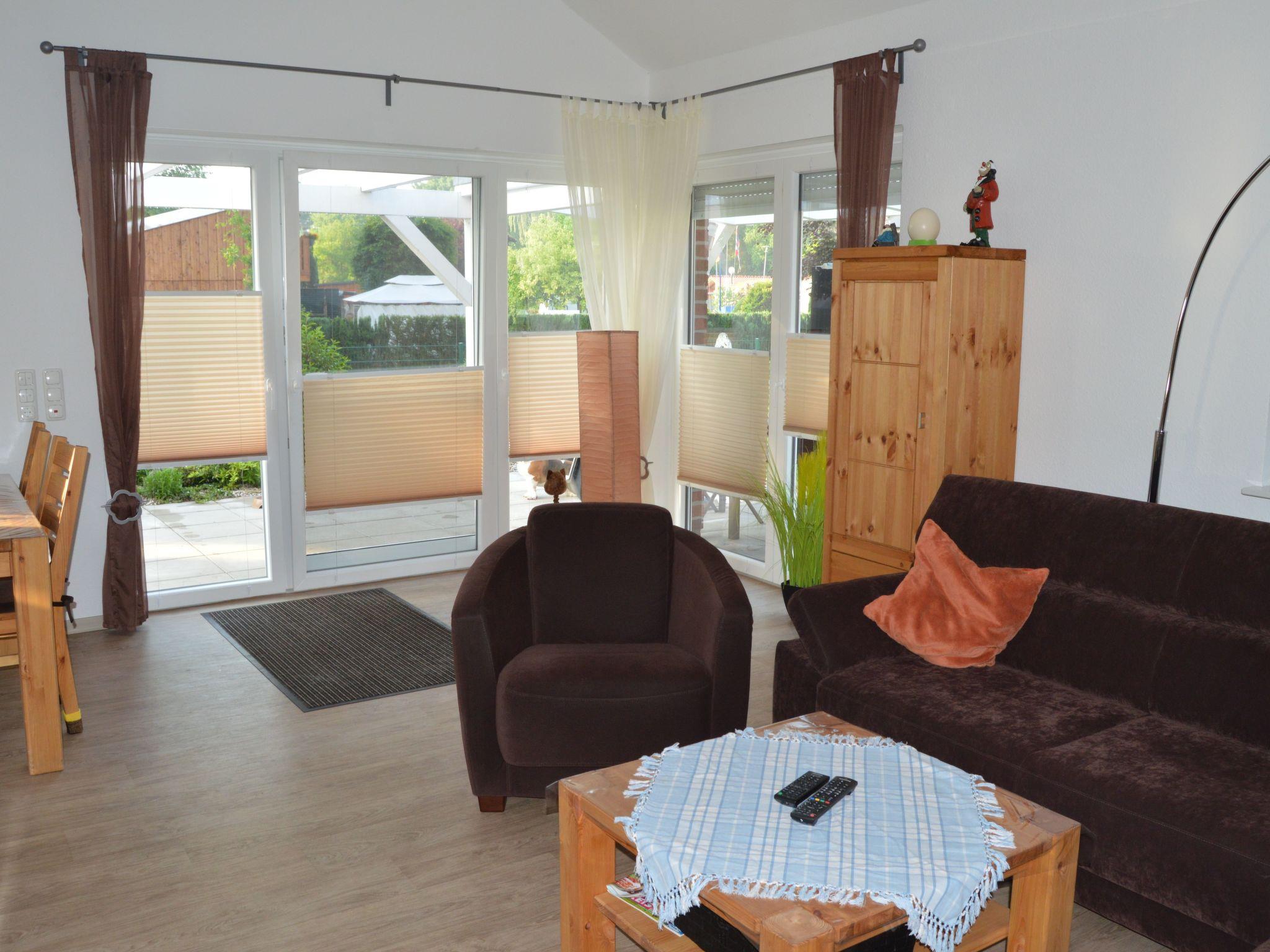 Inside the house you will find a spacious 100 m² without thresholds, making it handicapped accessible. The ground floor consists of the following rooms: An open-plan living room with a sofa bed, an armchair, a large flat-screen TV with DVD player, a hi-fi system, DVDs, CDs and a large dining table with five chairs. Next door is the fully equipped kitchen with hob, oven, dishwasher, microwave, filter coffee machine, capsule coffee machine (Netto), kettle, egg cooker, toaster, sandwich maker, blender, scales, etc. In addition, there are two bedrooms, one of which is furnished with a double bed (consisting of two mattresses of 0.90 m x 2.00 m each) and the second, the children's room, with a single bed (1.00 m x 2.00 m) (also a cot if necessary). From this room you can reach the gallery via a ladder, where there is a further double bed (1.60 m x 2.00 m). The bright daylight bathroom has a walk-in shower, washbasin, washing machine and WC.