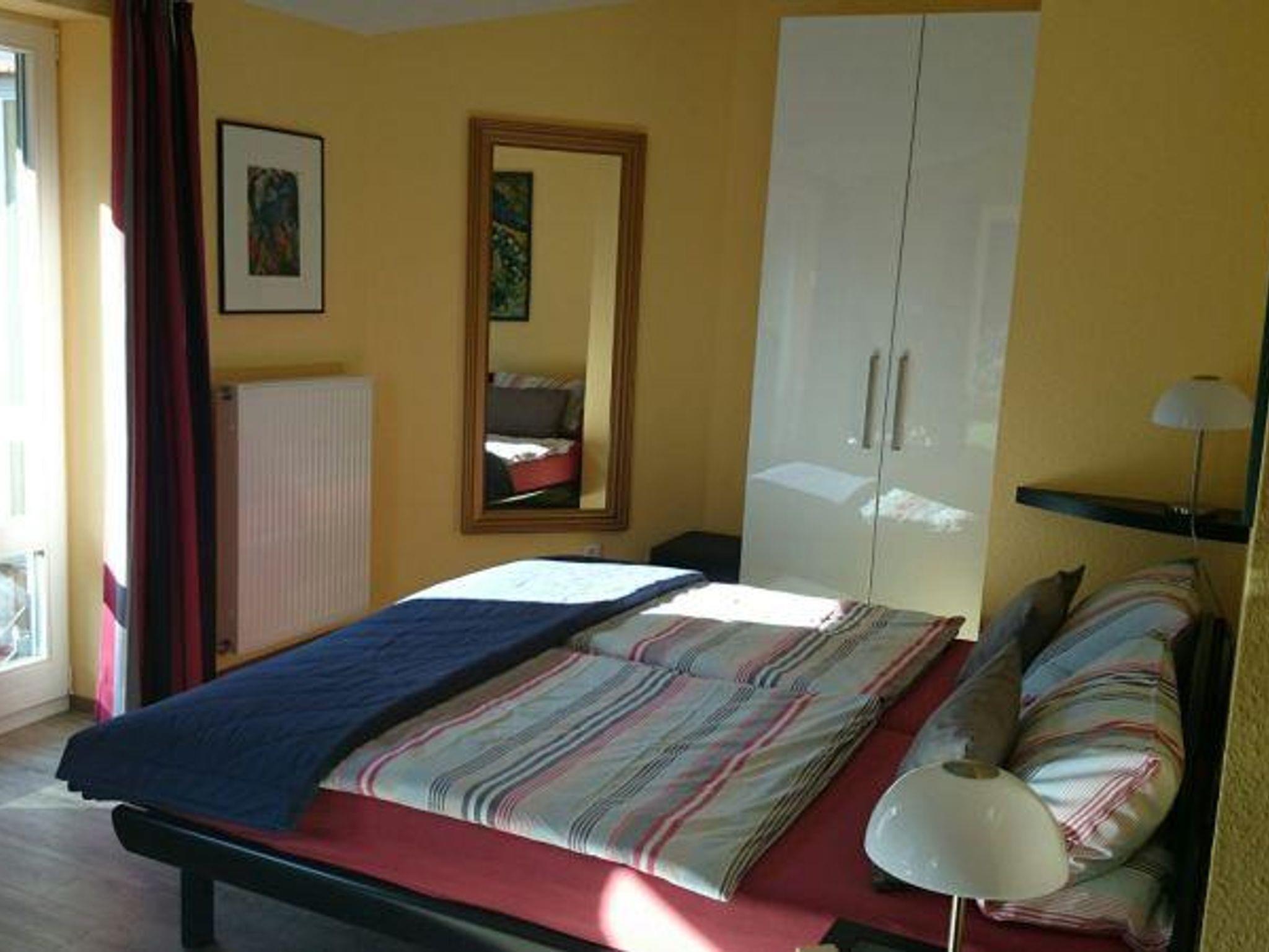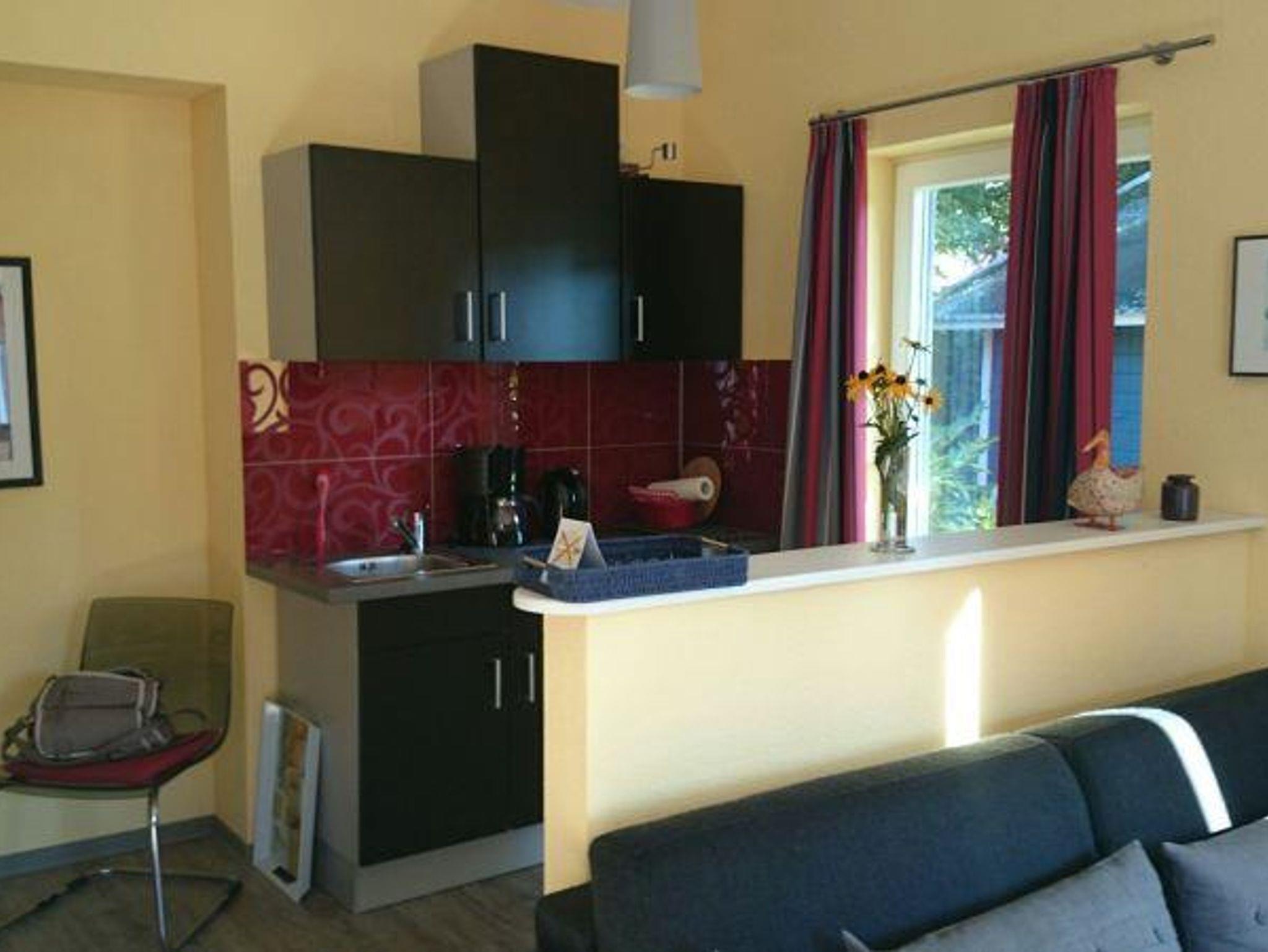 Hochwertige Komfort-Ferienwohnung mit 3 Sternen. Sie verfügt über einen separaten Eingang, eine Terrasse und einen Grillplatz am Gartenteich. Neben dem Eingang befindet sich das Badezimmer mit begehbarer Dusche. Links kommen Sie zur Küche mit Sitzgelegenheiten. Die Küchenzeile und der Wohnbereich sind mit einem Tresen abgetrennt. Neben dem Wohnbereich befindet sich das Schlafzimmer mit Doppelbett und Kleiderschrank. Sie haben direkten Blick auf die Terrasse und den Garten.