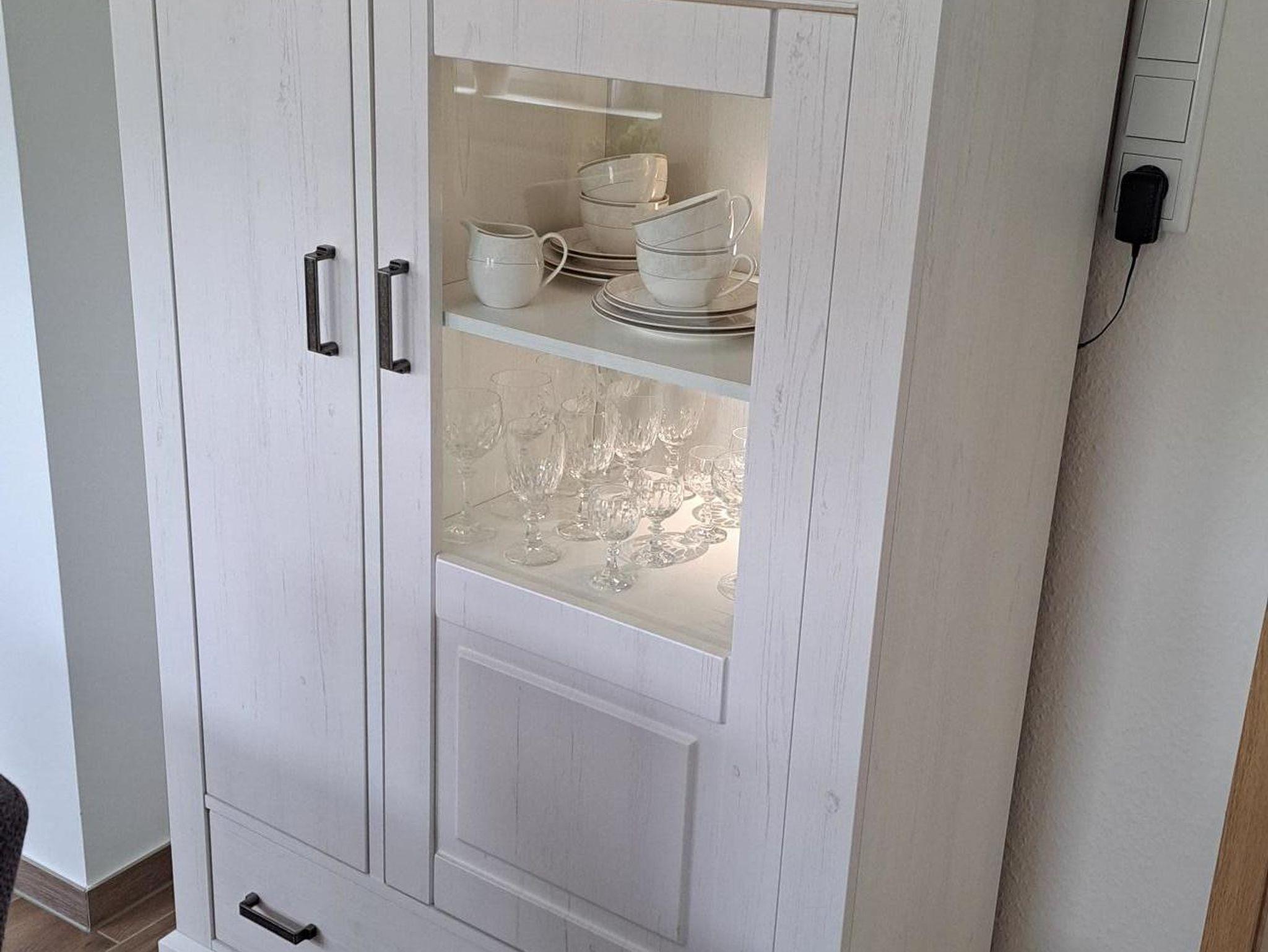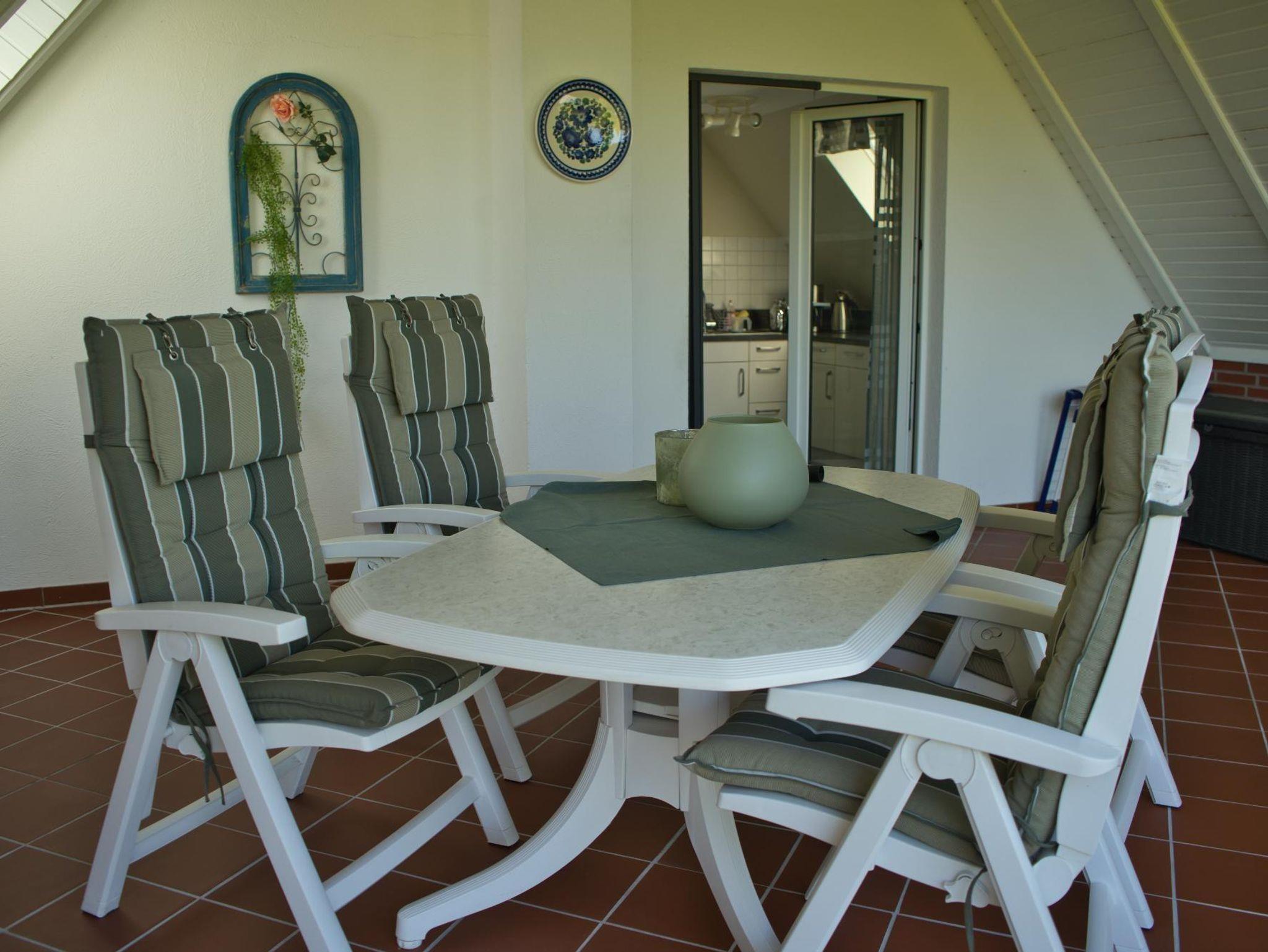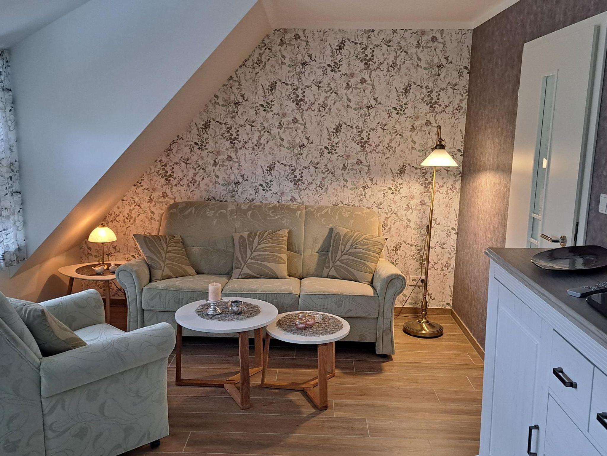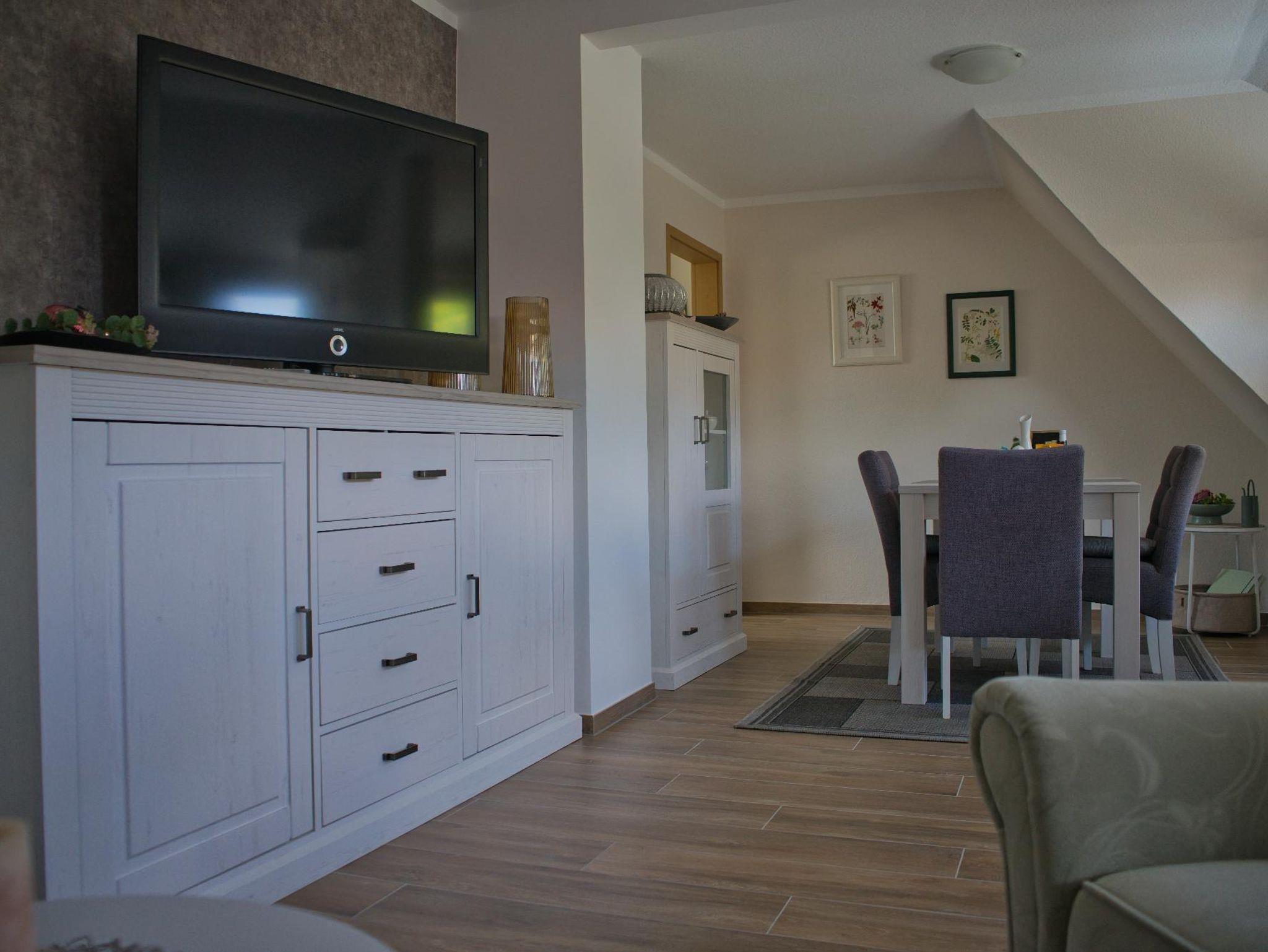 Der offene Wohnbereich verleiht der Wohnung eine gemütliche Atmosphäre. Dort erwartet Sie eine liebevoll eingerichtete Sitzgruppe mit TV und einem einladenden Essbereich. Angrenzend finden Sie eine voll ausgestattete Küche mit Zugang zum großräumigen Balkon, der eine Aussicht auf den schönen Garten bietet.