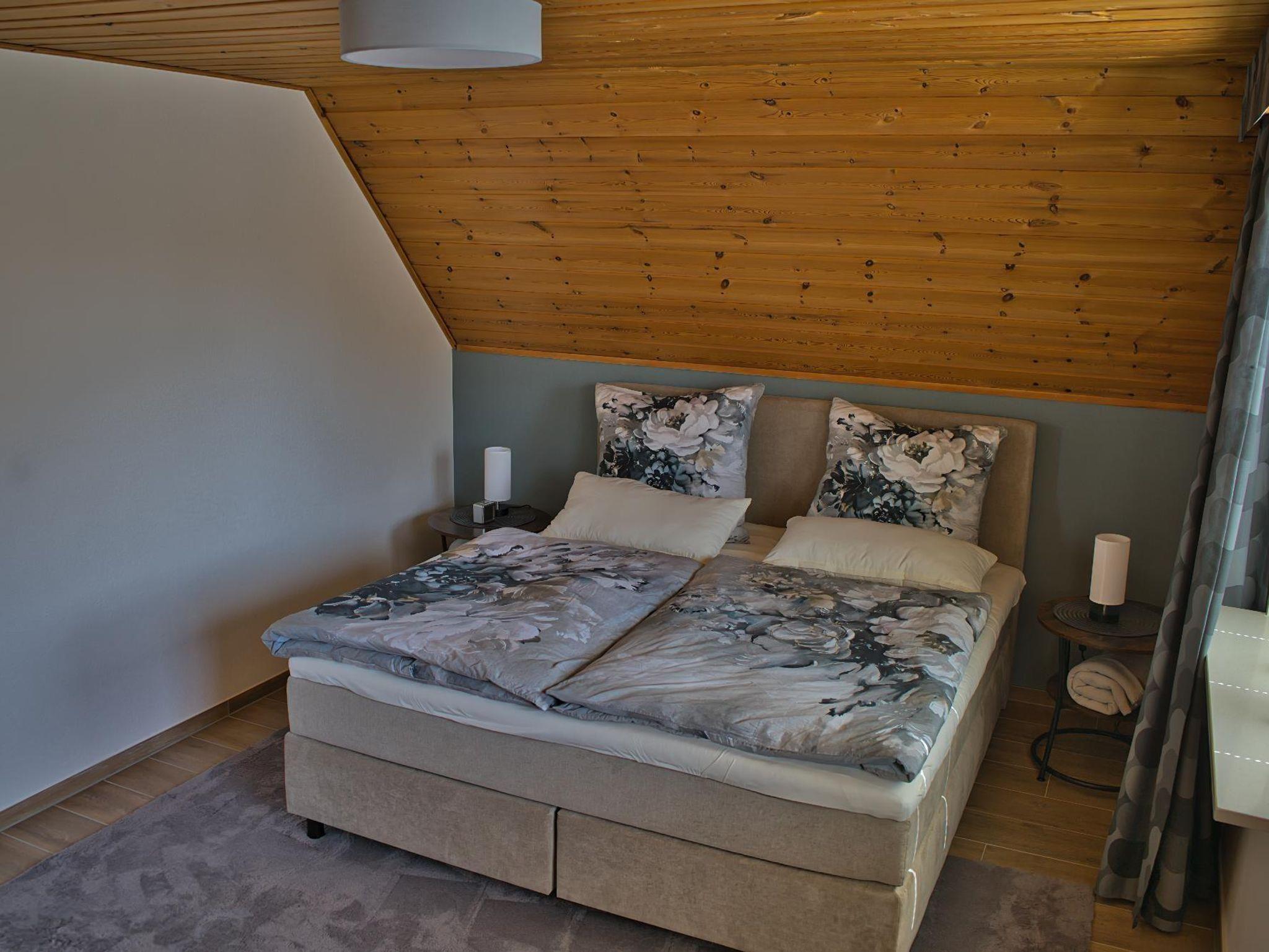 Das Schlafzimmer verfügt über ein großes und komfortables Doppelbett mit einem großzügigen Kleiderschrank. Gegenüber befindet sich das moderne Badezimmer, welches eine ebenerdige Dusche beinhaltet.