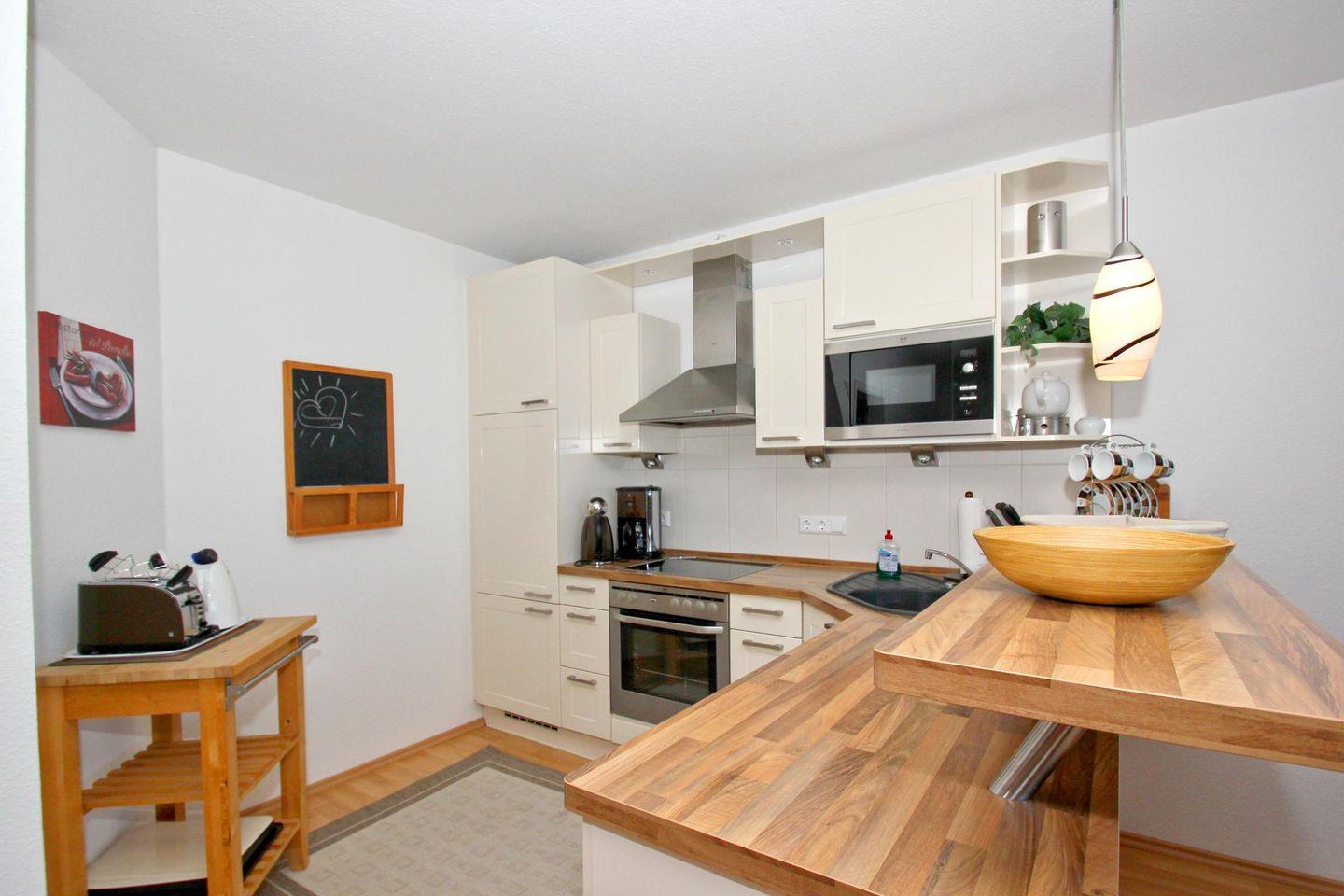 KÜCHE // offene Küche, 4-Platten Ceranherd, Spülmaschine, Kühlschrank mit Gefrierfach, Backofen, Mikrowelle, Toaster, Wasserkocher, Kaffeemaschine, reichlich Besteck, Geschirr und Küchenutensilien ++