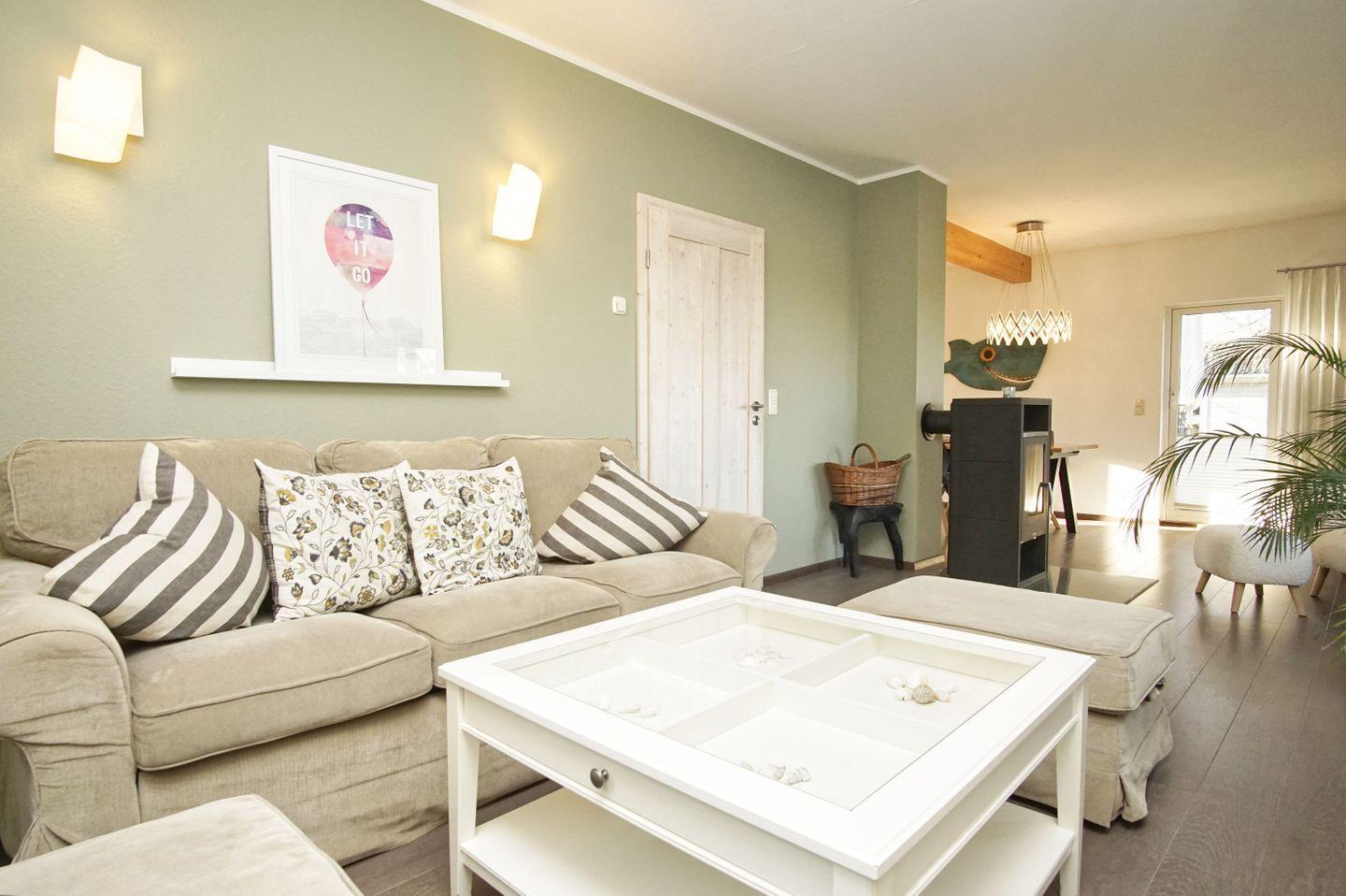 WOHNEN // Wohnraum mit Essbereich, Sitzgarnitur mit bequemer Couch, Kaminofen, Flachbild-TV, CD + DVD-Player ++