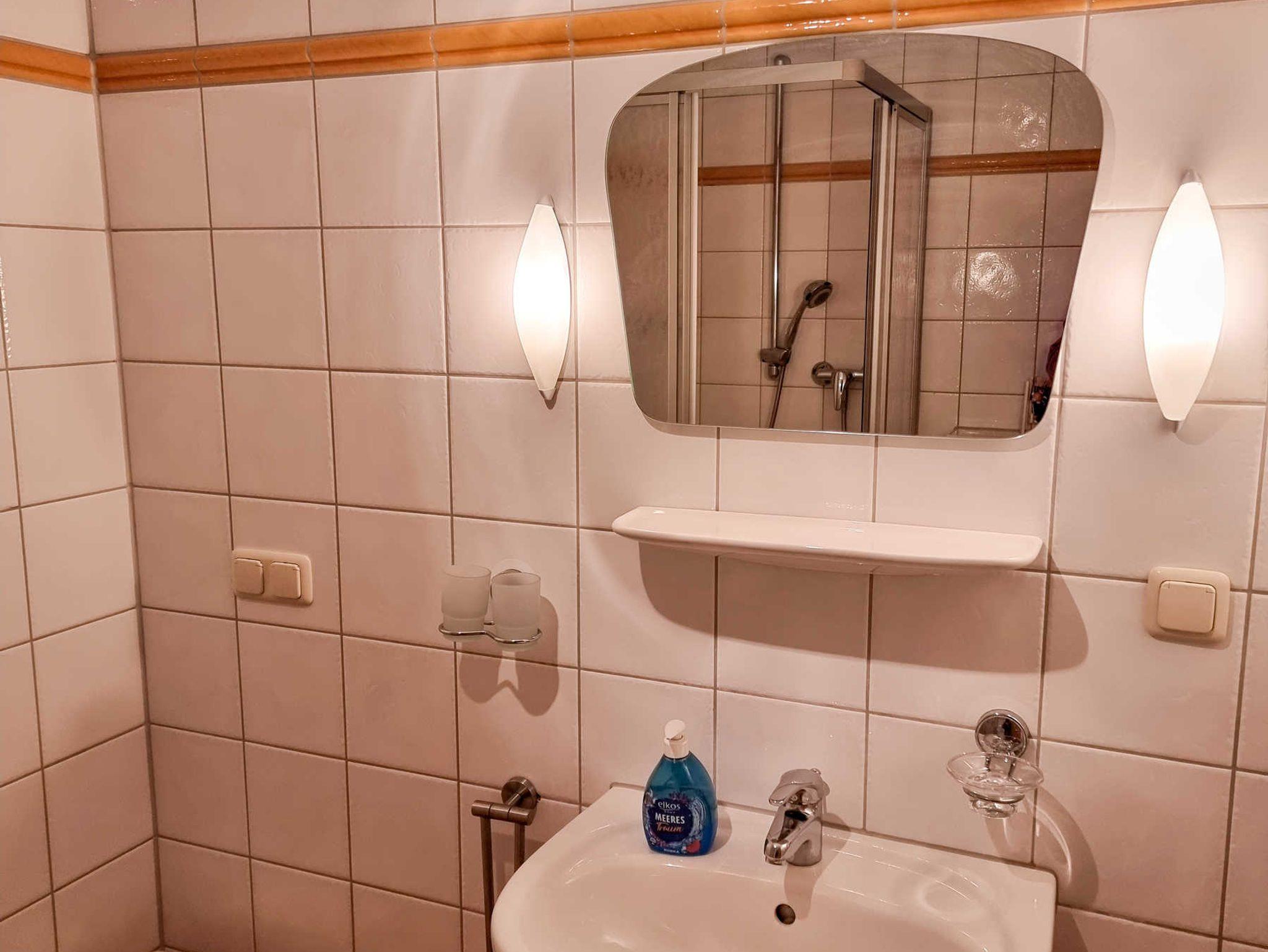 • Badezimmer mit Dusche/WC, Waschbecken und Ablagemöglichkeiten
