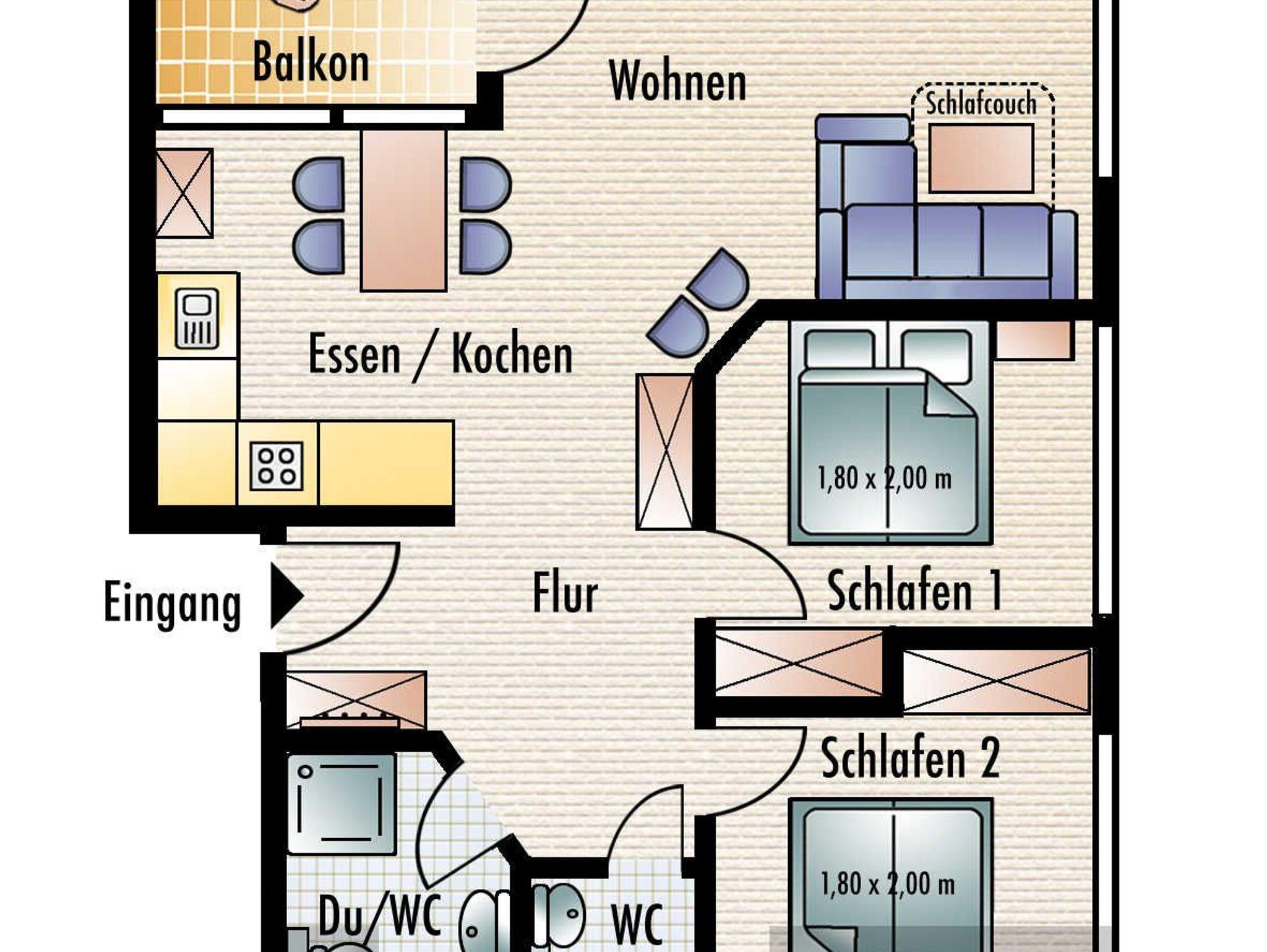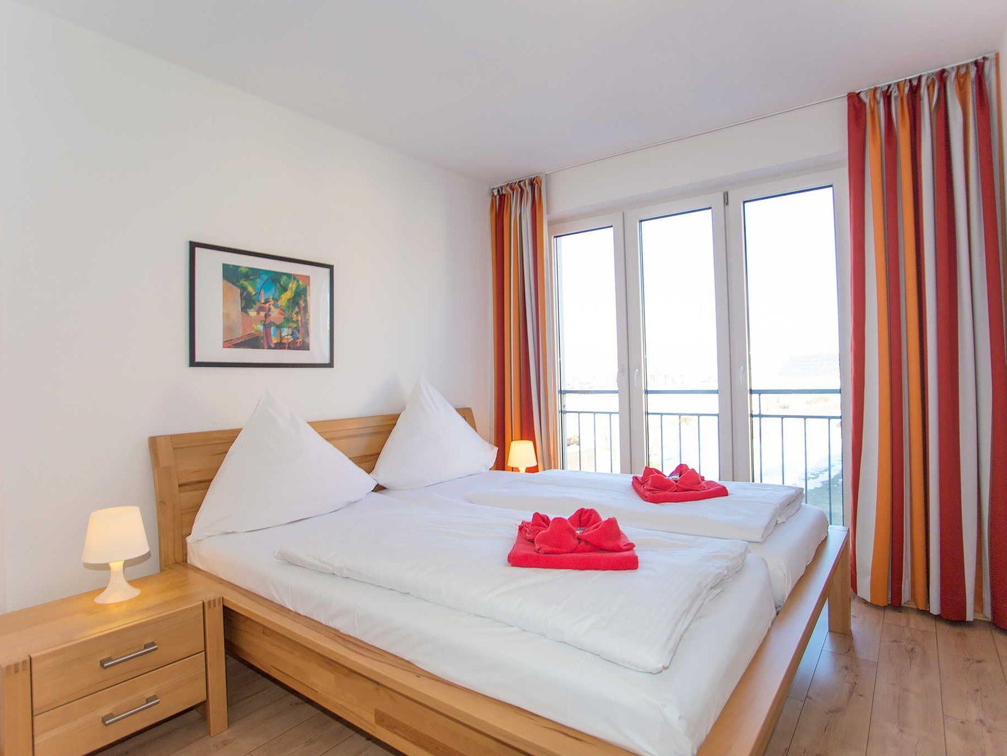 Der Wohnraum ist modern eingerichtet und verfügt über einen großen Flachbild-TV, einem Lowboard, einem Highboard und einer stilvollen ausziehbaren Eckcouch sowie einem großen massiven Esstisch mit passenden Stühlen. Vom Wohnraum ist der Zugang zum großen Balkon gegeben. Die Ferienwohnung verfügt über zwei separate Schlafzimmer mit jeweils einem Doppelbett (2,00 x 1,80m, einzelnen 21cm dicken Komfort-Kaltschaum-Matratzen sowie sehr guten Lattenrosten) und jeweils einen großen Kleiderschrank. Von den Schlafzimmern hat man ebenfalls einen Blick auf den Wieker Hafen.