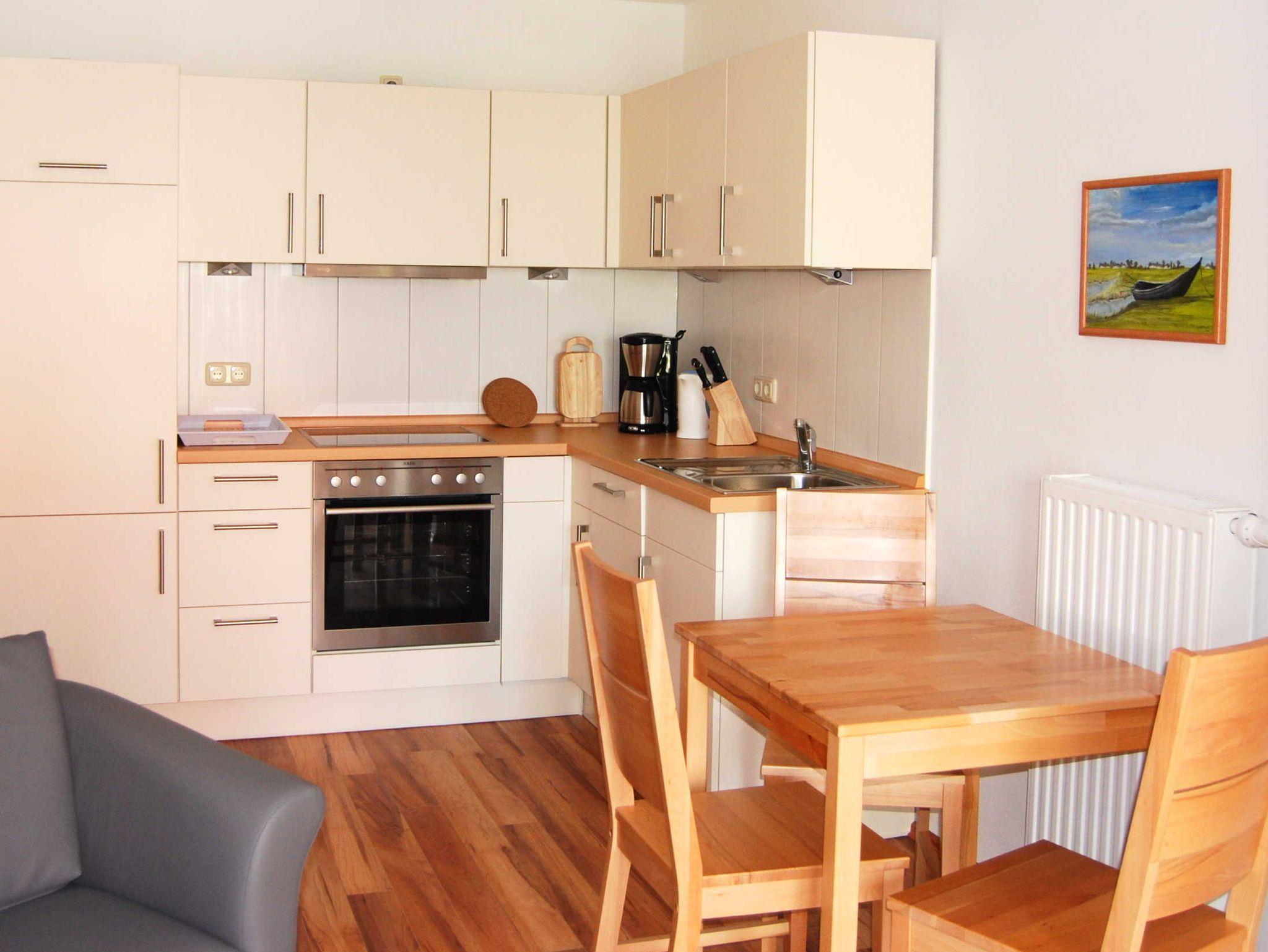 Die Küche (offen) ist mit AEG-Geräten ausgestattet: Geschirrspüler, Backofen, 4-Platten-Ceranfeld. Der große Kühlschrank mit Gefrierfach ist von Privileg. Die Küche ist weiterhin mit Toaster, Kaffeemaschine, Wasserkocher, Messerblock, Töpfe, Pfanne sowie ausreichend Geschirr und Besteck ausgestattet.