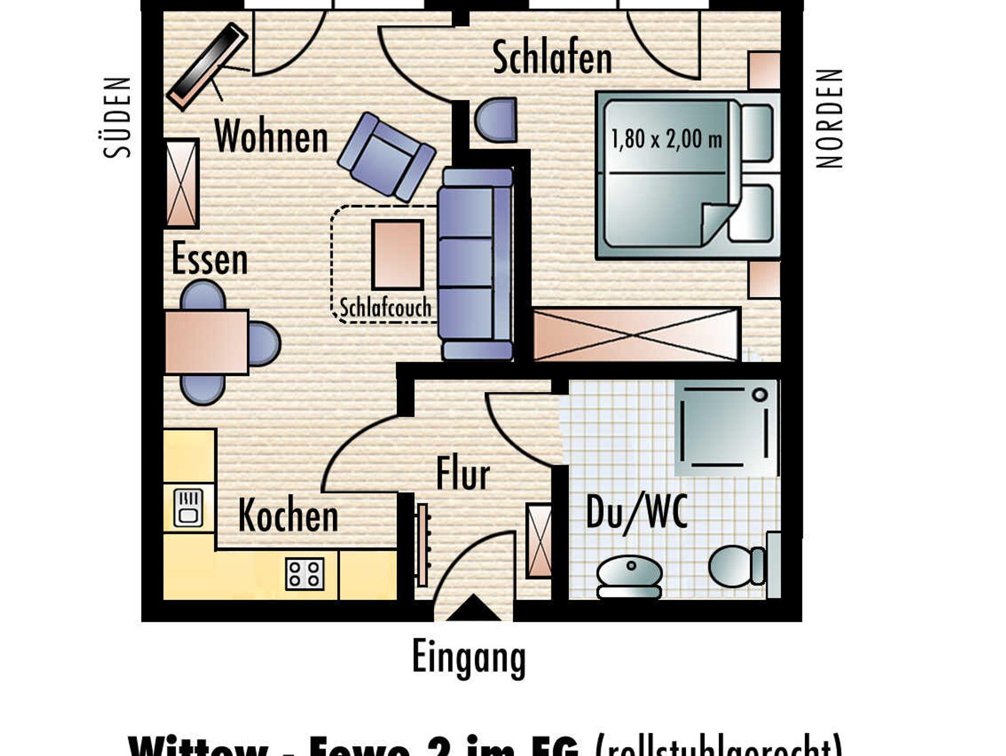Die modern, hell, individuell und rollstuhlgerecht ausgestattete ca. 40qm große 2-Raum-Ferienwohnung in Wiek befindet sich im Erdgeschoss in der Villa Wittow im Ort Wiek auf der Insel Rügen. Vom Wohn- und Schlafraum gibt es direkten Zugang zur großen Terrasse, von der aus man einen Blick durch die Gärten der benachbarten Wohnhäuser hat.