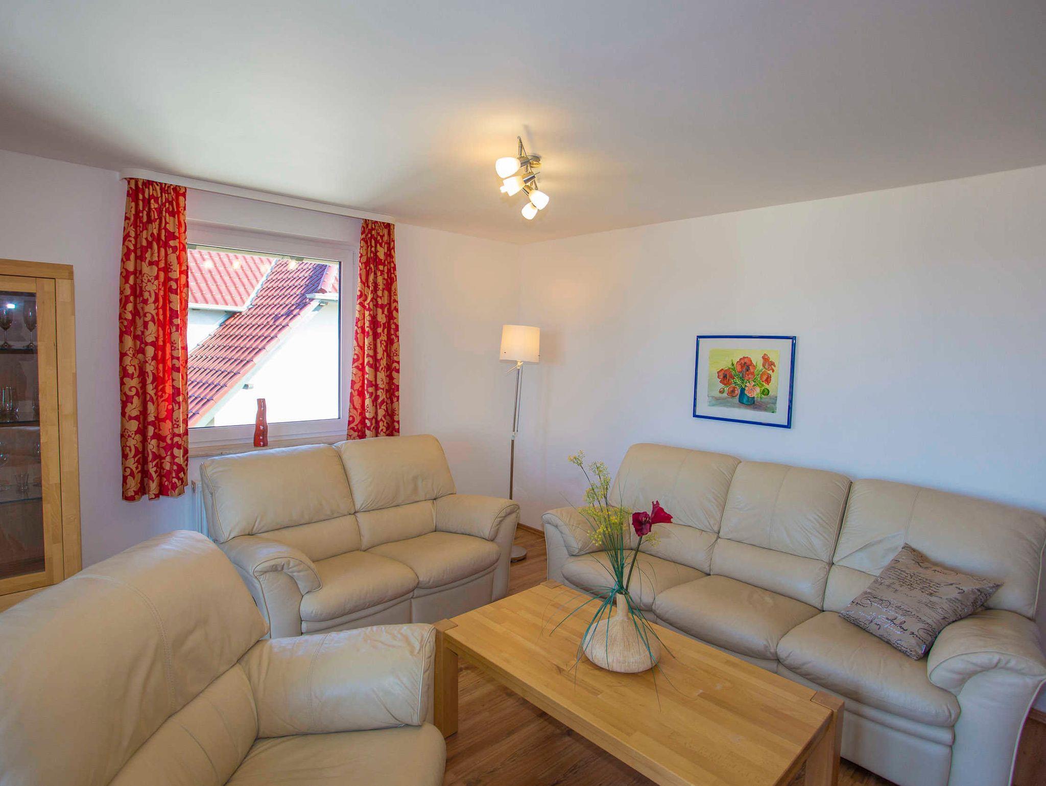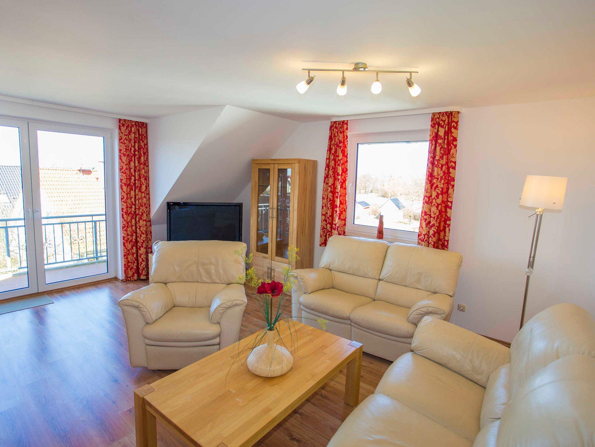 Der Wohnraum ist modern eingerichtet und verfügt über einen großen Flachbild-TV, einem Lowboard und Highboard sowie einer hellen Kunstledercouch (3-er Sofa, 2-er Sofa und verstellbarem Sofasessel) und einem großen massiven Esstisch mit passenden Holzstühlen. Vom Wohnraum ist der Zugang zum Balkon gegeben, von wo aus Sie einen tollen Blick auf den Wieker Bodden haben.