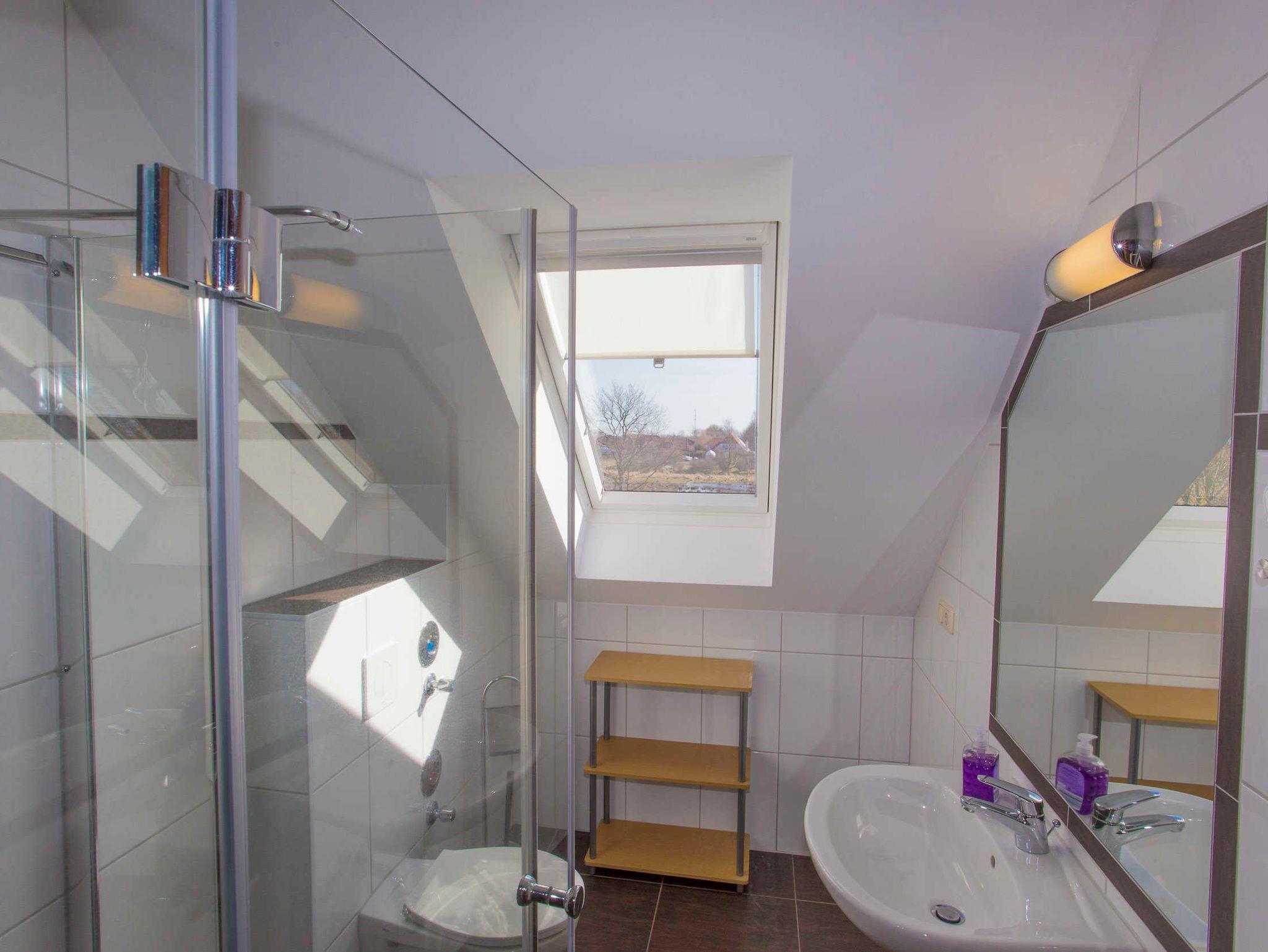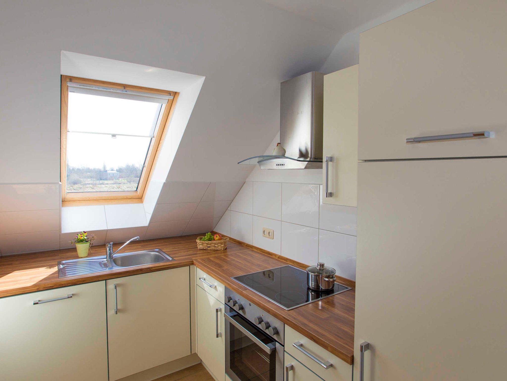 Die Küche ist mit AEG-Geräten ausgestattet: Geschirrspüler, Backofen, 4-Platten-Ceranfeld. Der große Kühlschrank mit Gefrierfach ist von Privileg. Die Küche ist weiterhin mit Toaster, Kaffeemaschine, Wasserkocher, Messerblock, Töpfe, Pfanne sowie ausreichend Geschirr und Besteck ausgestattet. Das separate Bad mit ebenerdiger Glasdusche, WC, Waschbecken und großem Spiegel hat ein großes Dachfenster mit Ausblick in das Grüne.