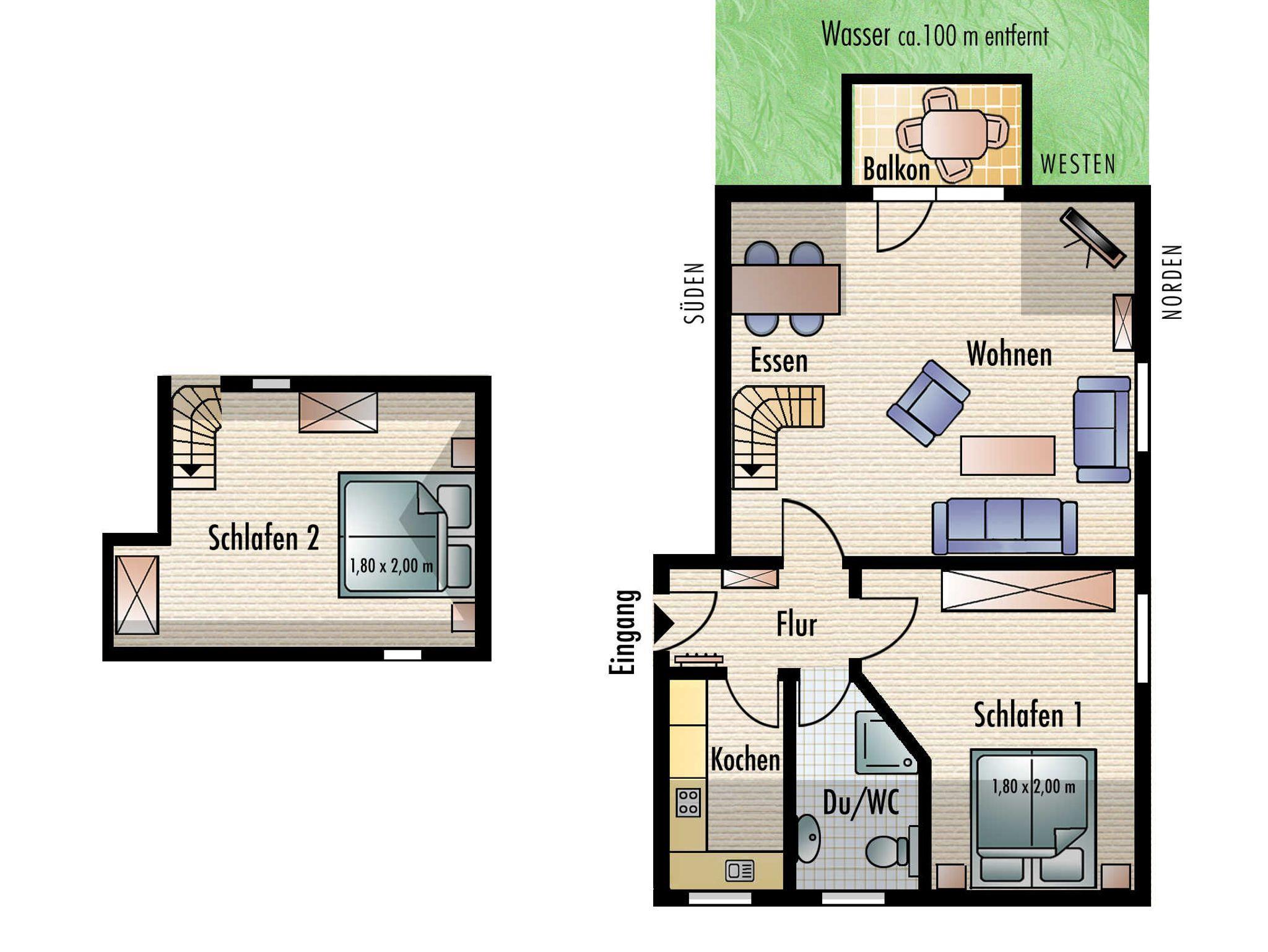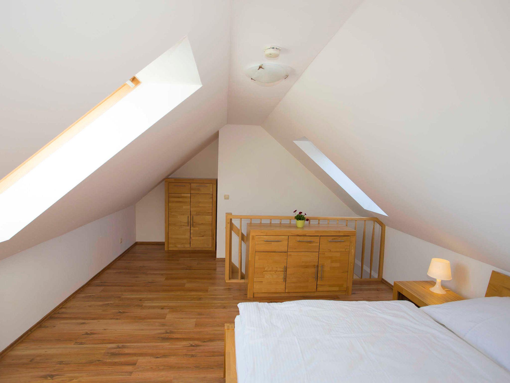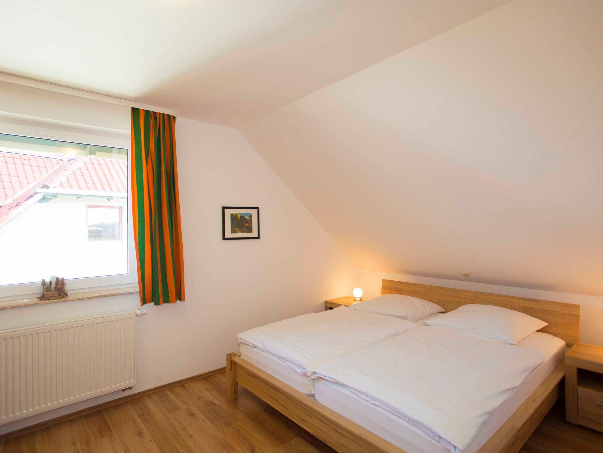 Die Ferienwohnung verfügt über zwei separate Schlafzimmer mit jeweils einem Doppelbett (2,00 x 1,80m, einzelnen 21cm dicken Komfort-Kaltschaum-Matratzen sowie sehr guten Lattenrosten). Ein Schlafzimmer befindet sich im Dachausbau und ist über eine offene Treppe vom Wohnzimmer aus zu erreichen. Es ist mit einem Sideboard ausgestattet. Im zweiten, separaten Schlafzimmer befindet sich ein großer Kleiderschrank.