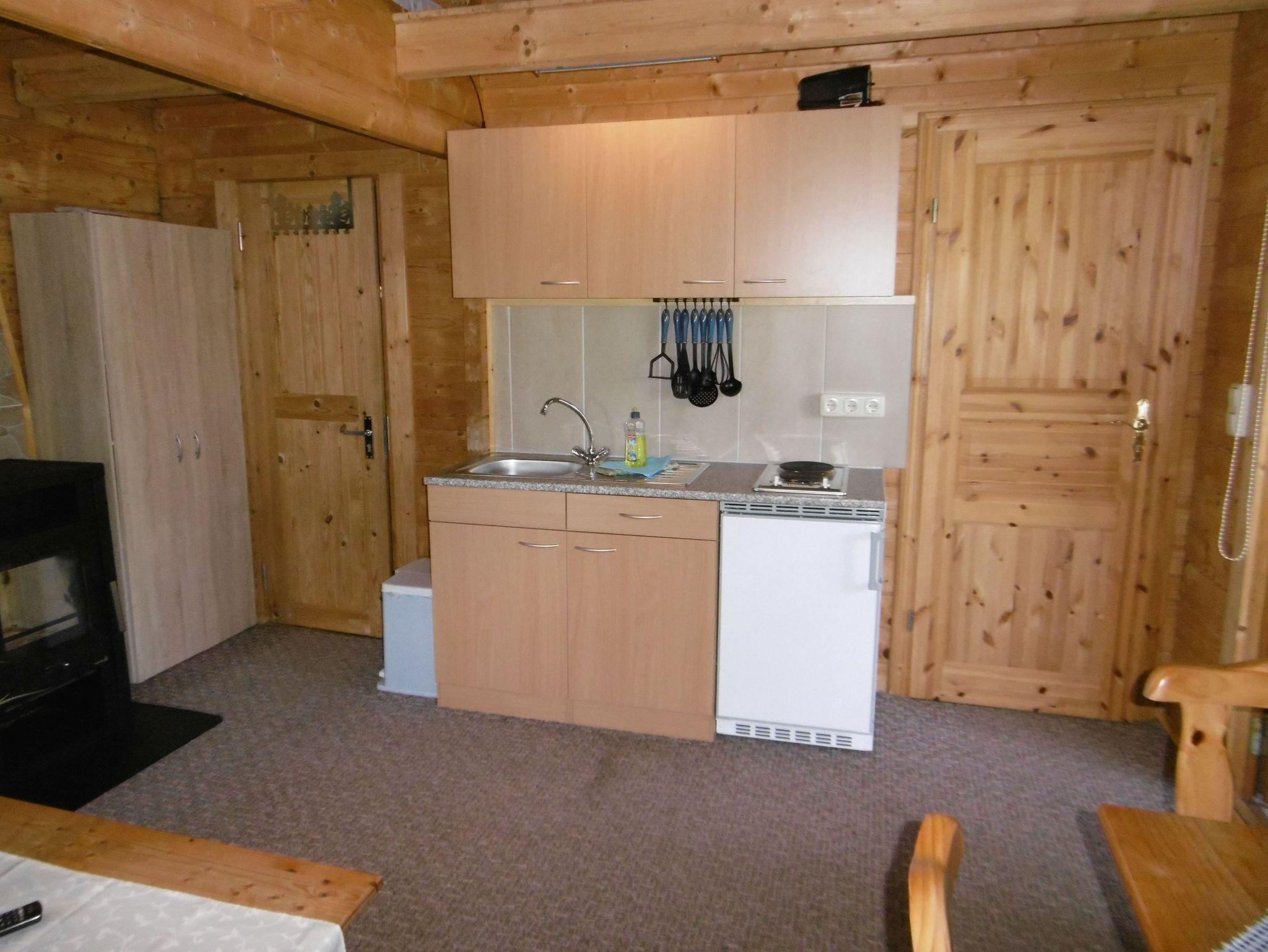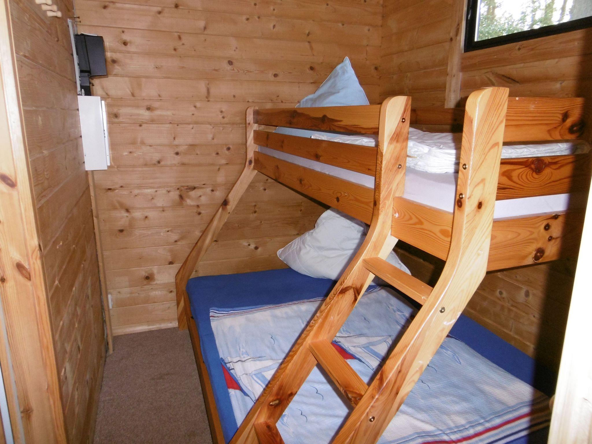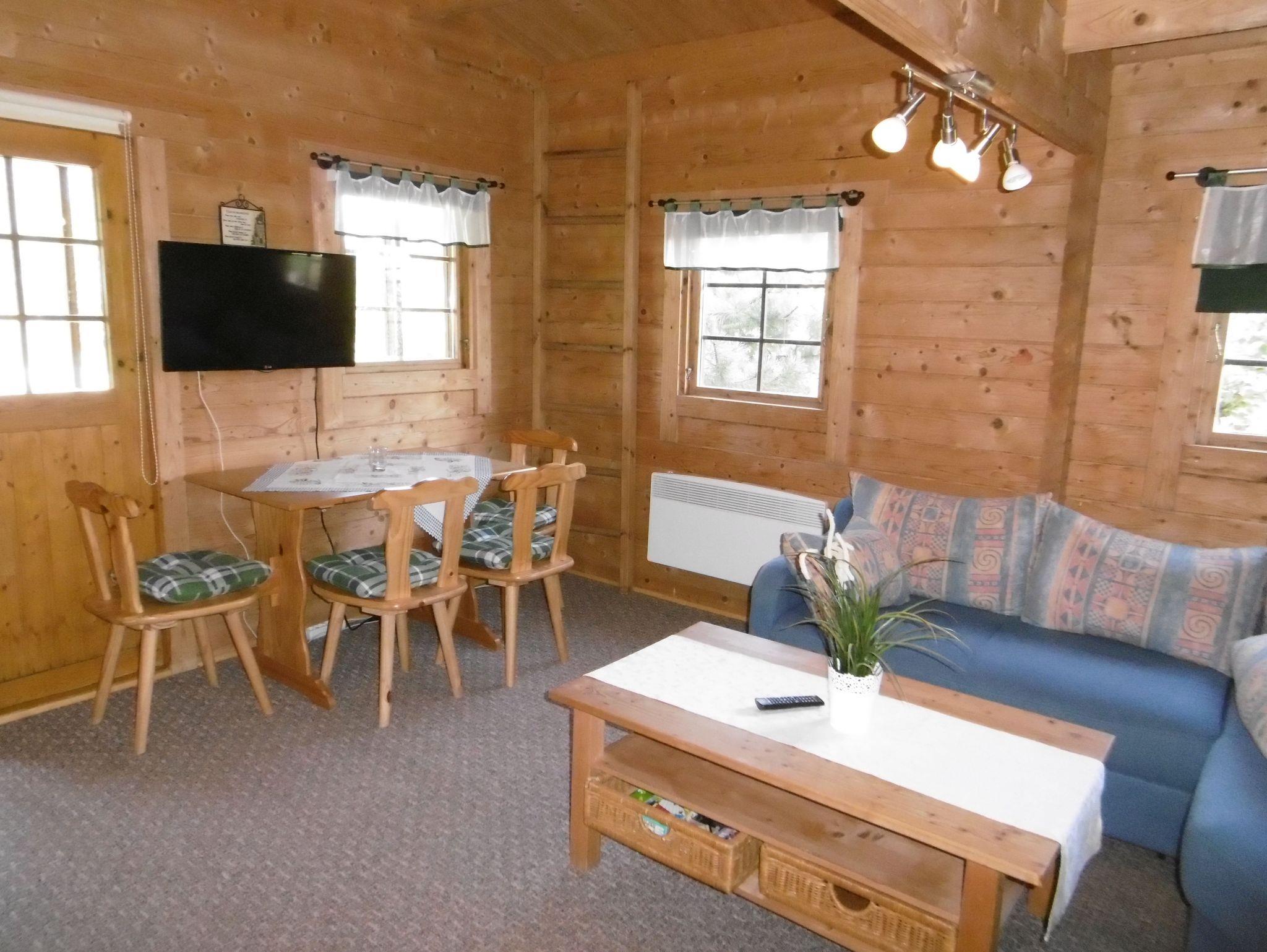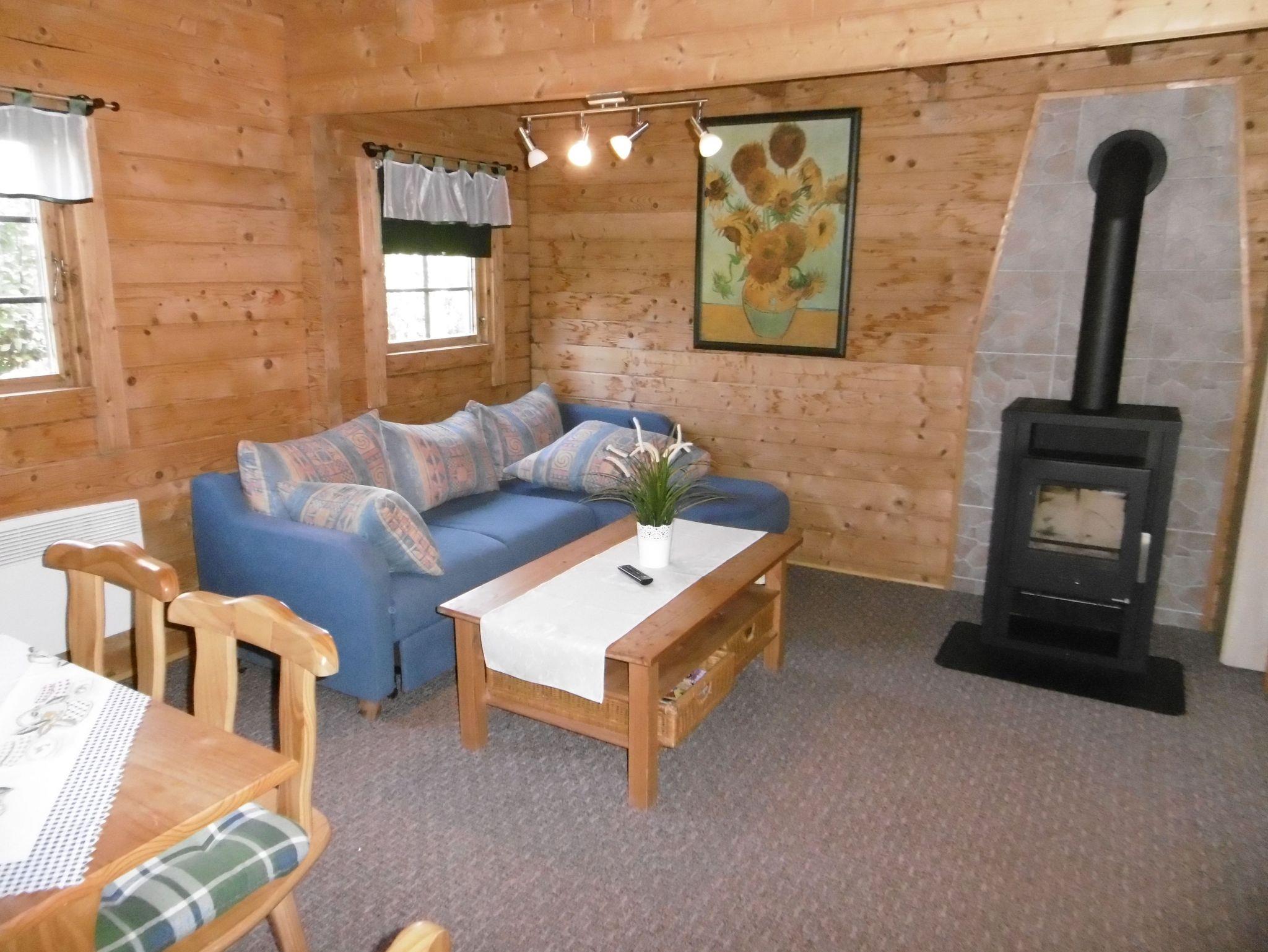 Im Erdgeschoss des Holzblock- Ferienhauses befindet sich ein Wohnraum mit Kochnische, Kamin und Sitzgruppe, das Schlafzimmer mit Doppelbett (Etagenbett für 3 Personen) sowie ein Schlafzimmer mit einem Einzelbett (TV) sowie das Bad mit DU/WC. Vom Wohnzimmer aus gelangen Sie über eine Treppe in den offenen Schlafboden. Ein Wintergarten und das großzügige Grundstück laden zur aktiven Erhohlung ein. --Vermietung nur Anfang Mai bis Ende September--.