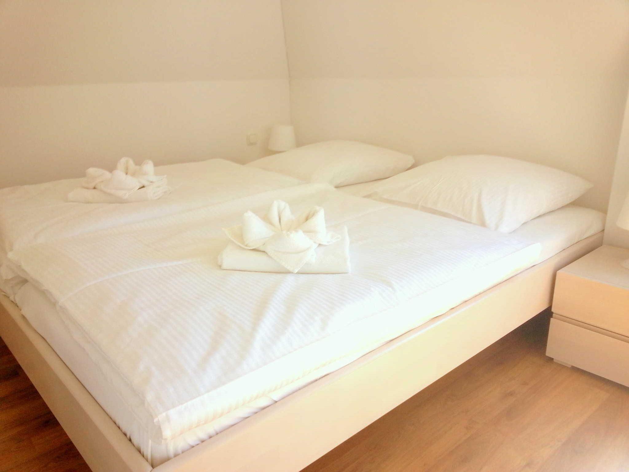 Die Ferienwohnung verfügt über ein Schlafzimmer mit einem Doppelbett (2,00 x 1,80m, einzelnen 21cm dicken Komfort-Kaltschaum-Matratzen sowie sehr guten Lattenrosten) und einem großen Kleiderschrank.