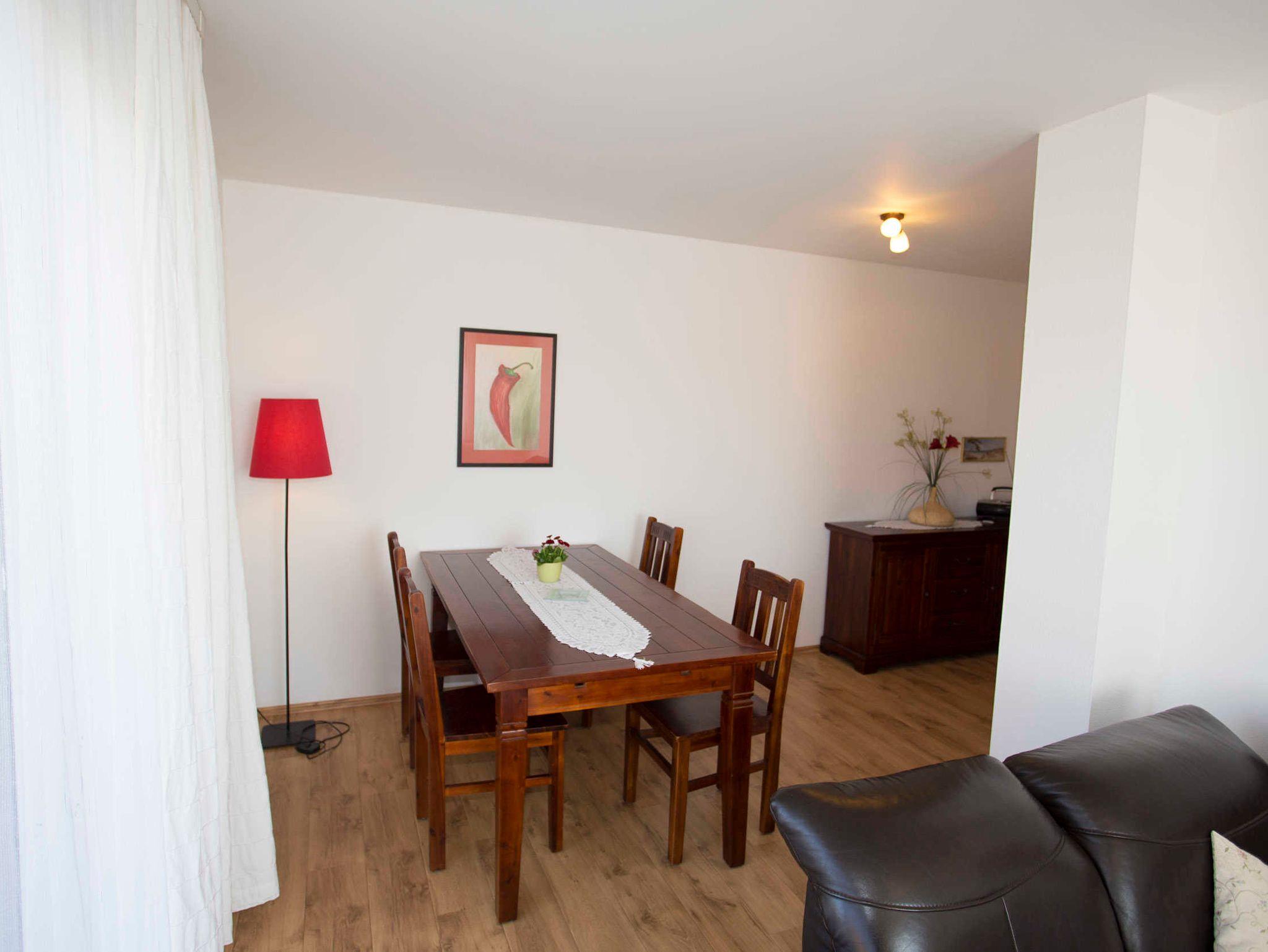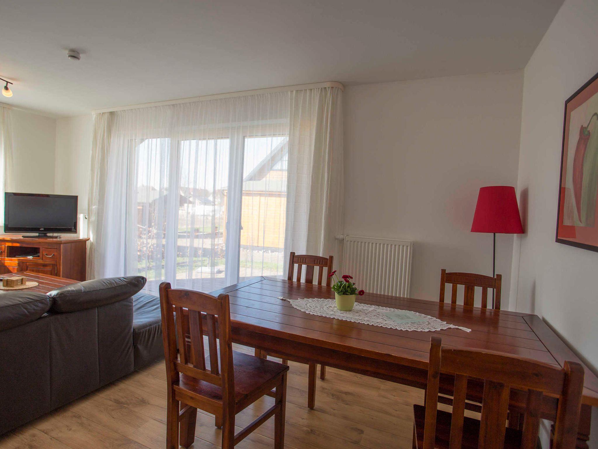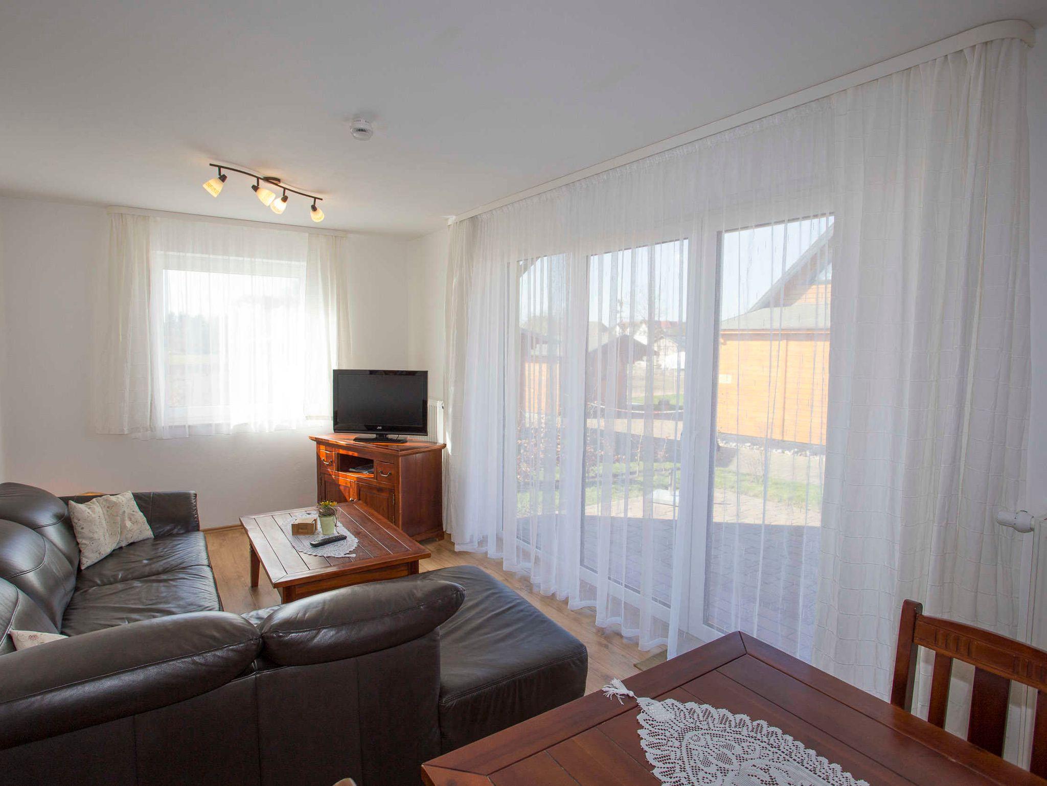 Der Wohnraum ist geschmackvoll eingerichtet und verfügt über einen Flachbild-TV, einem Lowboard sowie einer ausziehbaren schwarzen Ledercouch und einem großen massiven Holzesstisch mit 6 Stühlen. Vom Wohnraum ist der Zugang zur großen Terrasse gegeben. Die Ferienwohnung verfügt über zwei separate Schlafzimmer mit jeweils einem Doppelbett (2,00 x 1,80m, einzelnen 21cm dicken Komfort-Kaltschaum-Matratzen sowie sehr guten Lattenrosten) und jeweils einen großen Kleiderschrank.