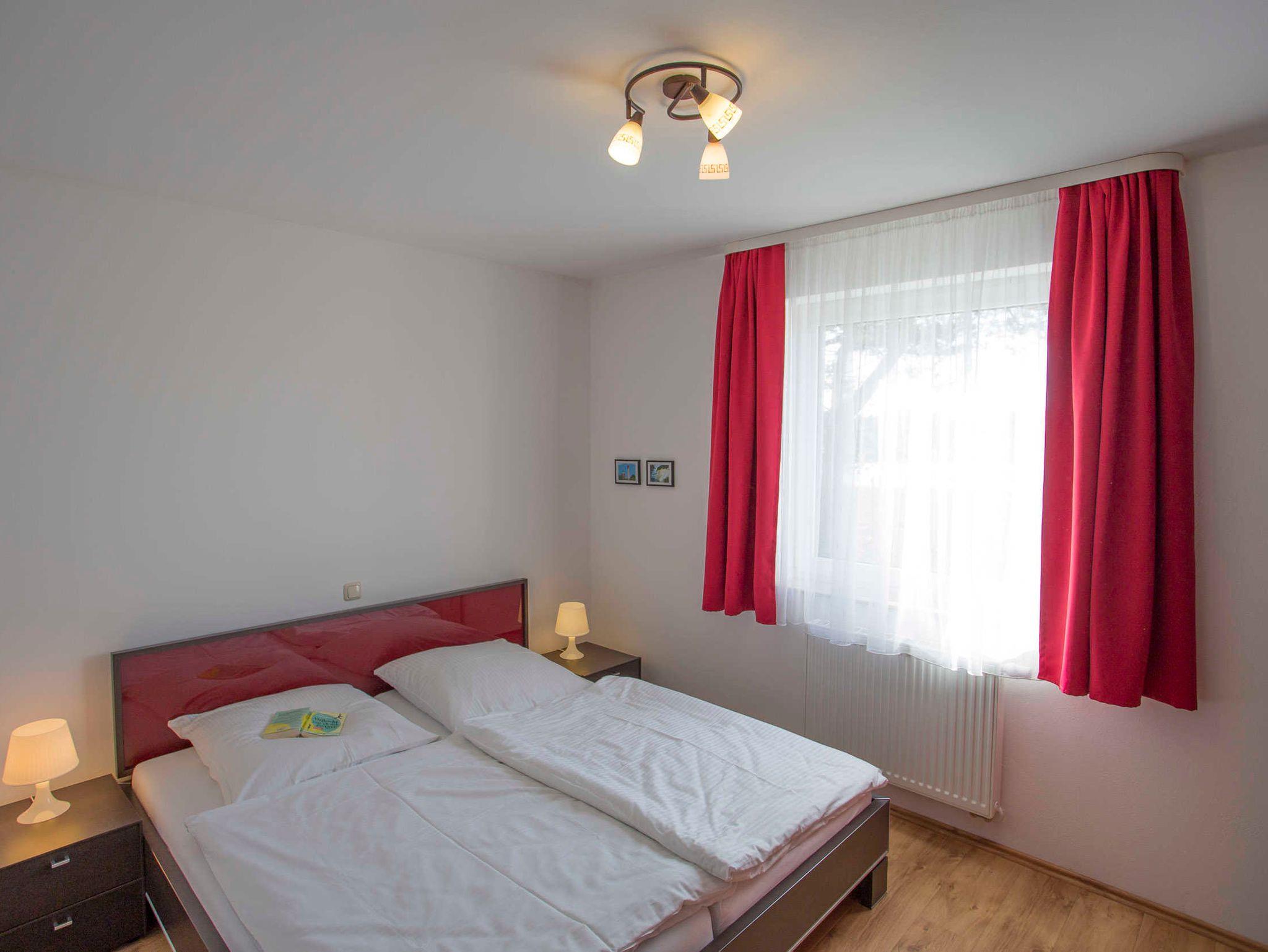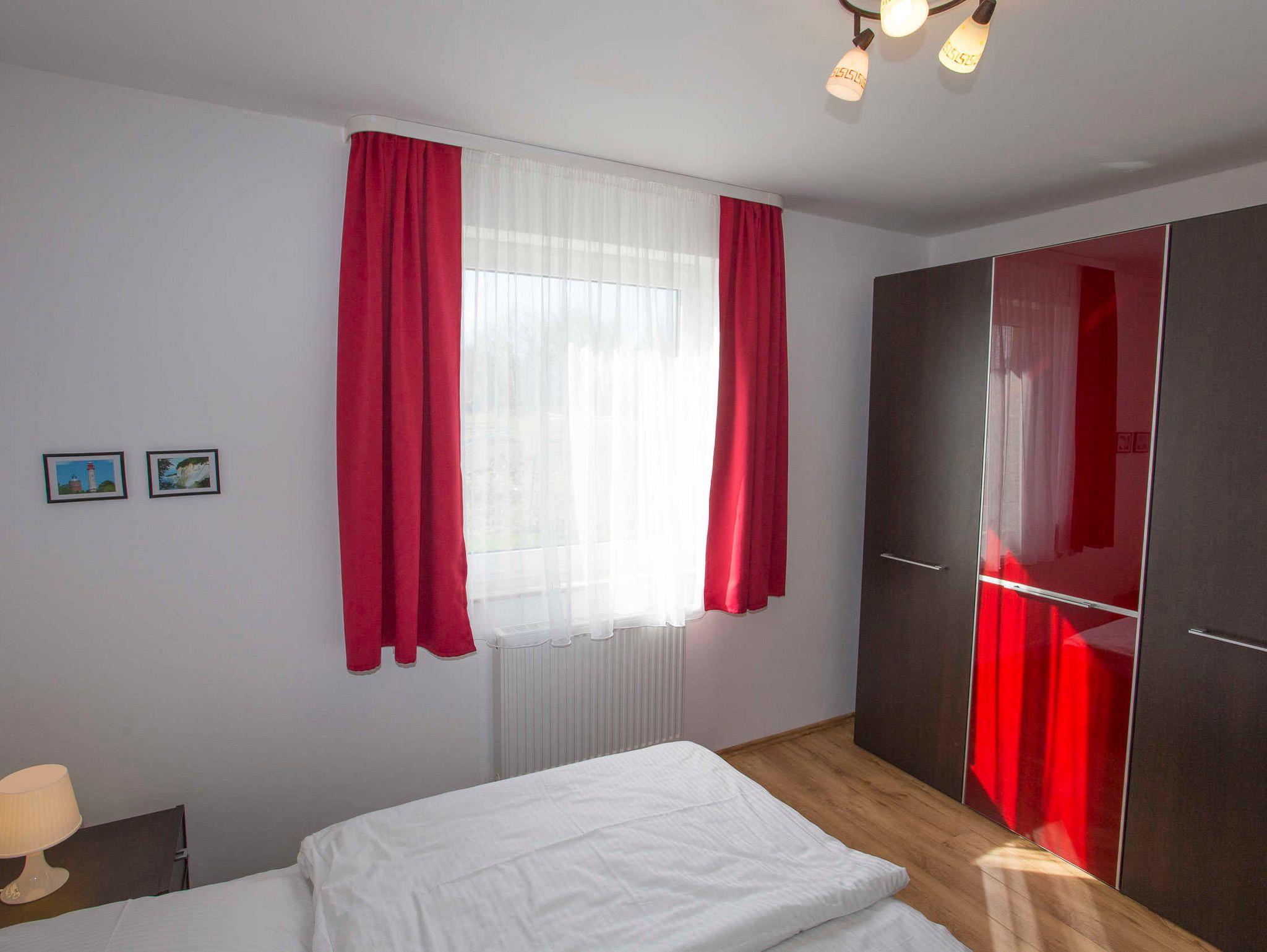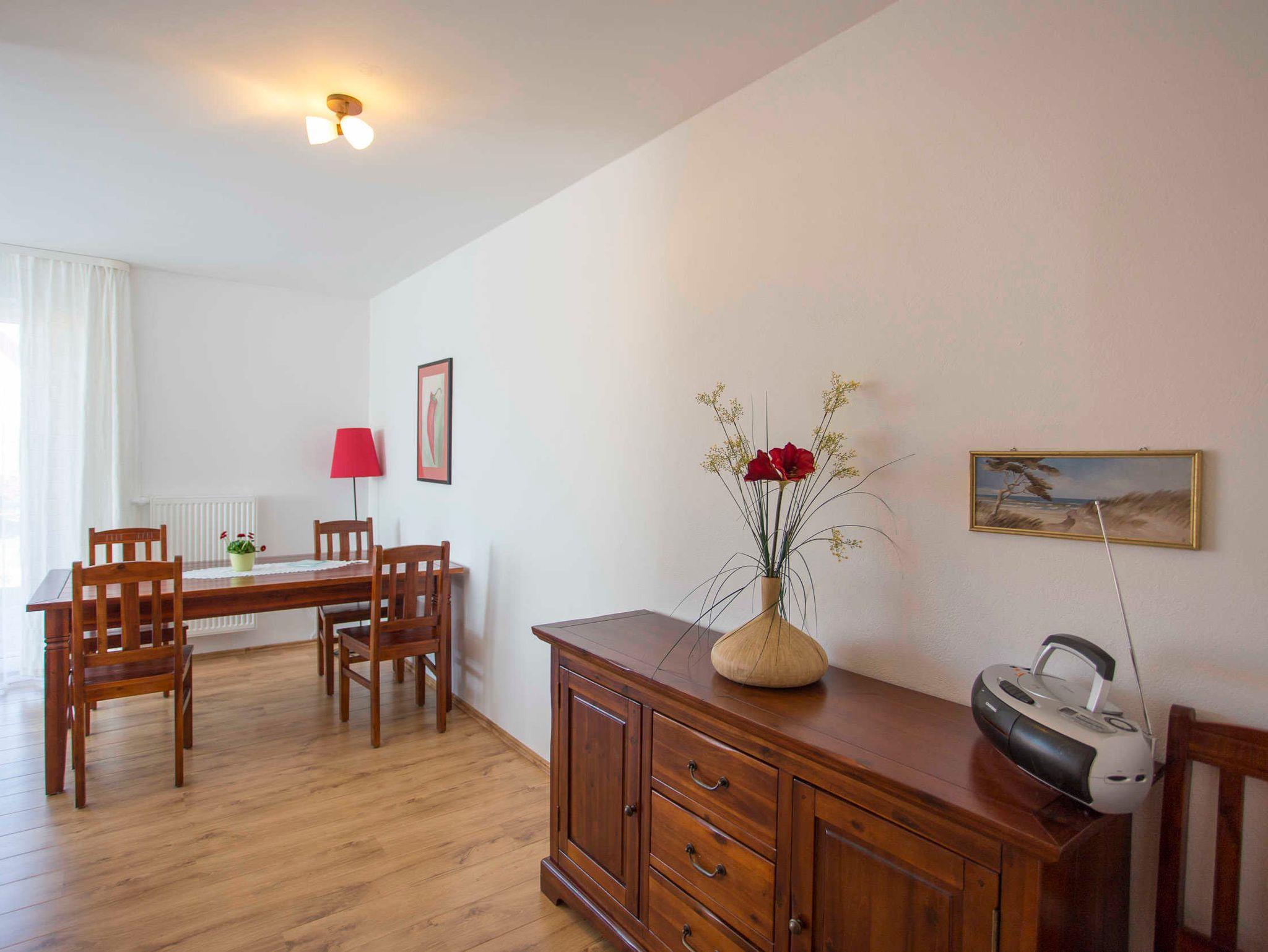 Der Wohnraum ist geschmackvoll eingerichtet und verfügt über einen Flachbild-TV, einem Lowboard sowie einer ausziehbaren schwarzen Ledercouch und einem großen massiven Holzesstisch mit 6 Stühlen. Vom Wohnraum ist der Zugang zur großen Terrasse gegeben. Die Ferienwohnung verfügt über zwei separate Schlafzimmer mit jeweils einem Doppelbett (2,00 x 1,80m, einzelnen 21cm dicken Komfort-Kaltschaum-Matratzen sowie sehr guten Lattenrosten) und jeweils einen großen Kleiderschrank.