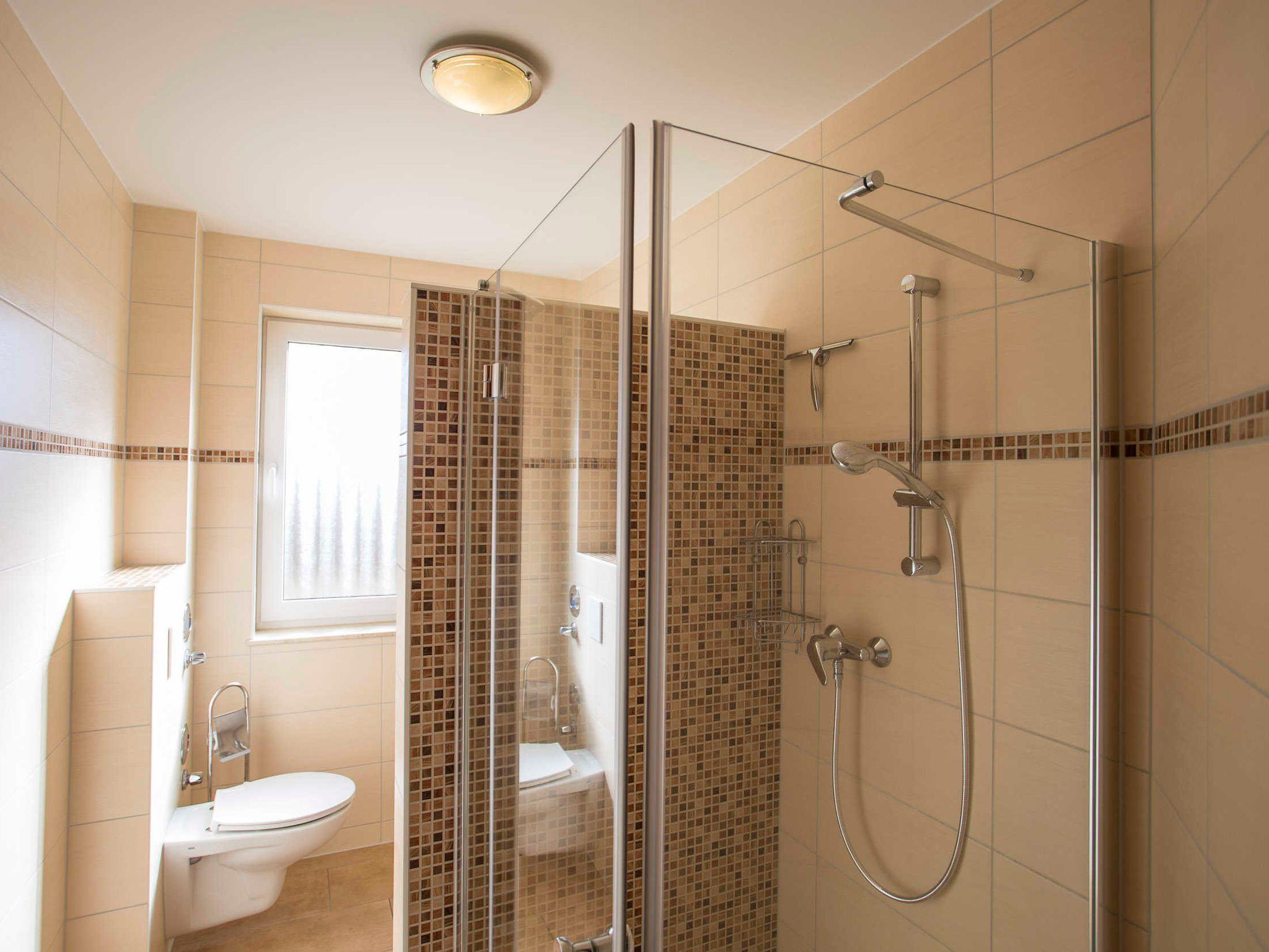 Das Bad verfügt über ein Fenster. Es ist mit einer ebenerdigen Glasdusche, WC, Waschbecken und einem großen Spiegel ausgestattet.