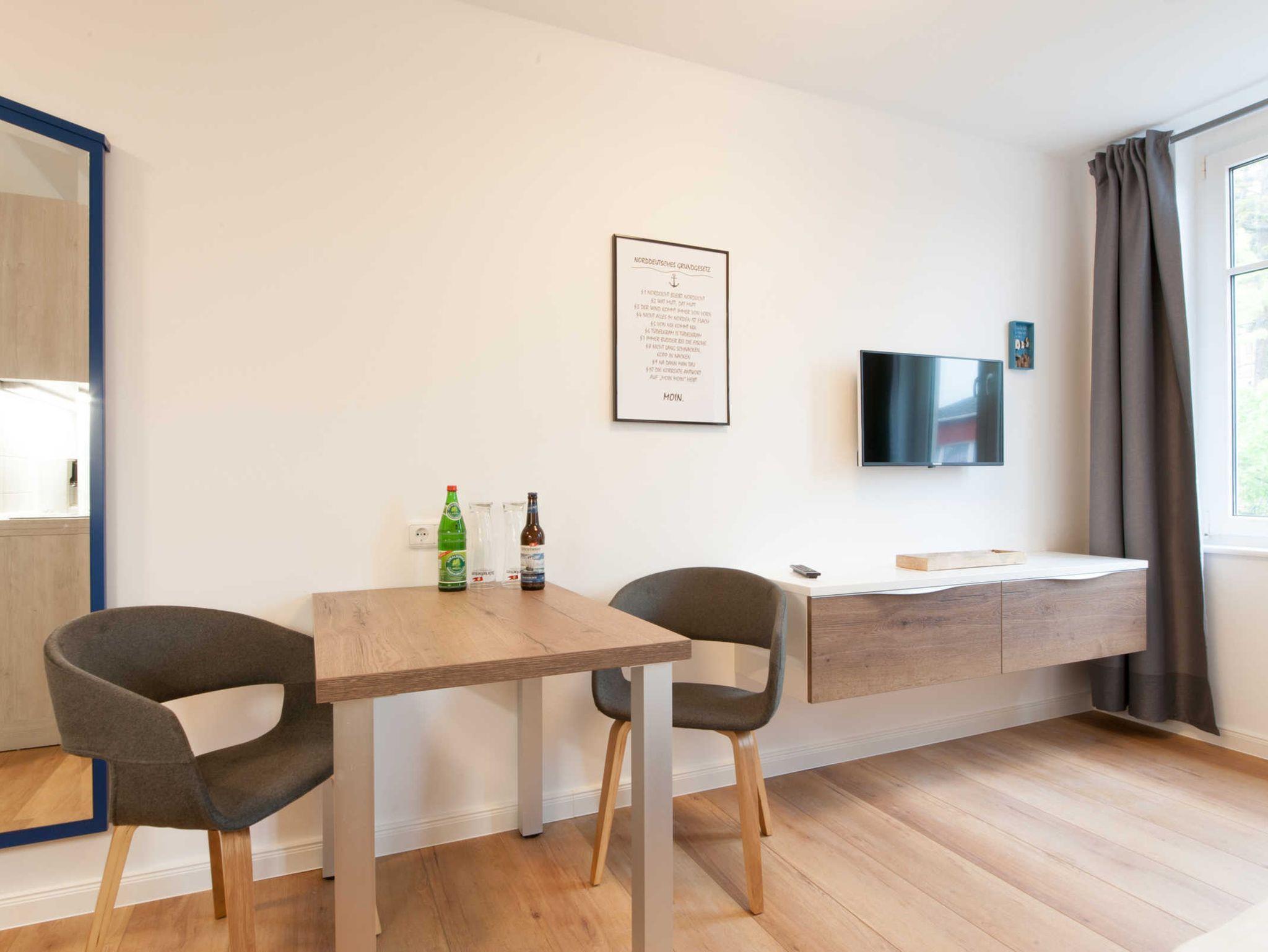 Die Küche verfügt über ein 2-fach Ceranfeld, Mikrowelle, Kühlschrank mit kleiner Gefriermöglichkeit, Kaffeepresse, Toaster und Wasserkocher. Das Bad ist mit Dusche ausgestattet. Das Appartement hat selbstverständlich kostenlos WLAN/Internet, ein SMART-TV, sodass Mediatheken/youtube geschaut werden können und mit einer Spielesammlung kann man den Abend gemütlich ausklingen lassen.
