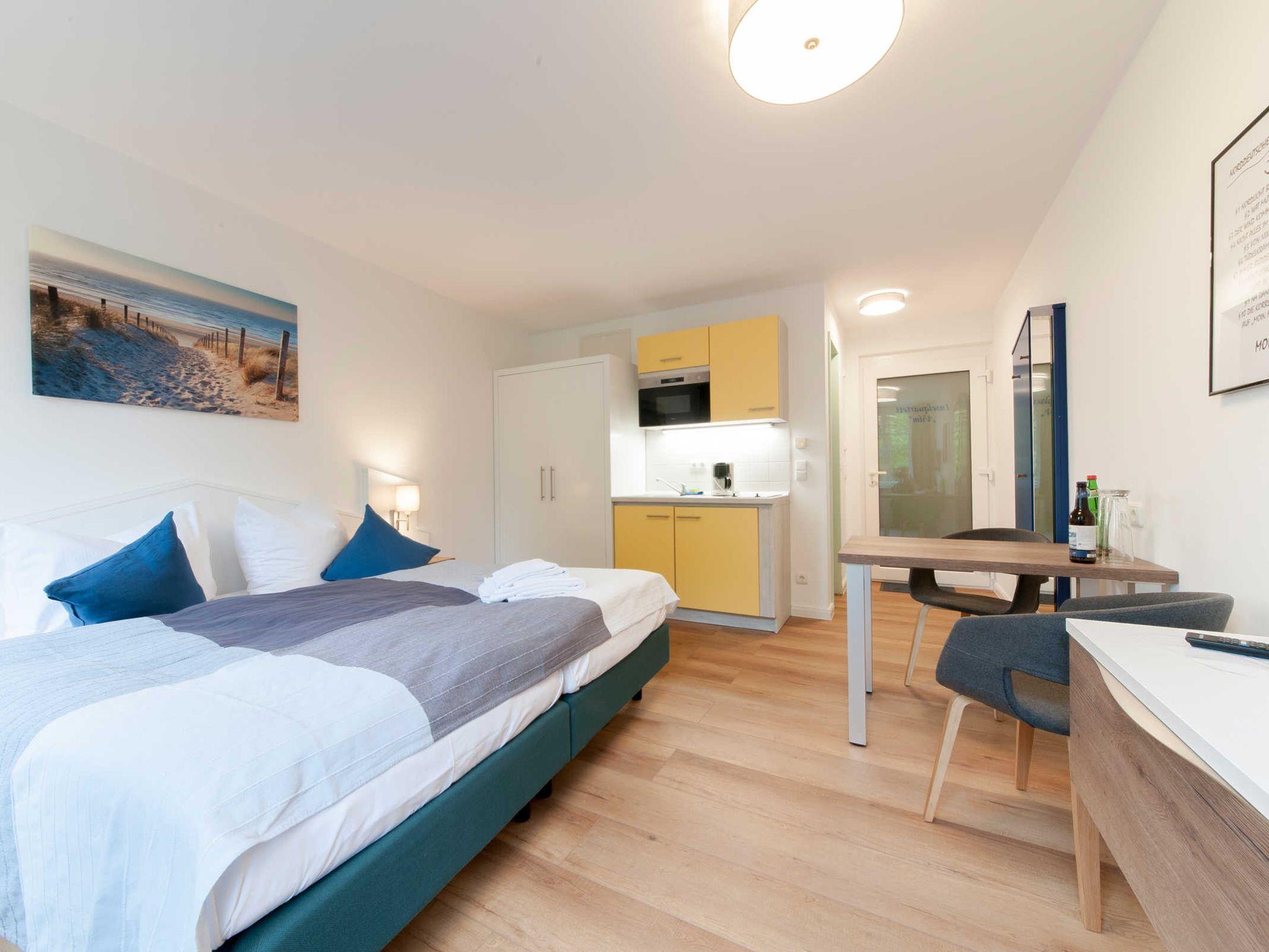 Die Küche verfügt über ein 2-fach Ceranfeld, Mikrowelle oder Backofen, Kühlschrank mit kleiner Gefriermöglichkeit, Kaffeemaschine oder Kaffeepresse, Toaster und Wasserkocher. Das Bad ist mit Dusche ausgestattet. Die Appartements haben selbstverständlich kostenlos WLAN/Internet, ein SMART-TV, sodass Mediatheken/youtube geschaut werden können und mit einer Spielesammlung kann man den Abend gemütlich ausklingen lassen.